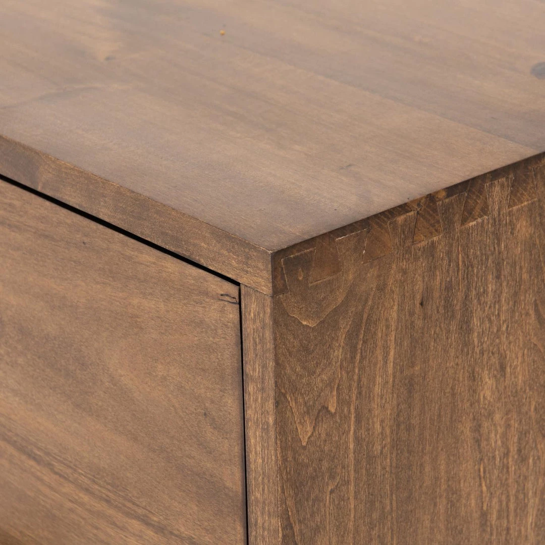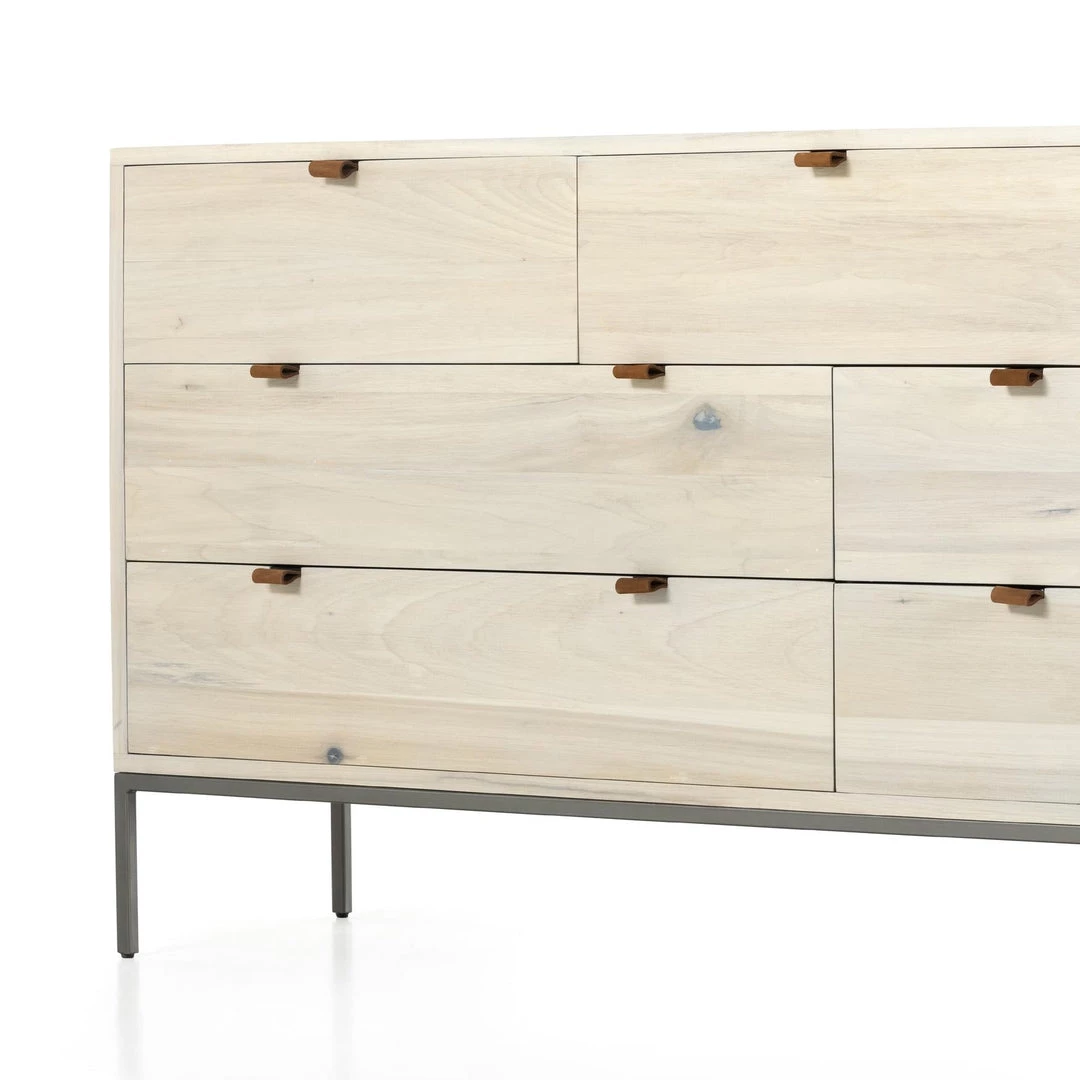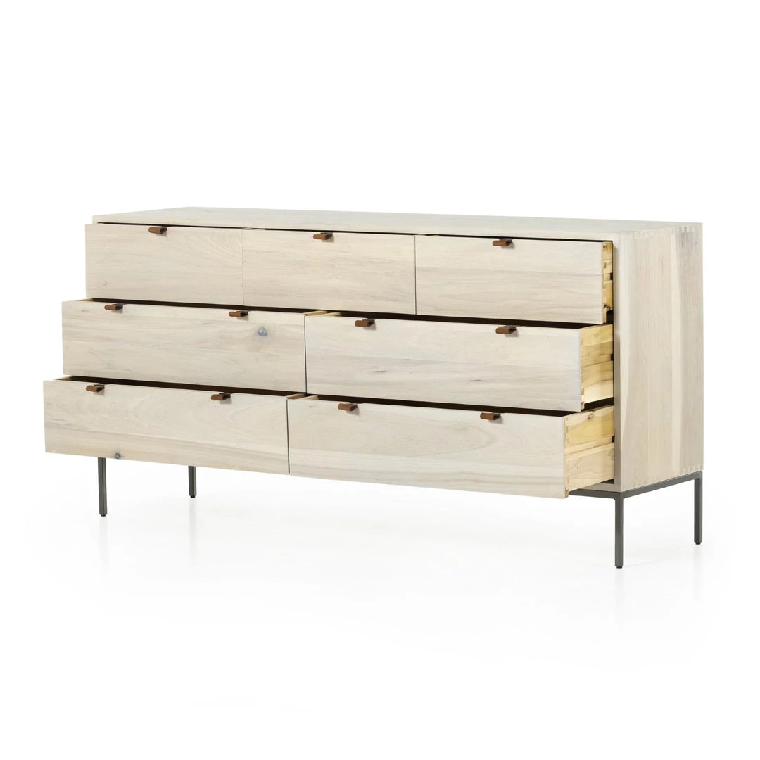 Inspired by clean mid-century design, a stylish dresser of auburn poplar offers plenty of bedroom storage space thanks to seven spacious drawers. Metal-secured leather pulls add a textural element of surprise.