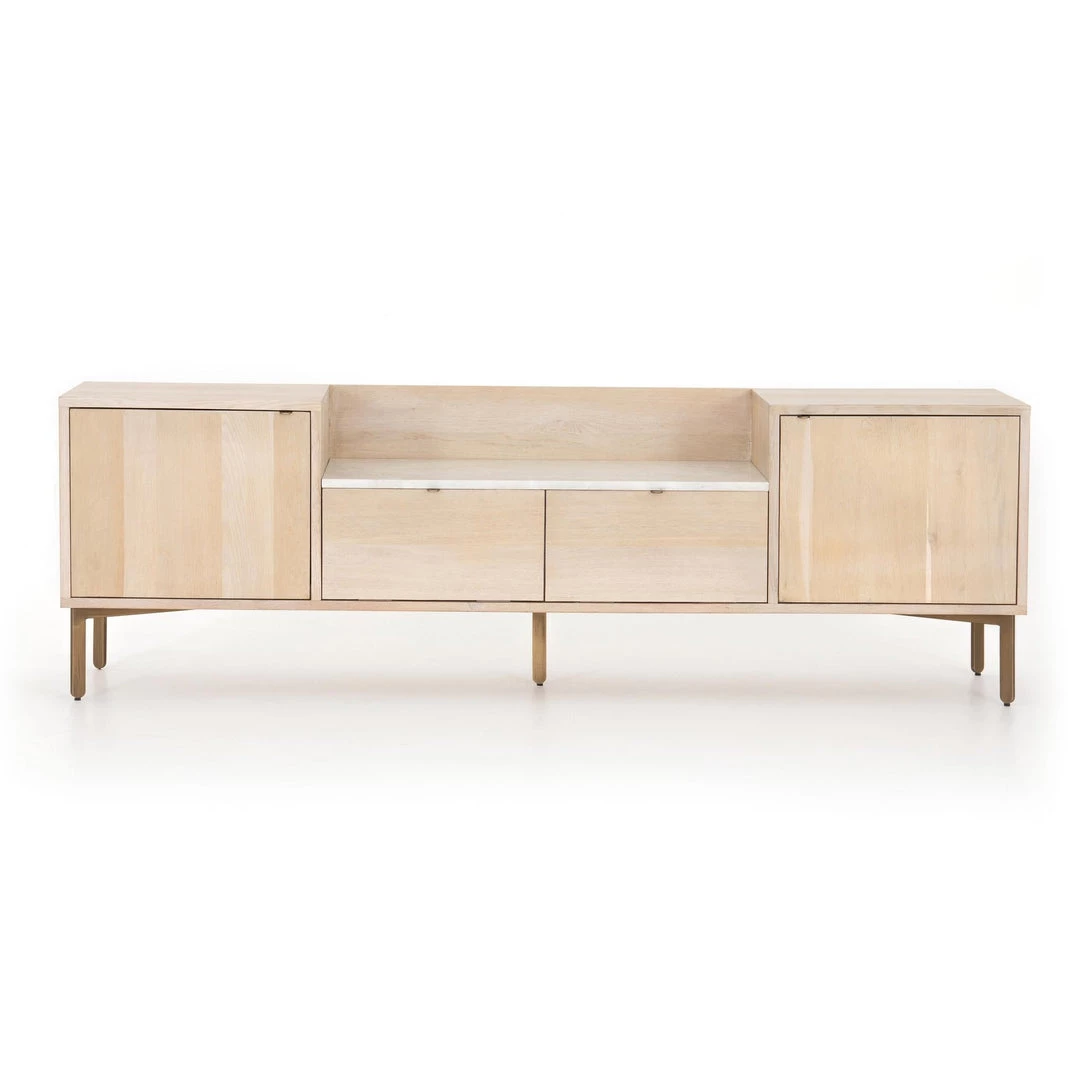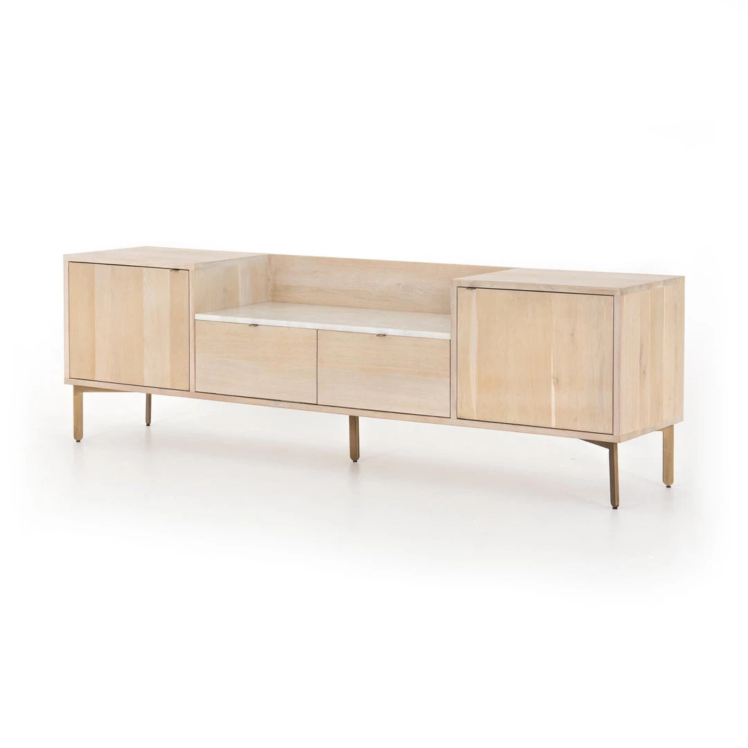 A fresh, feminine take on mid-century styling. A pale-washed mango console features oak door fronts and inset layer of white marble with subtle pink and green veining mixed to beautiful effect. Finished in an antique brass, arched iron legs add a dash of modernity, while drop-down center cubbies plus side cabinets offer ample media storage. Rear cutouts for cord management.