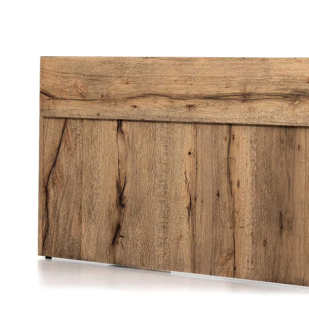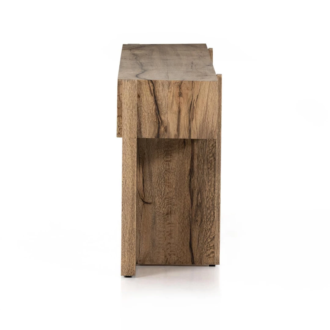 An organic-spirited statement piece. With thick, wide proportions, a rectangular console table of distressed iron tops an intersecting base of rustic, character-rich oak with beautiful highs and lows.