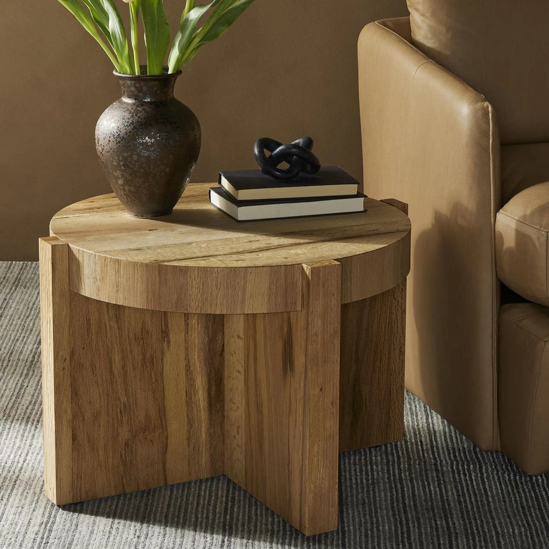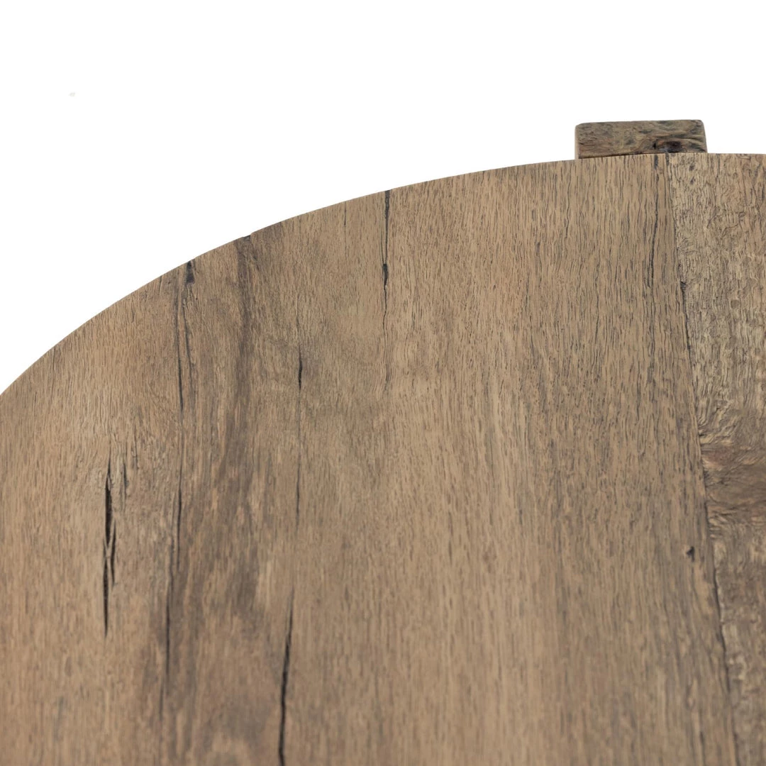 An organic-spirited statement piece. A round tabletop of distressed iron rests within a sculptural cradle base of rustic, character-rich oak with beautiful highs and lows.