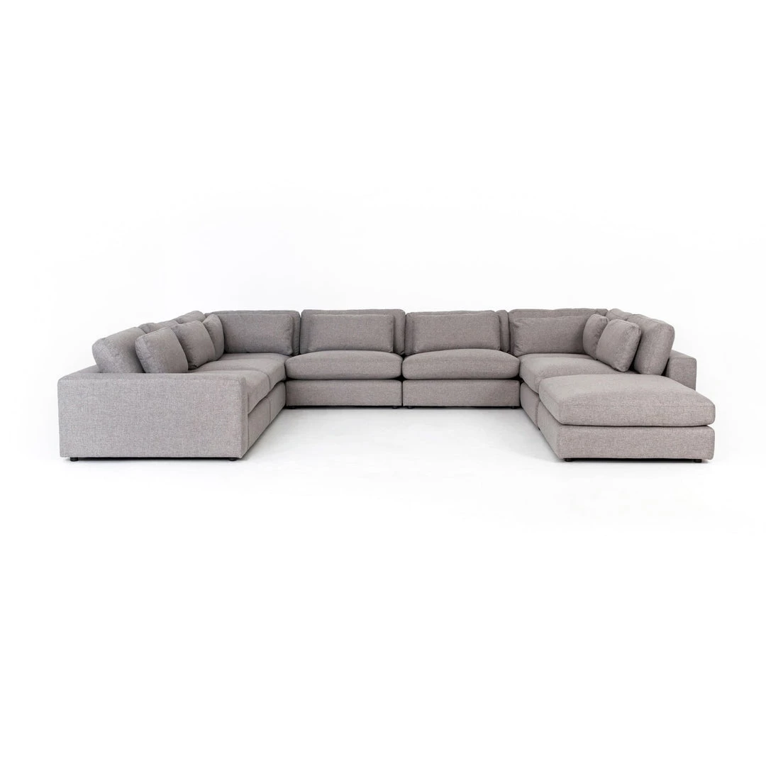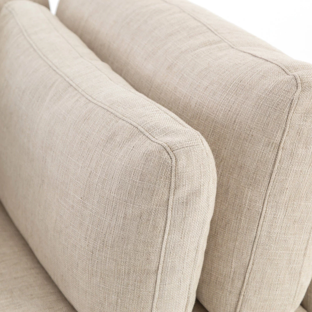 Deep, low seating says relax. An inviting sectional is covered in a soft yet durable neutral woven fabric. Modular components allow the perfect combination for any space.