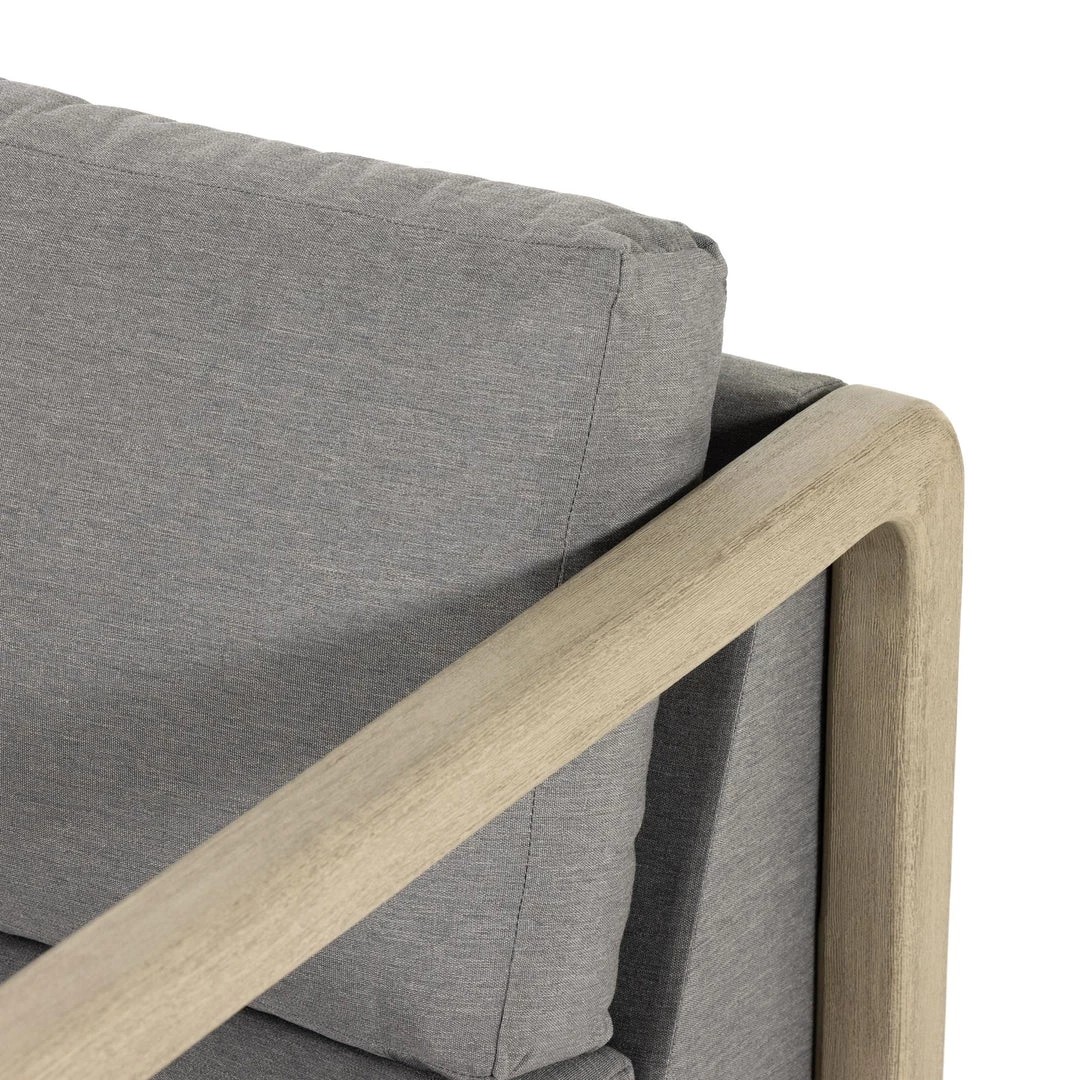 Washed brown teak forms rounded corners for a novel take on open, angular framing. Upholstered in an invitingly neutral sand, this outdoor-friendly seating style layers in with total ease. Cover or store indoors during inclement weather.