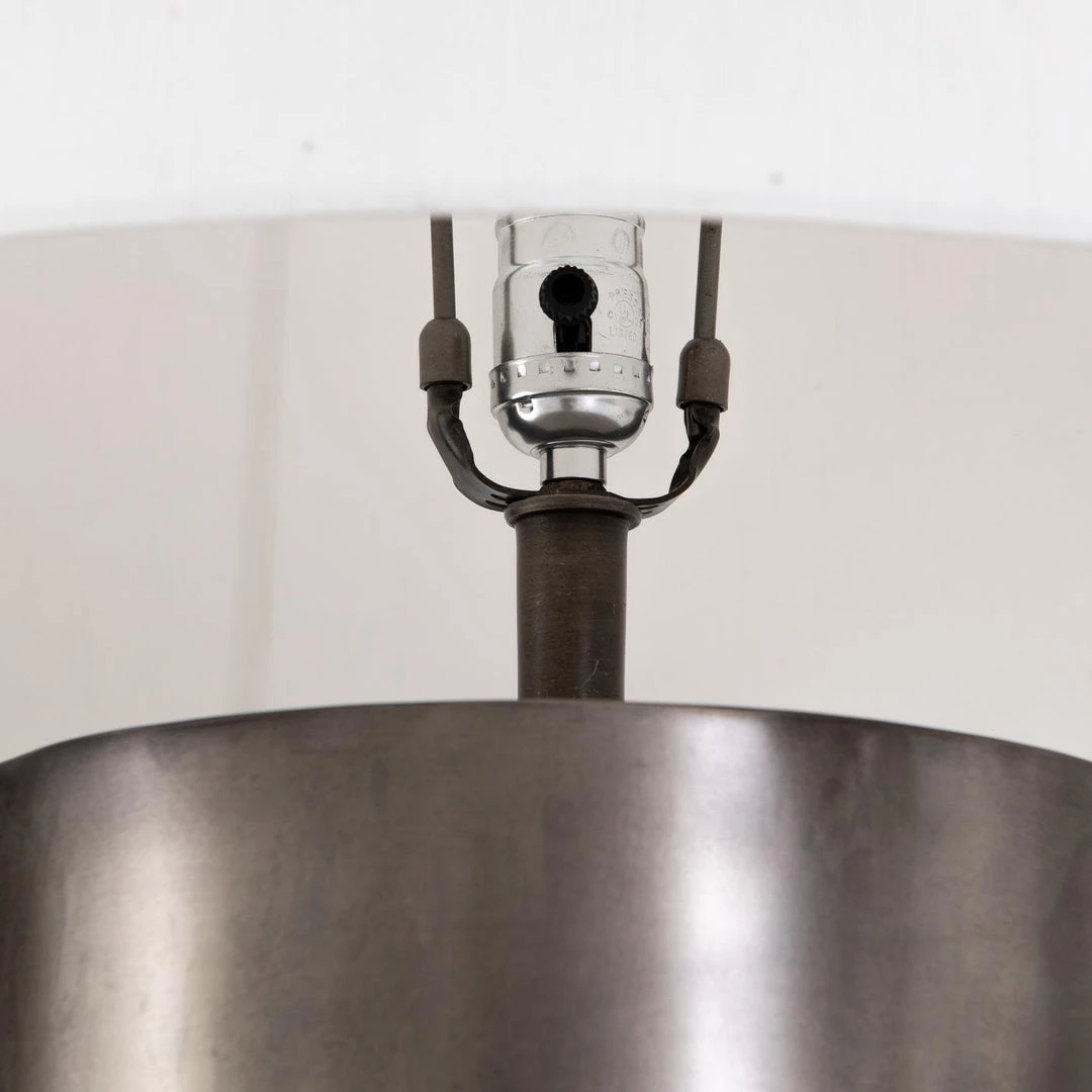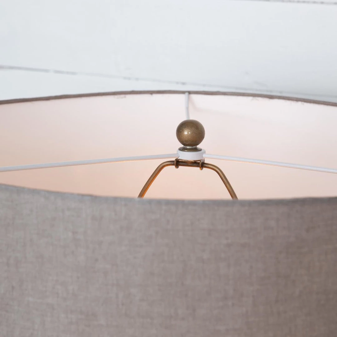 An antique brass finish highlights iron’s gradual blending of hues, delivering a distinctive ombre effect to the cylindrical table lamp. A grey cotton shade plays up this fresh mixing of materials.