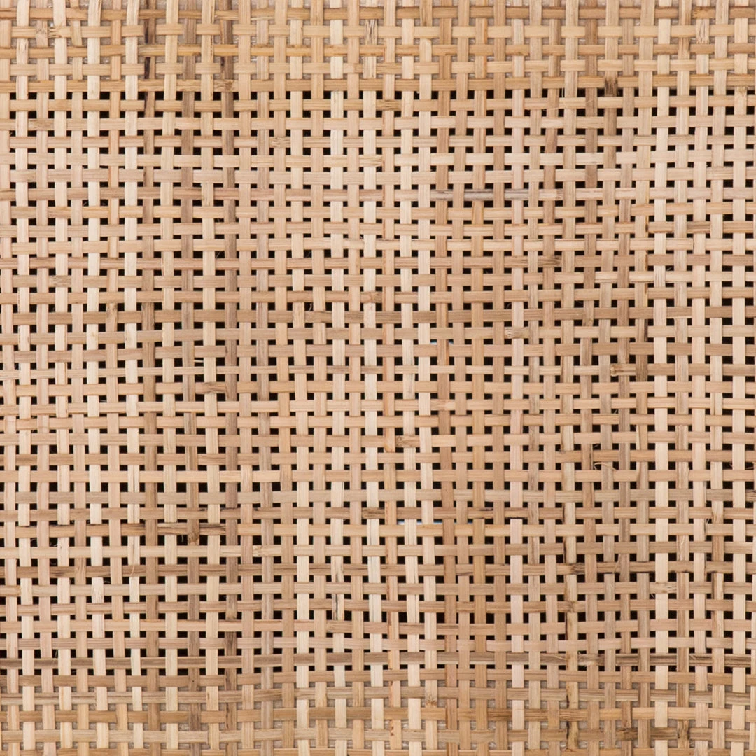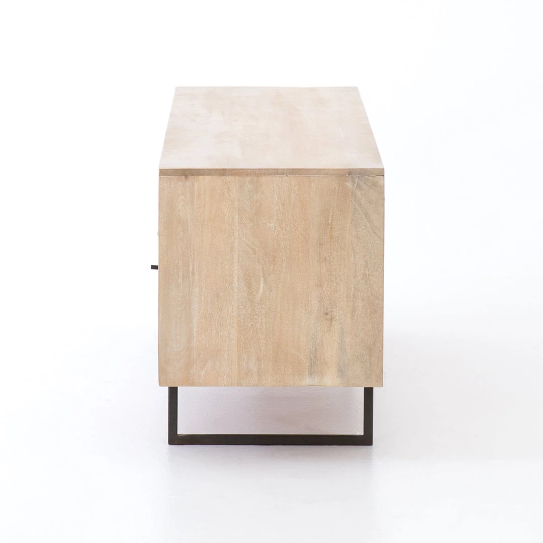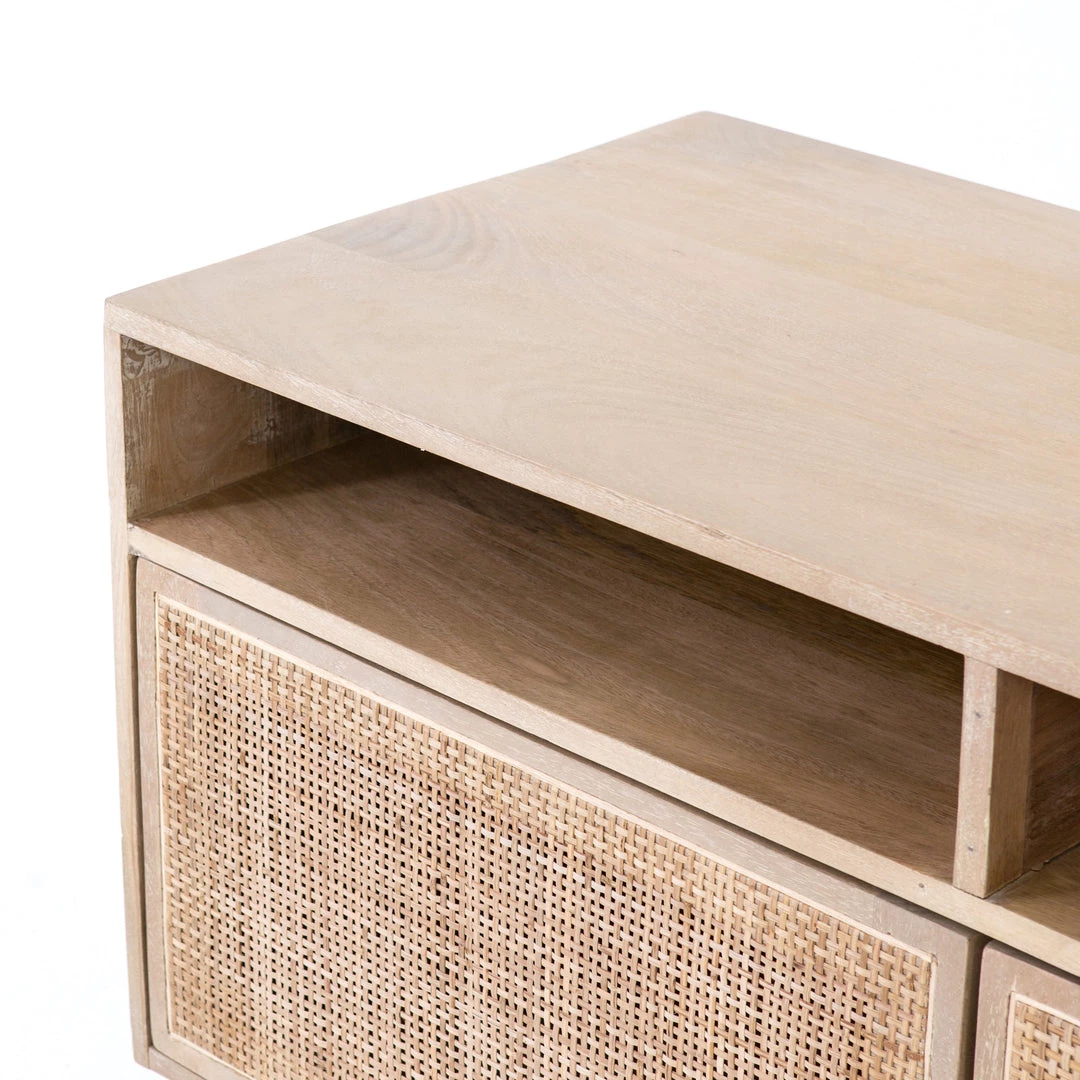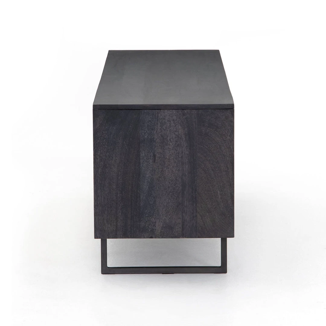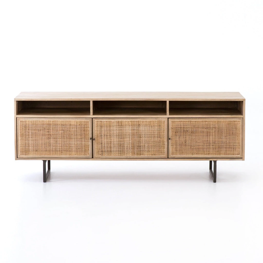Mid-century-inspired style with an organic twist. Surrounded by black mango casing, light cane weaves for a fresh look with natural depth. Angular gunmetal-finished iron legs offer an intriguing contrast of texture and tone. Shelving and posterior cord management for modern media storage.