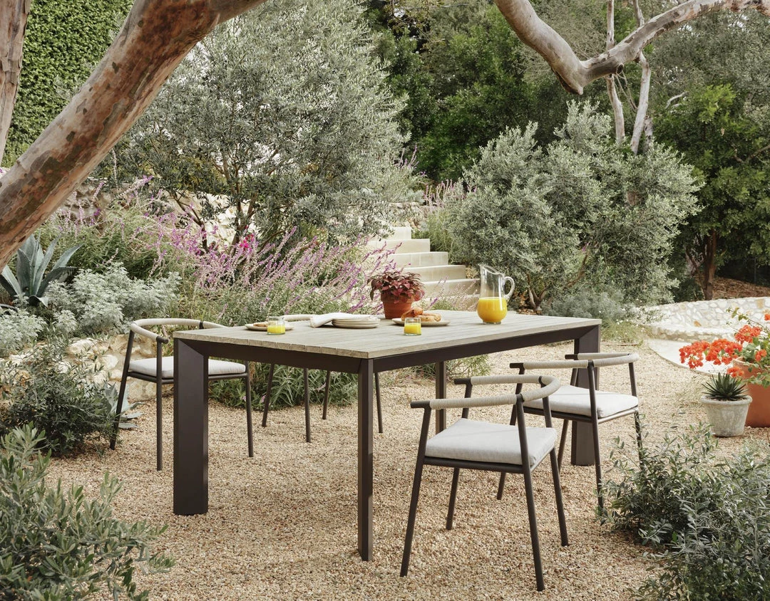 Simple and sleek, with a lightweight look. Slim, bronze-finished aluminum framing features a curved back with rope detailing for a touch of texture. Webbing seat is detachable, for easy cleaning. Store indoors during inclement weather and when not in use.