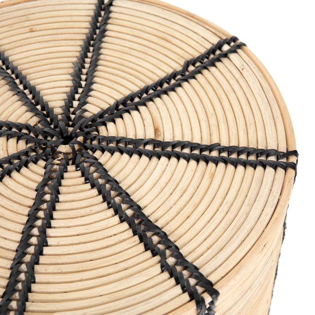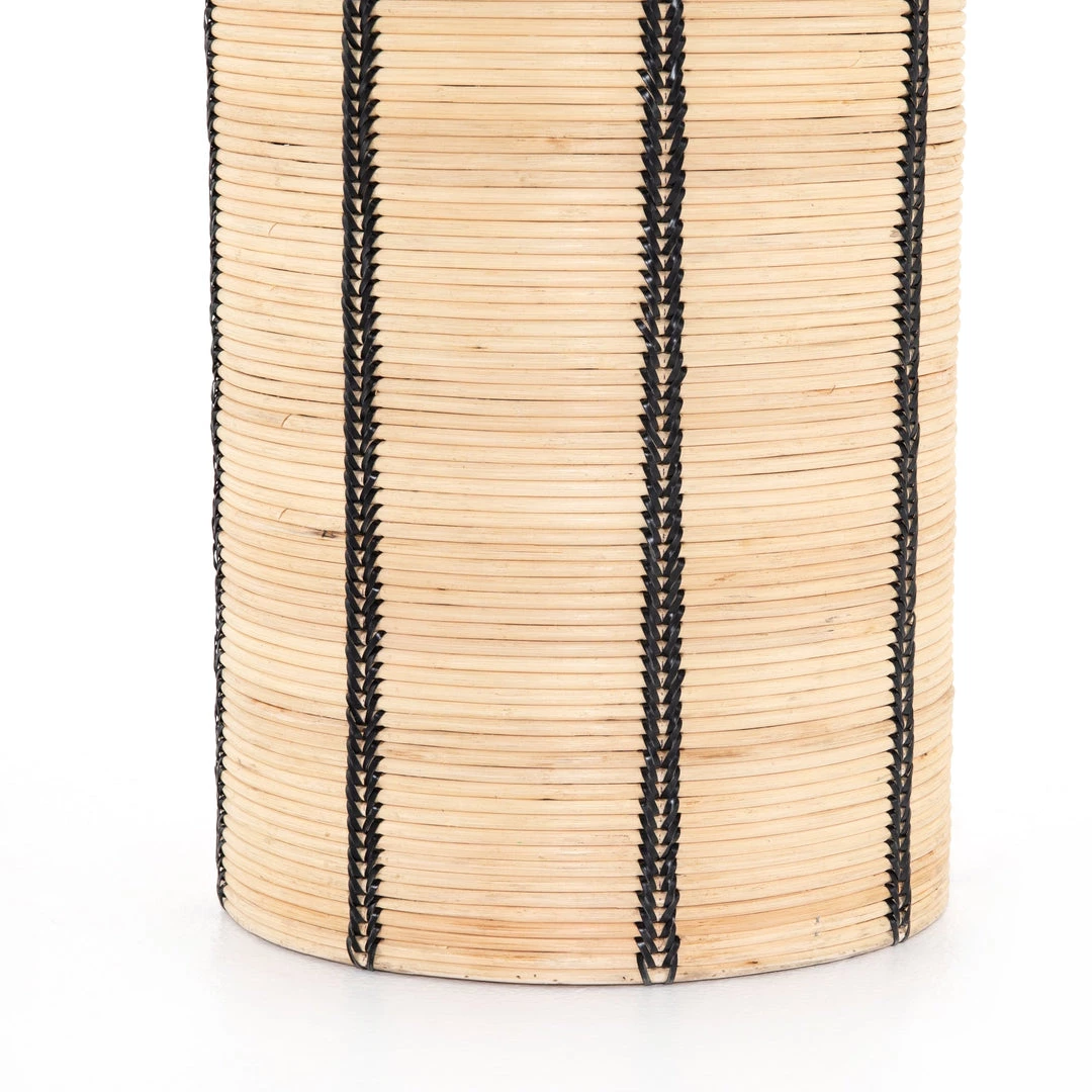 In style, out of sight. A cylinder-shaped hamper of natural rattan features black detailing for beautiful contrast, plus interior lining of 100% cotton.