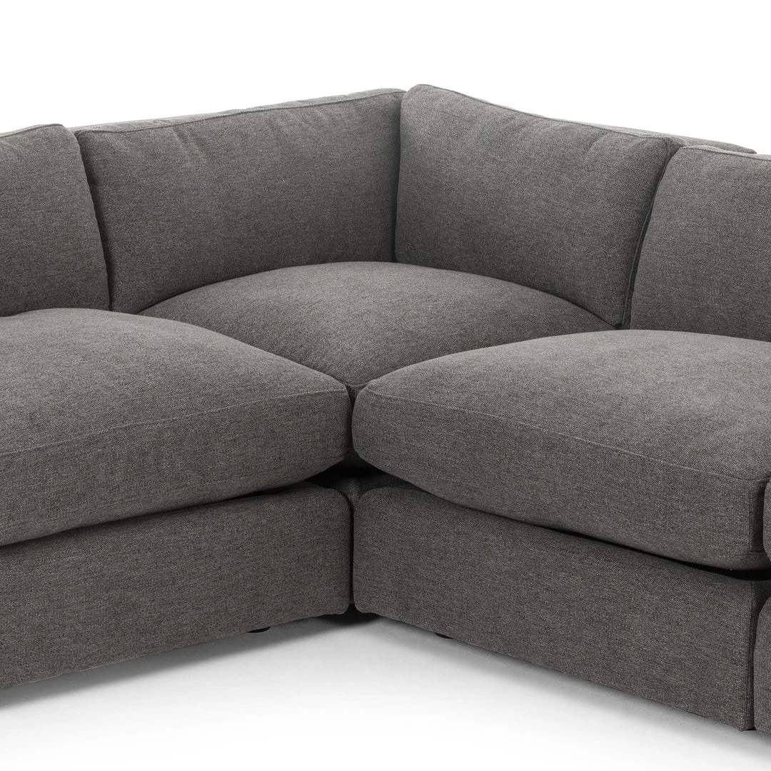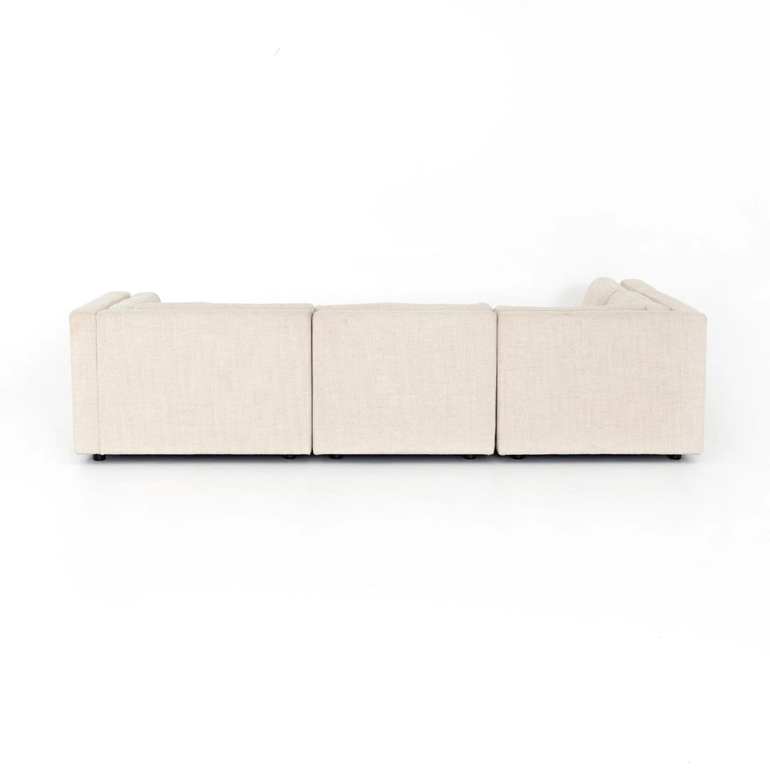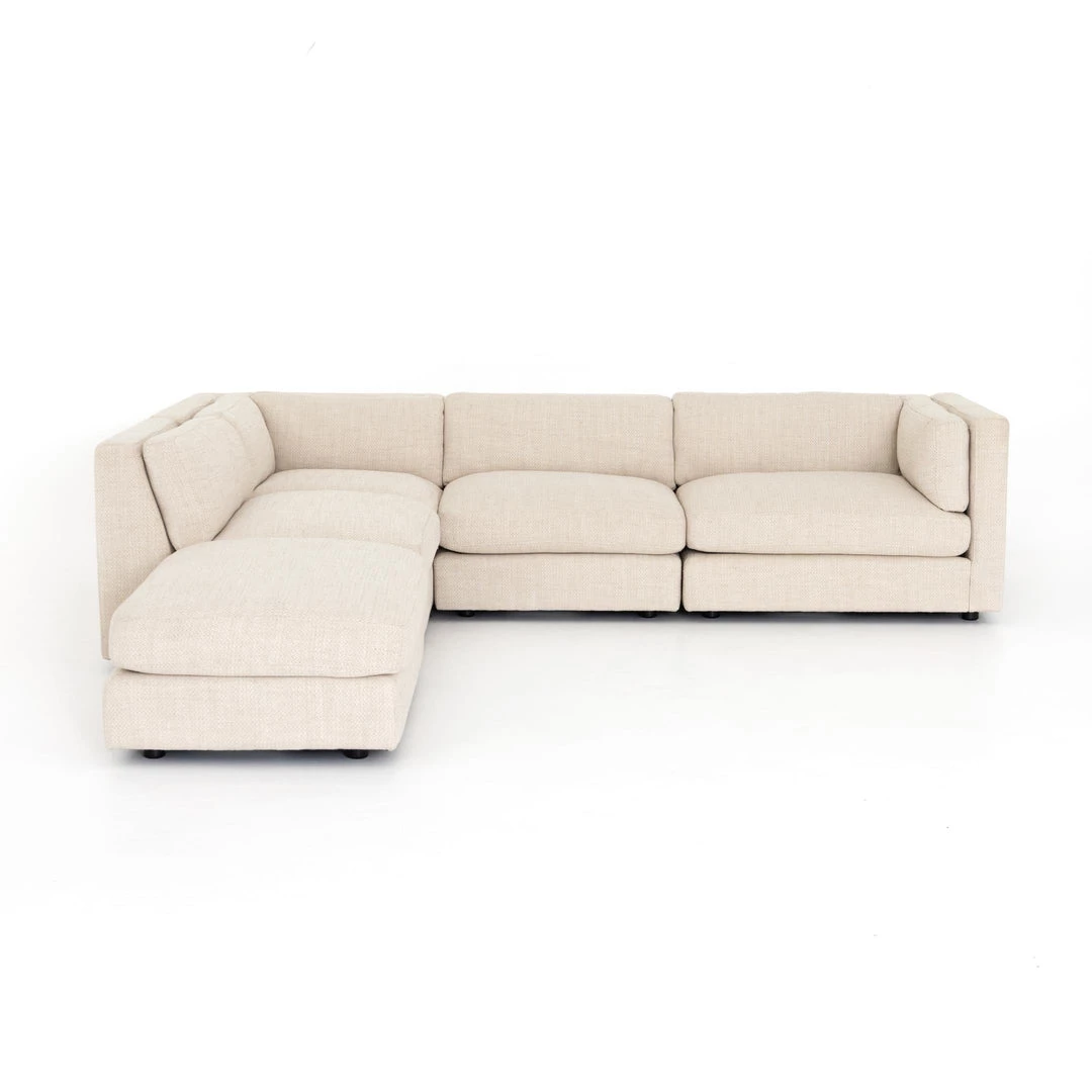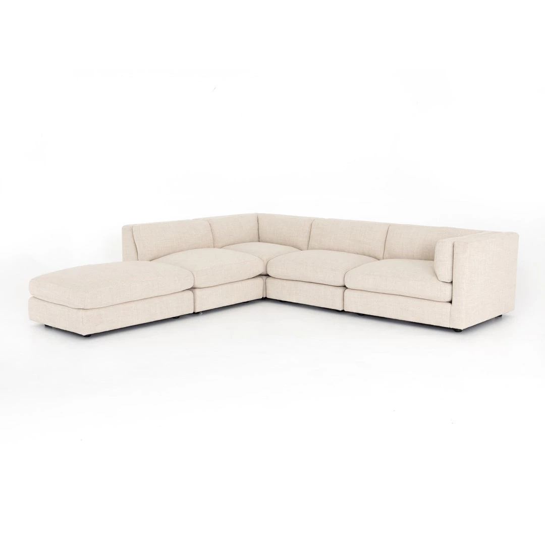 Casual comfort thoughtfully made for modern lounging. Off-white high-performance covering lends a textural touch and invitingly neutral tone to four-piece sectional seating and ottoman, while an angular tuxedo shape spurs a clean look with movement.