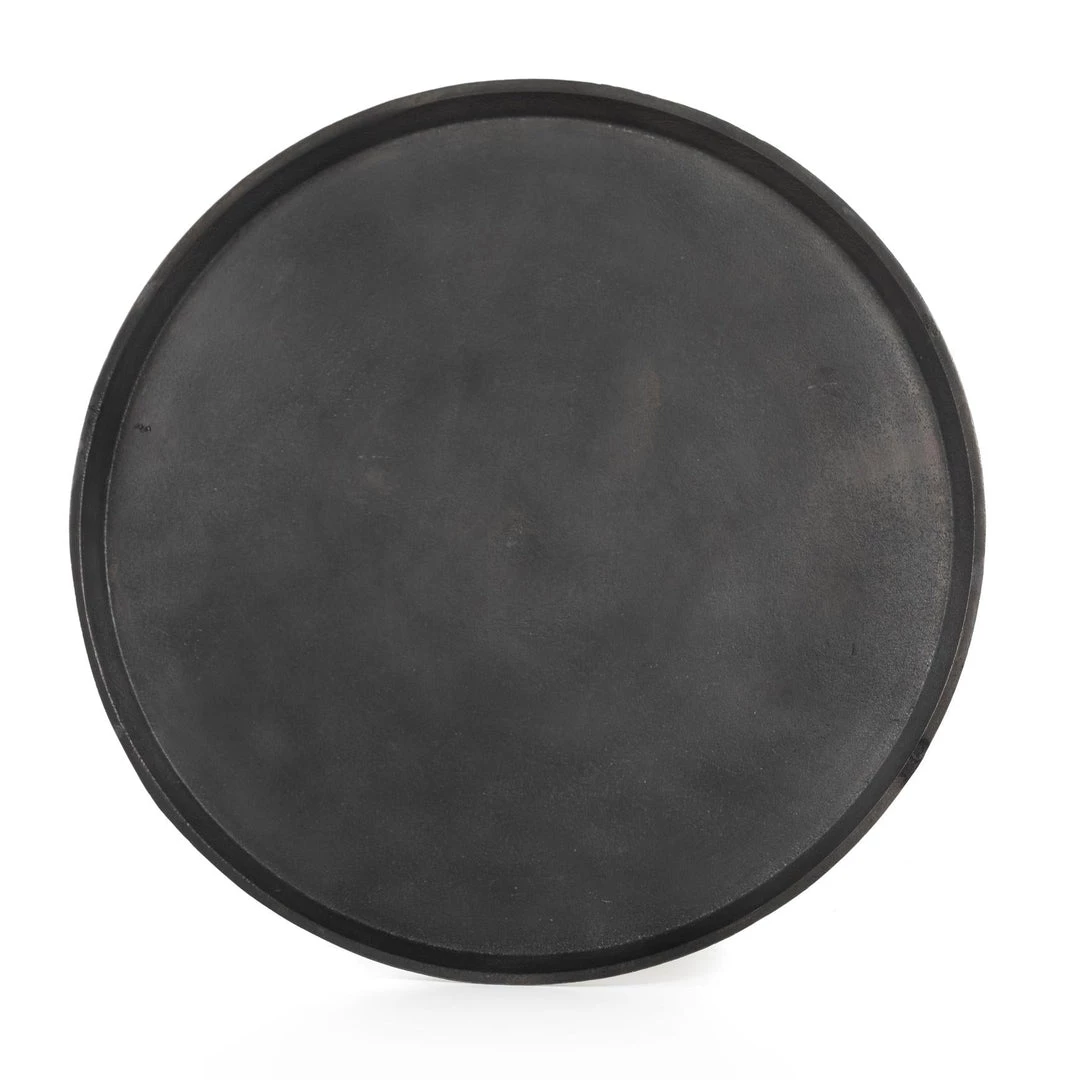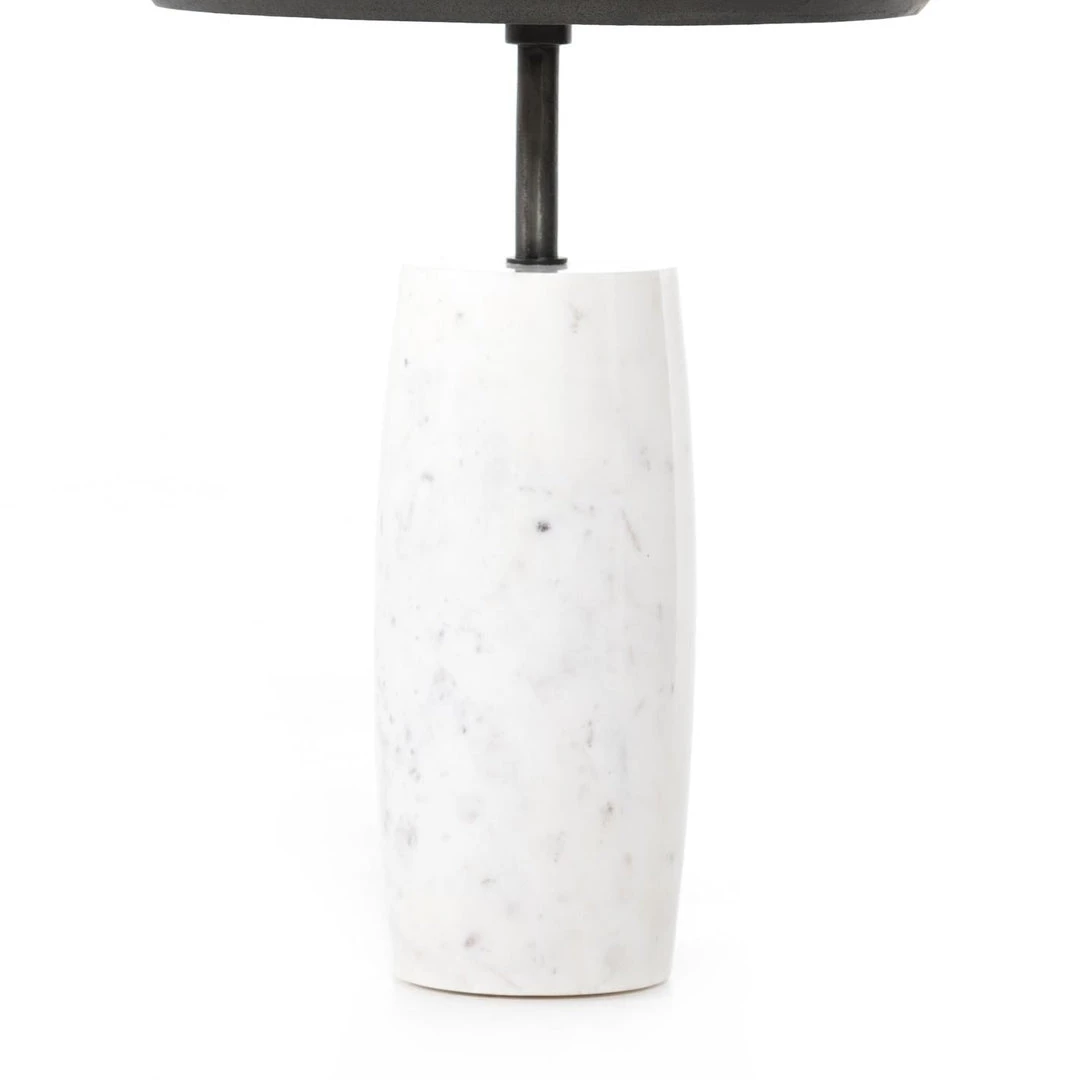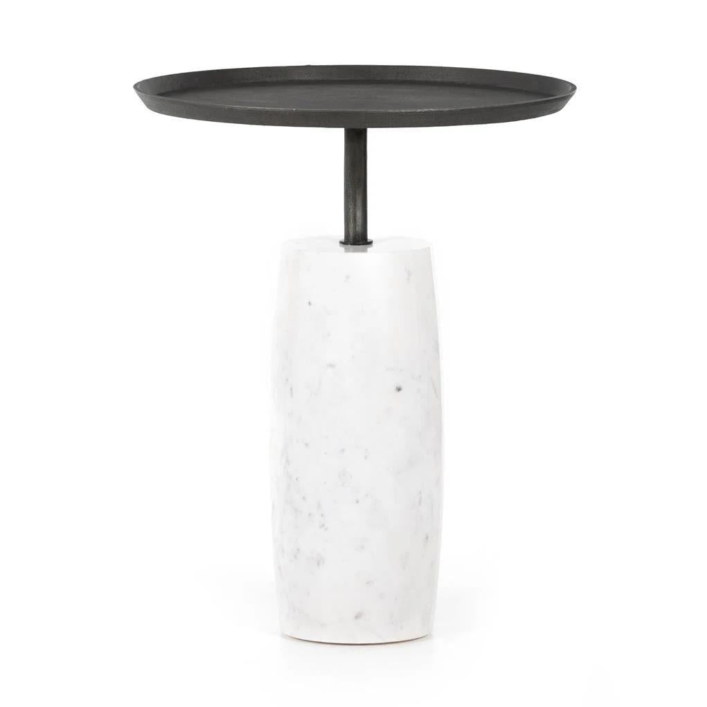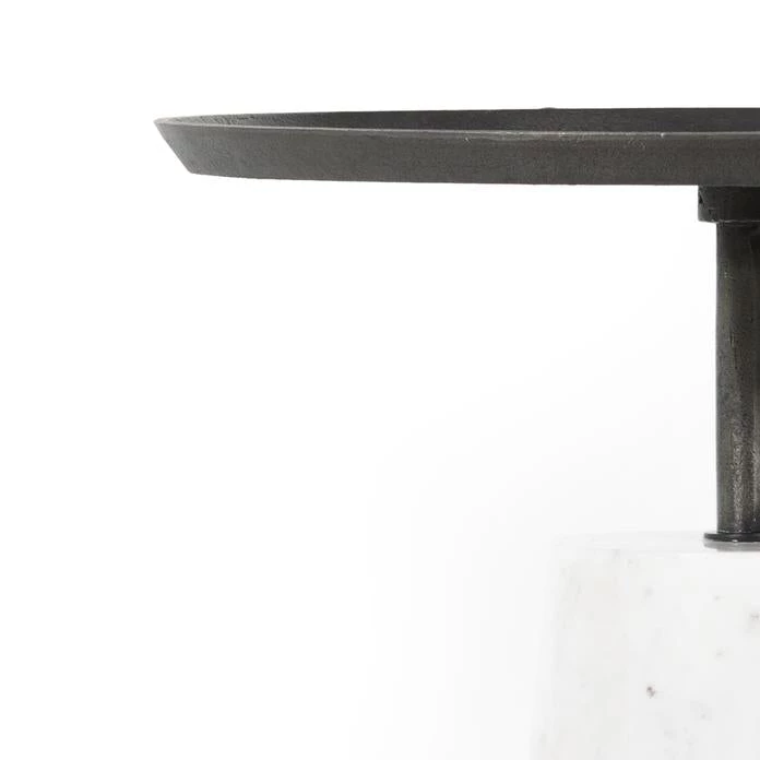 Simply sophisticated. Finished in a polished white, a solid turned marble base supports a tray-style tabletop of grey-hammered iron, spurring beautifully eye-catching contrast.