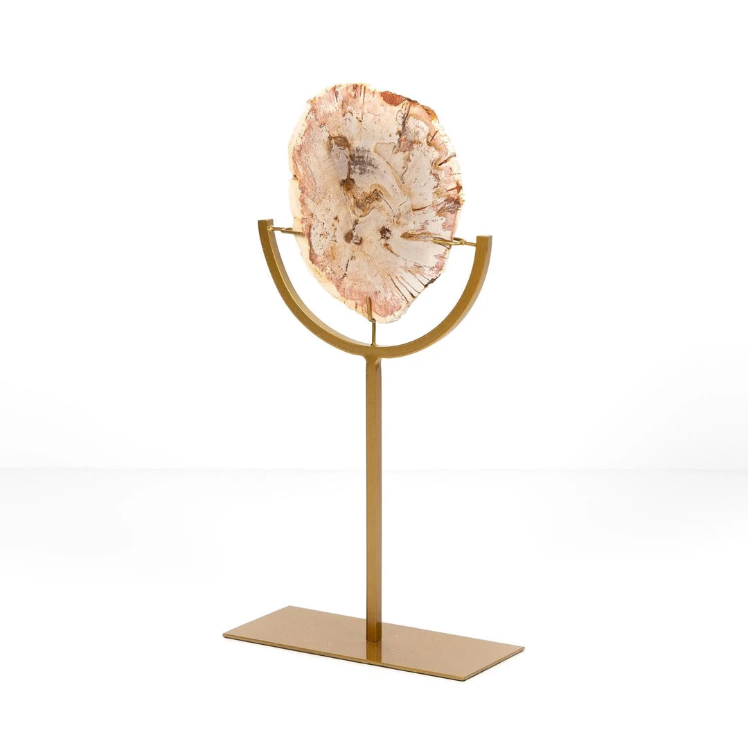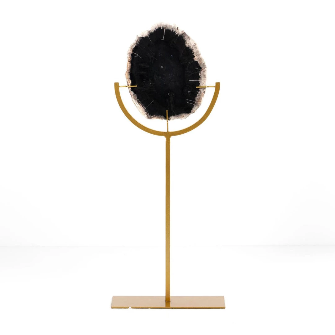Made from brass-finished stainless steel and dark petrified wood, a set of decorative sculptures features live edges for a novel, nature-driven look.