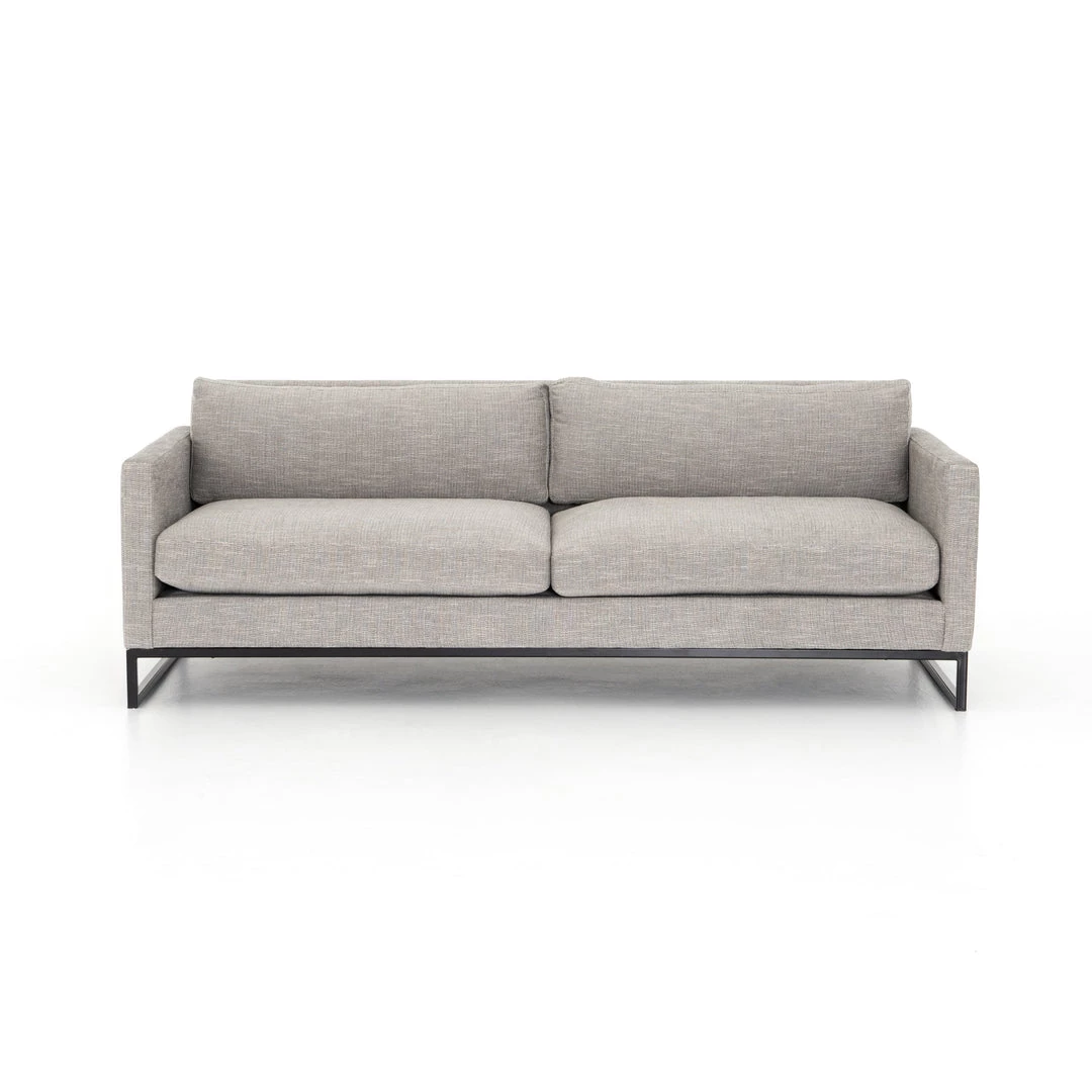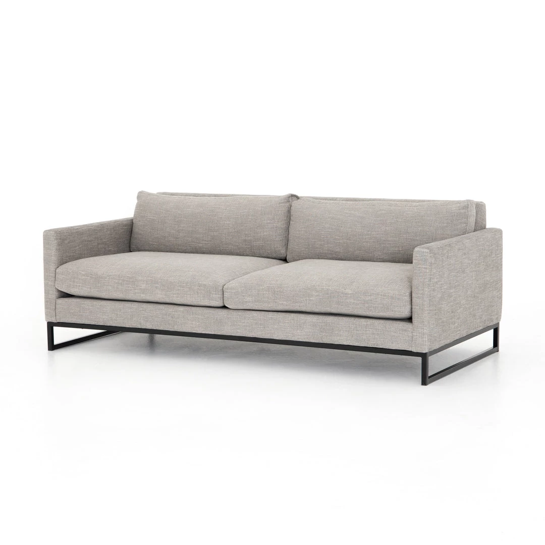 Simple, sculpted style. Two-piece sofa to matching sectional, with light grey performance-grade upholstery, black iron ski base and slim track arm.