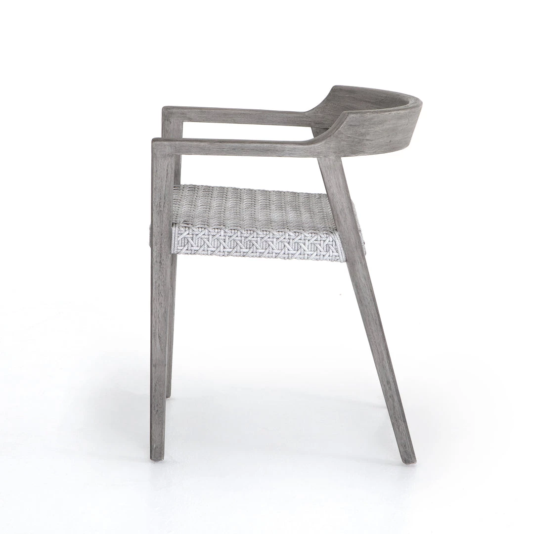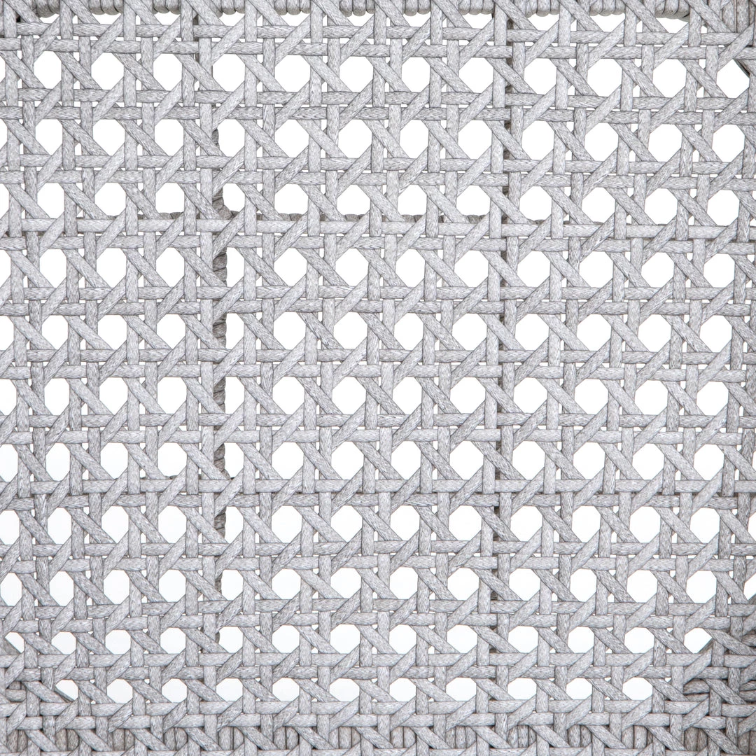 A modern silhouette redefines outdoor styling. Weathered grey-finished teak frames textural cane seating, brining a sleekly monochromatic look to al fresco dining. Cover or store indoors during inclement weather and when not in use.