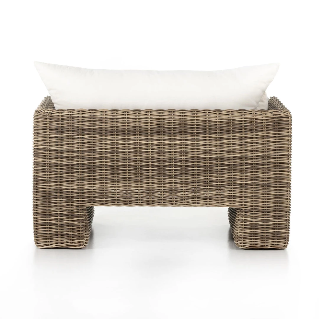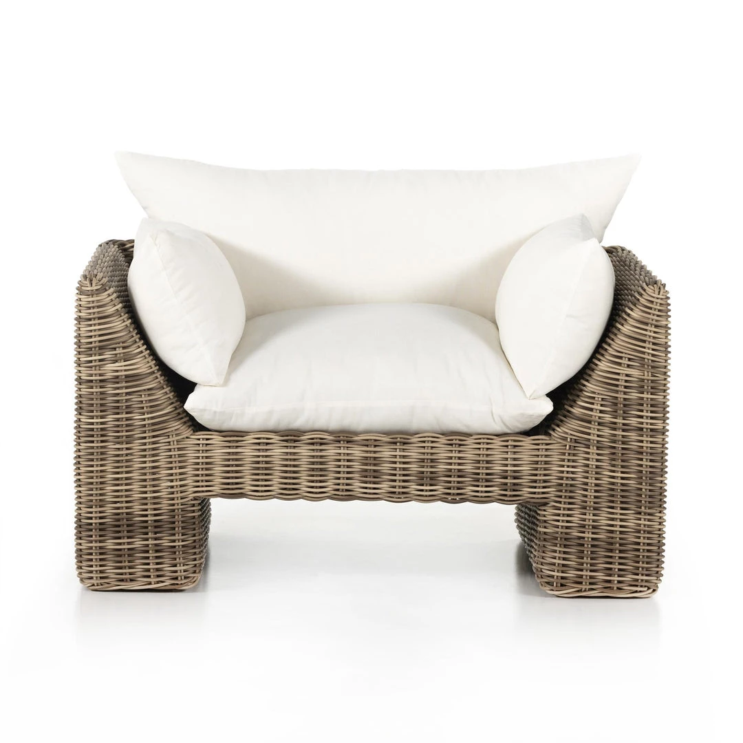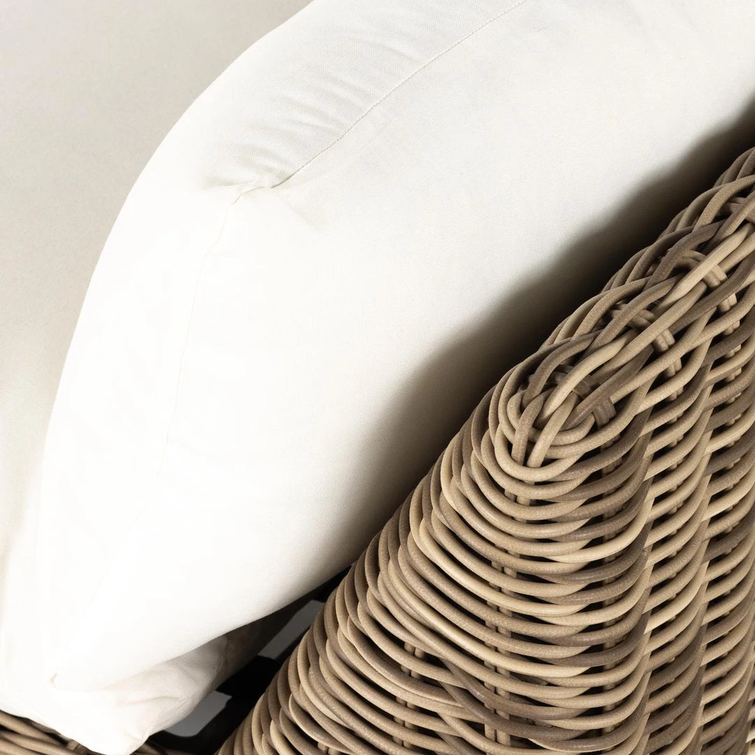 Comfort and durability meet for the best of both worlds. Woven all-weather wicker, with highs and lows throughout for added depth, forms an overscale frame for plush knife-edge seat cushioning and arm pillows covered in UV-resistant, water-repellent, quick-drying Olefin. Cover or store indoors during inclement weather and when not in use.