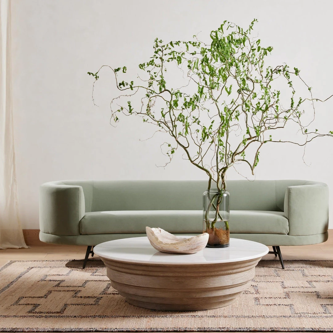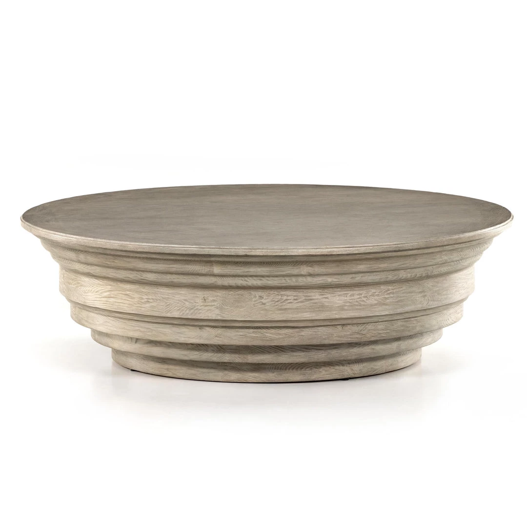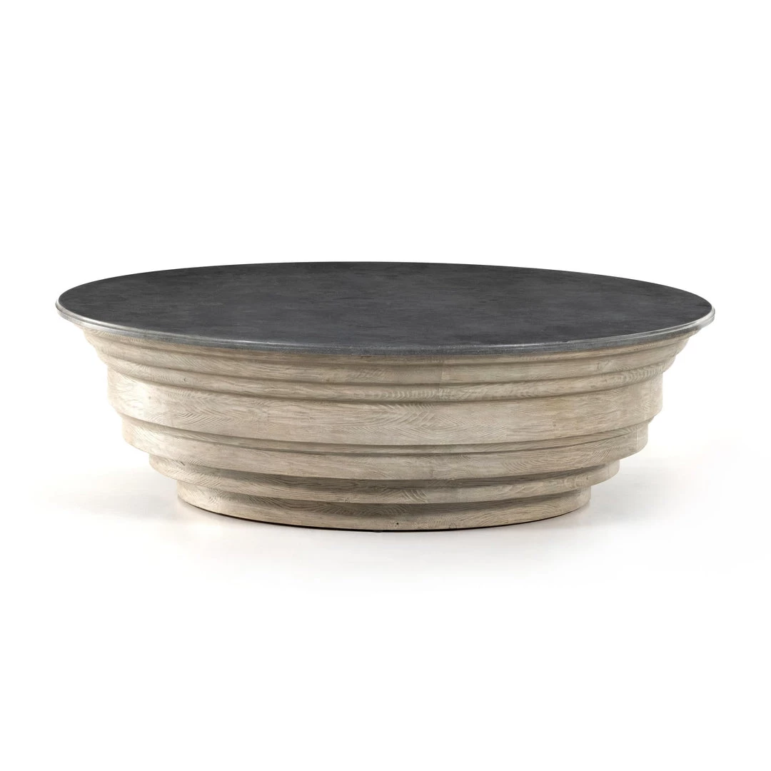 Simply sophisticated. Drum-style shaping lends a sculptural look to a mixed material coffee table. A solid blonde-finished pine base is weathered for texture, with a bluestone top working some classy contrast into the mix.