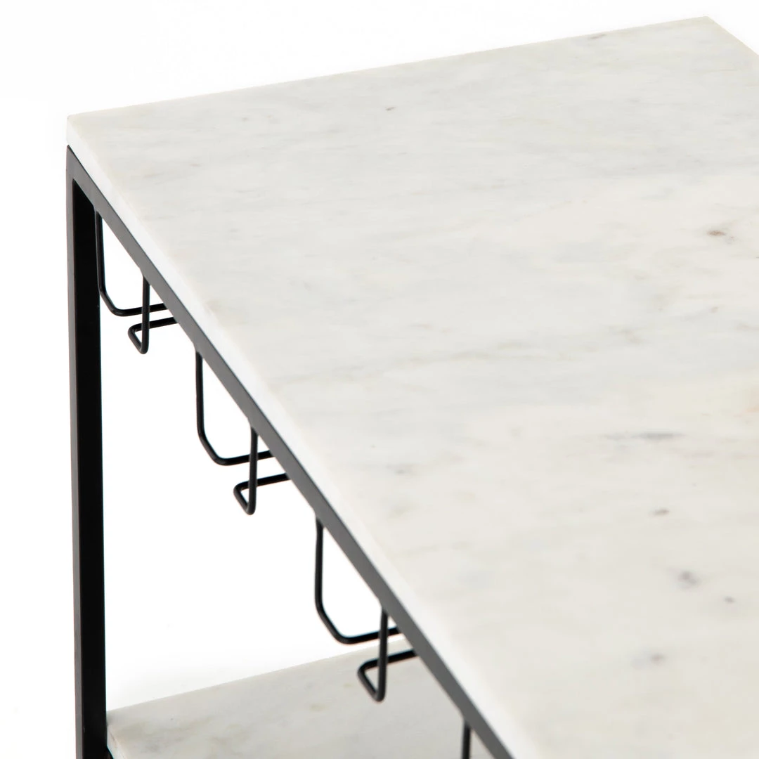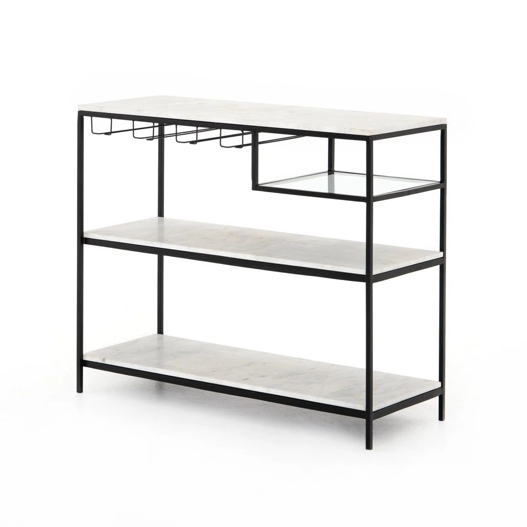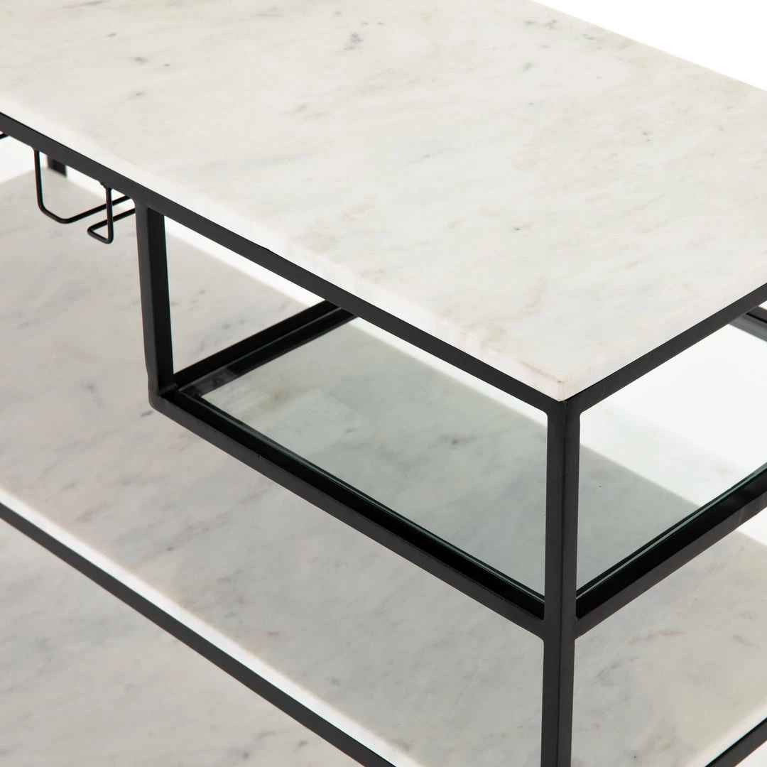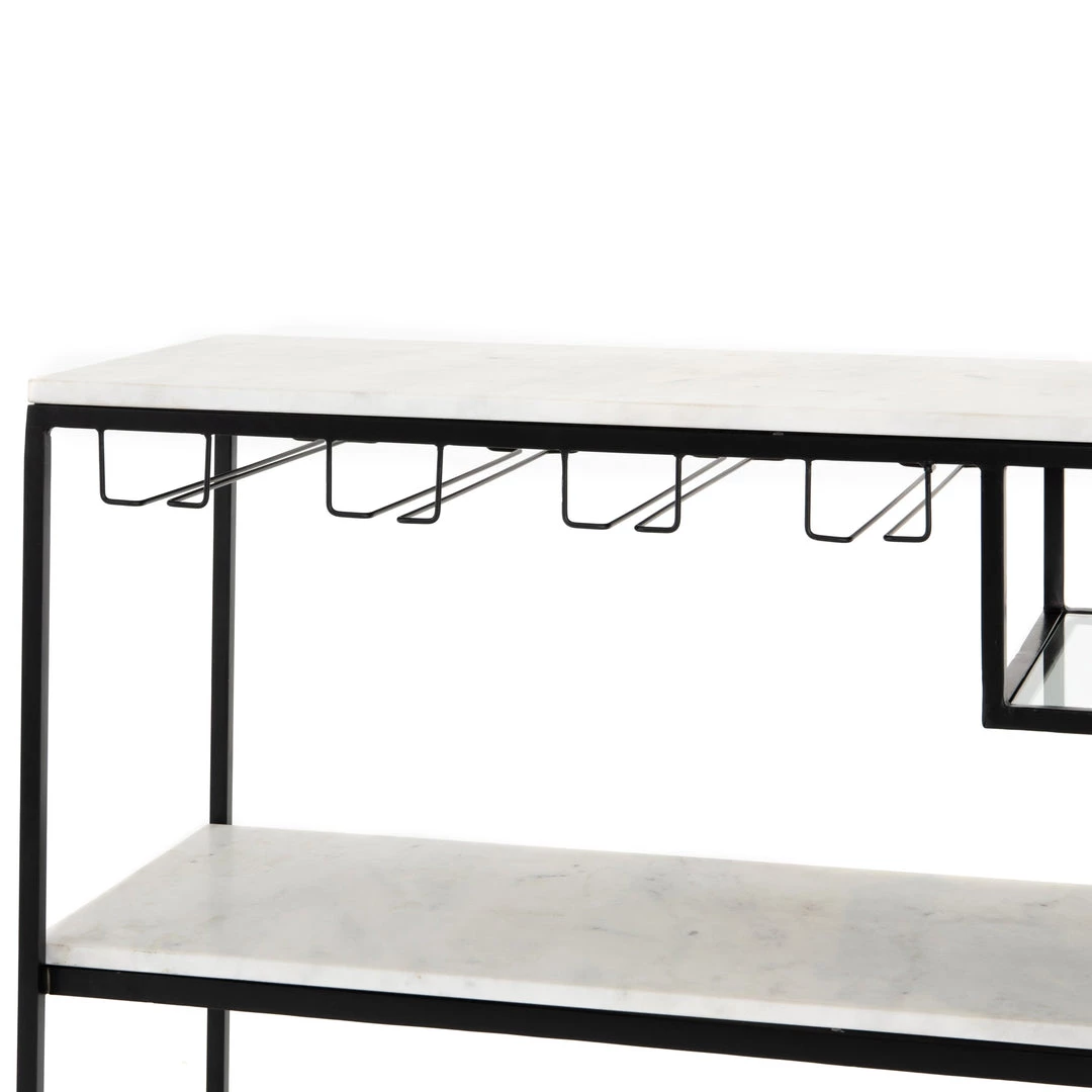 Bring a sense of sophistication to bar storage. Tiers of polished white marble are framed by black iron, with a floating glass shelf and hanging racks for stemware.