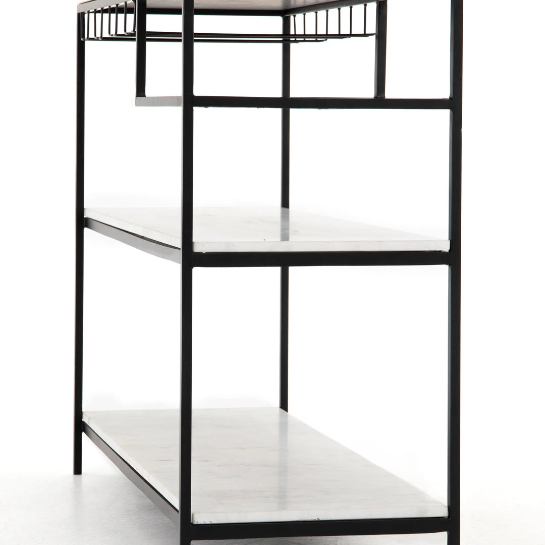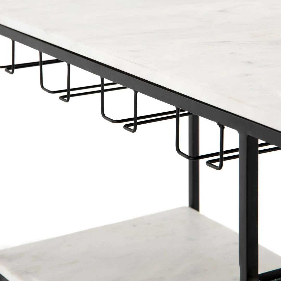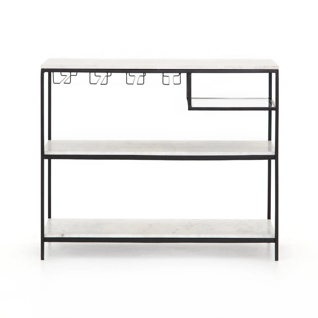 Bring a sense of sophistication to bar storage. Tiers of polished white marble are framed by black iron, with a floating glass shelf and hanging racks for stemware.