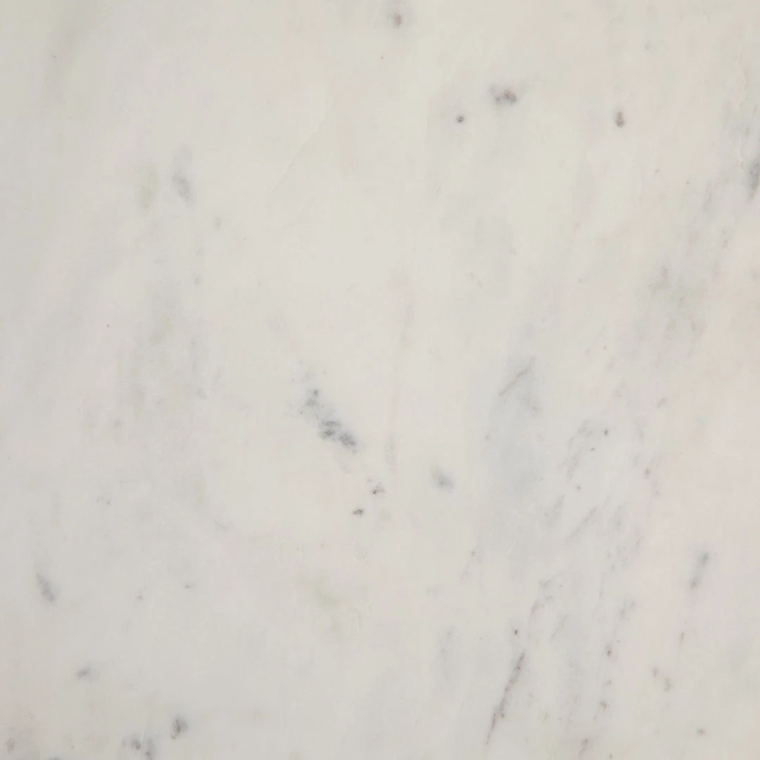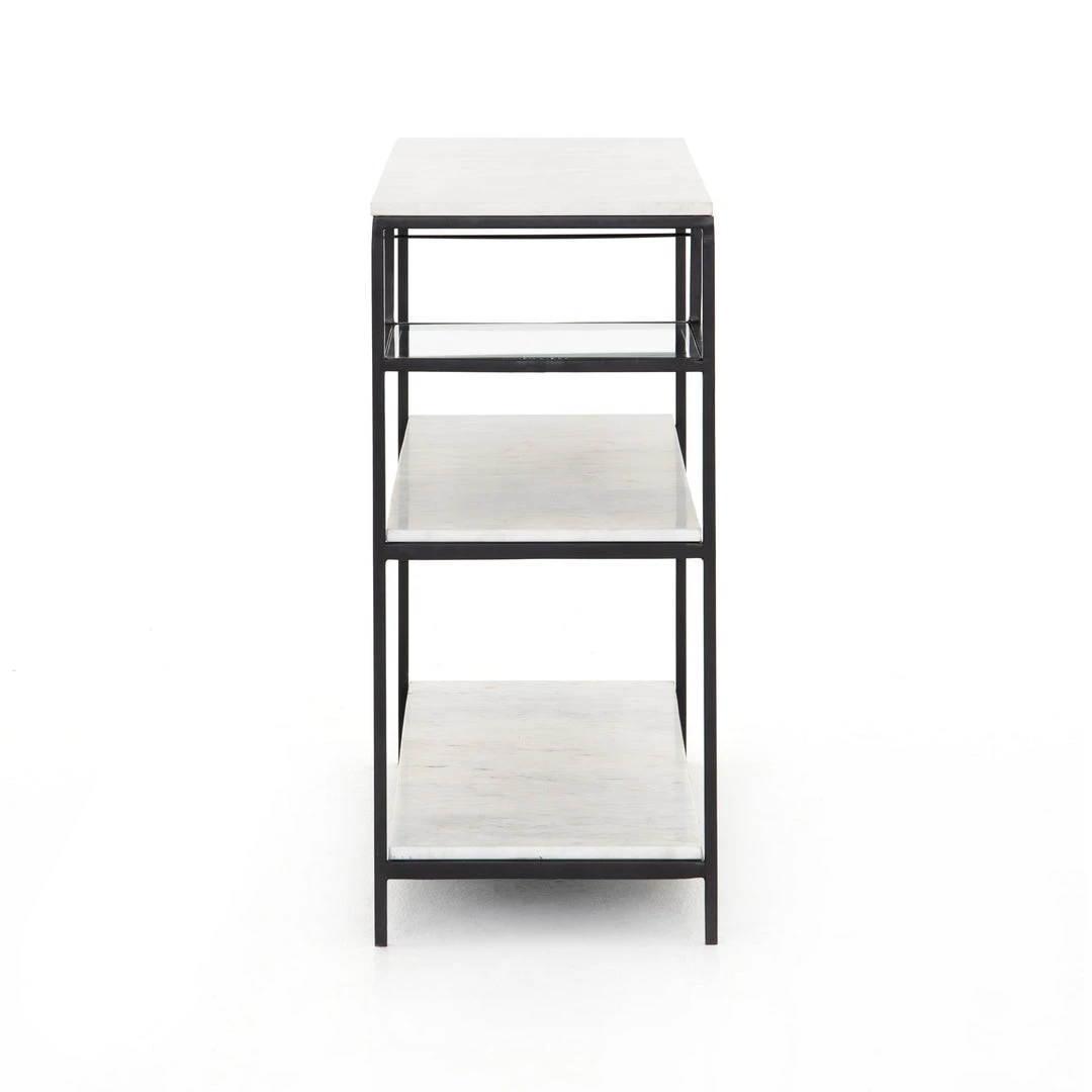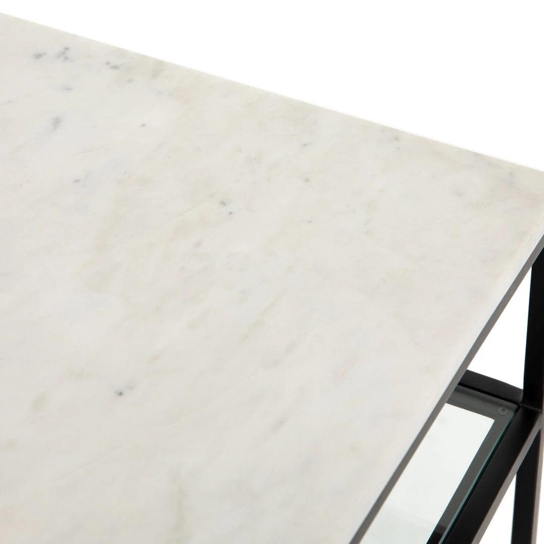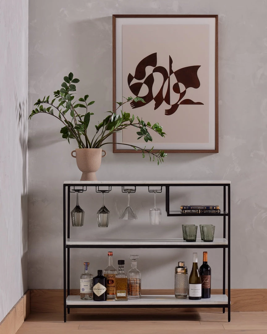 Bring a sense of sophistication to bar storage. Tiers of polished white marble are framed by black iron, with a floating glass shelf and hanging racks for stemware.
