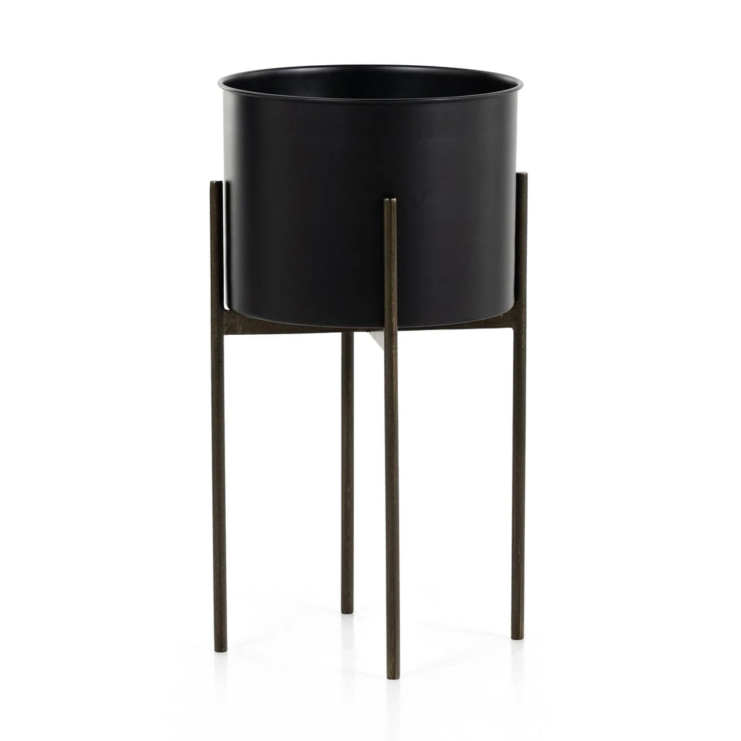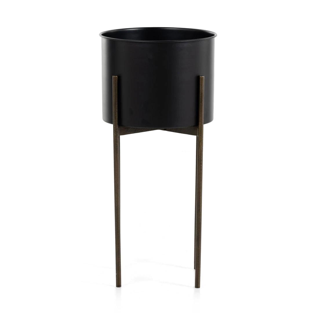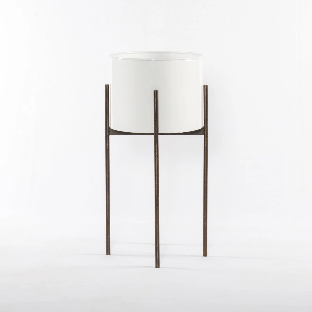 Sophisticated edge. Slim legs of weathered brass-finished iron support an inset planter of glossy white iron. Plastic plant liner recommended (not included). Great indoors or out. Cover or store indoors during inclement weather and when not in use.