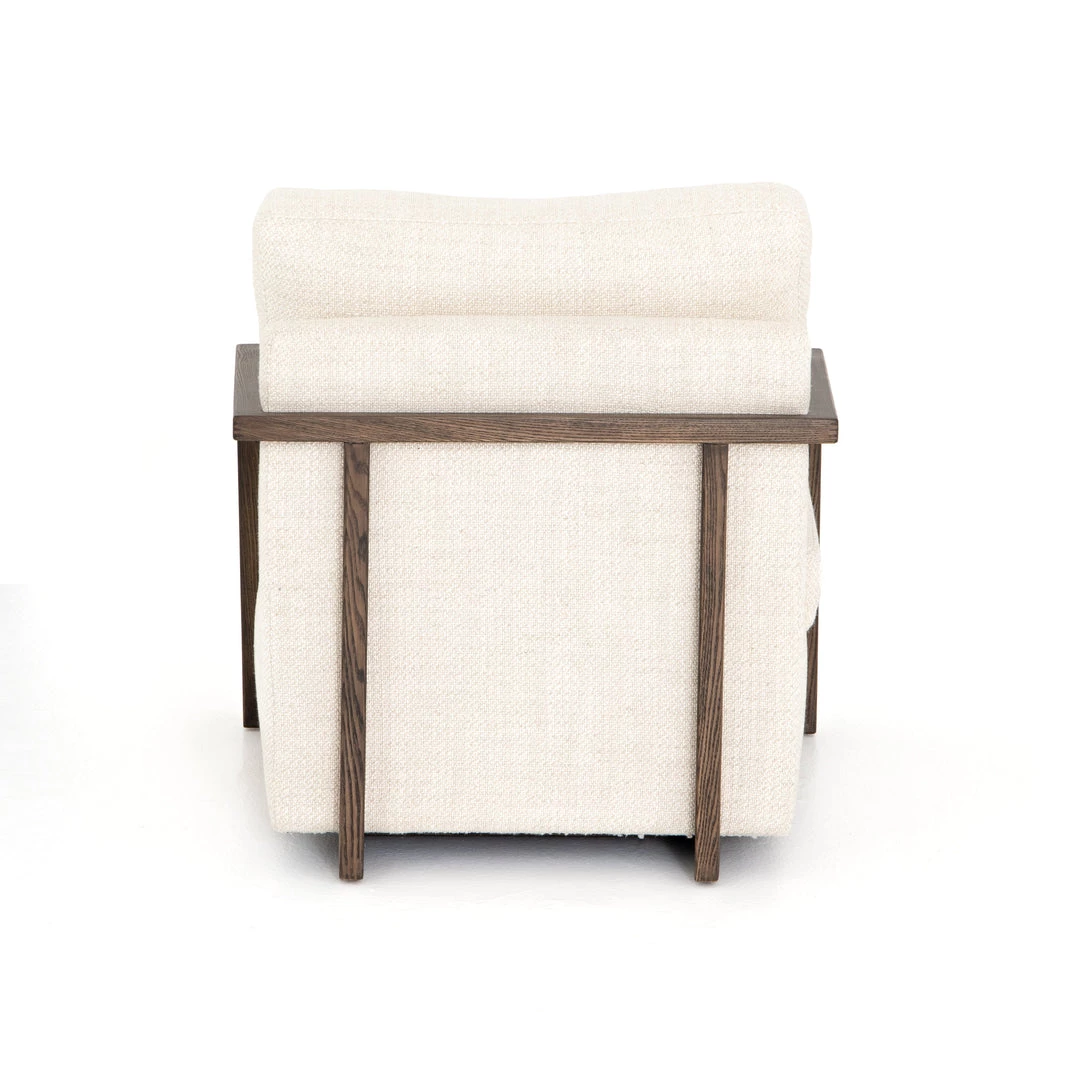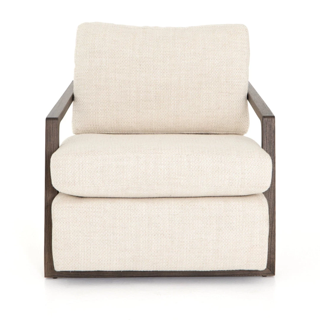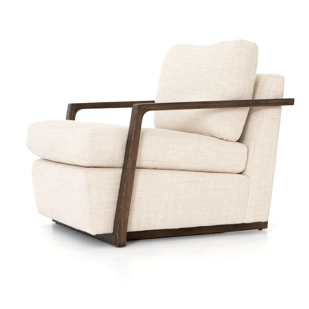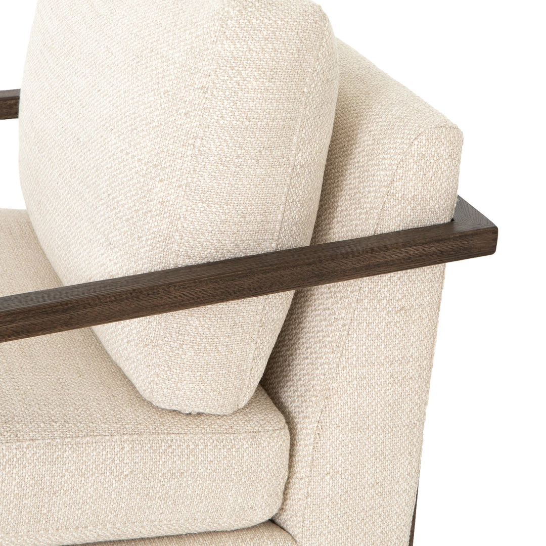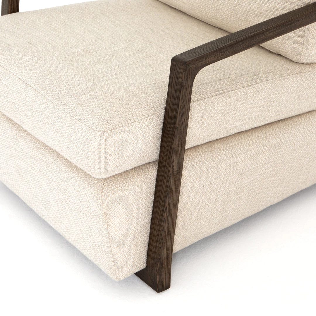 Slim brown oak framing wraps the silhouette of casual yet sophisticated performance-grade seating, perfectly durable for daily lounging.