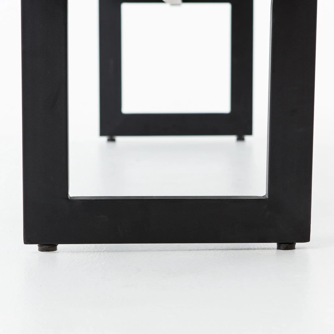 A spacious, black-finished iron base supports rectangular seating of black lava stone, for a long, clean look with industrial appeal. Cover or store indoors during inclement weather and when not in use.
