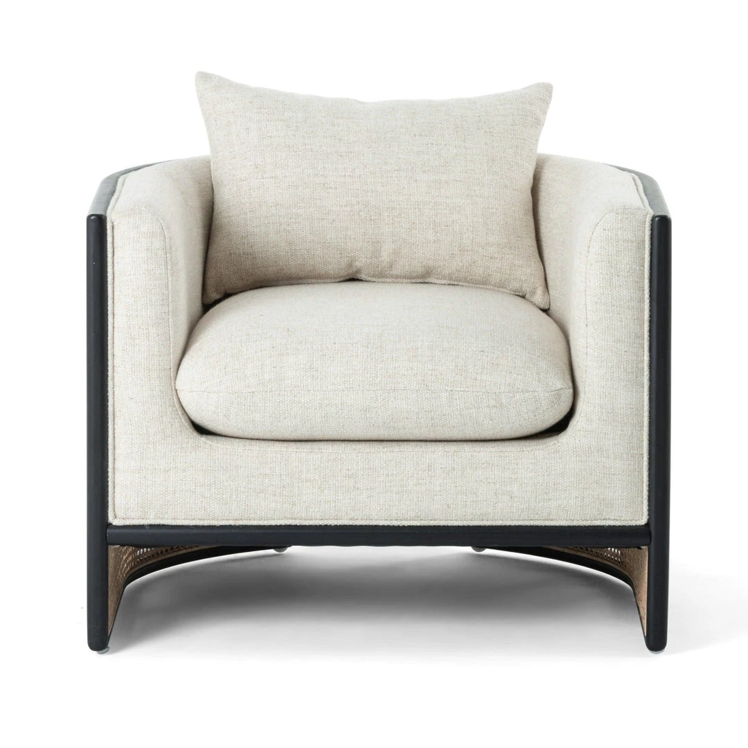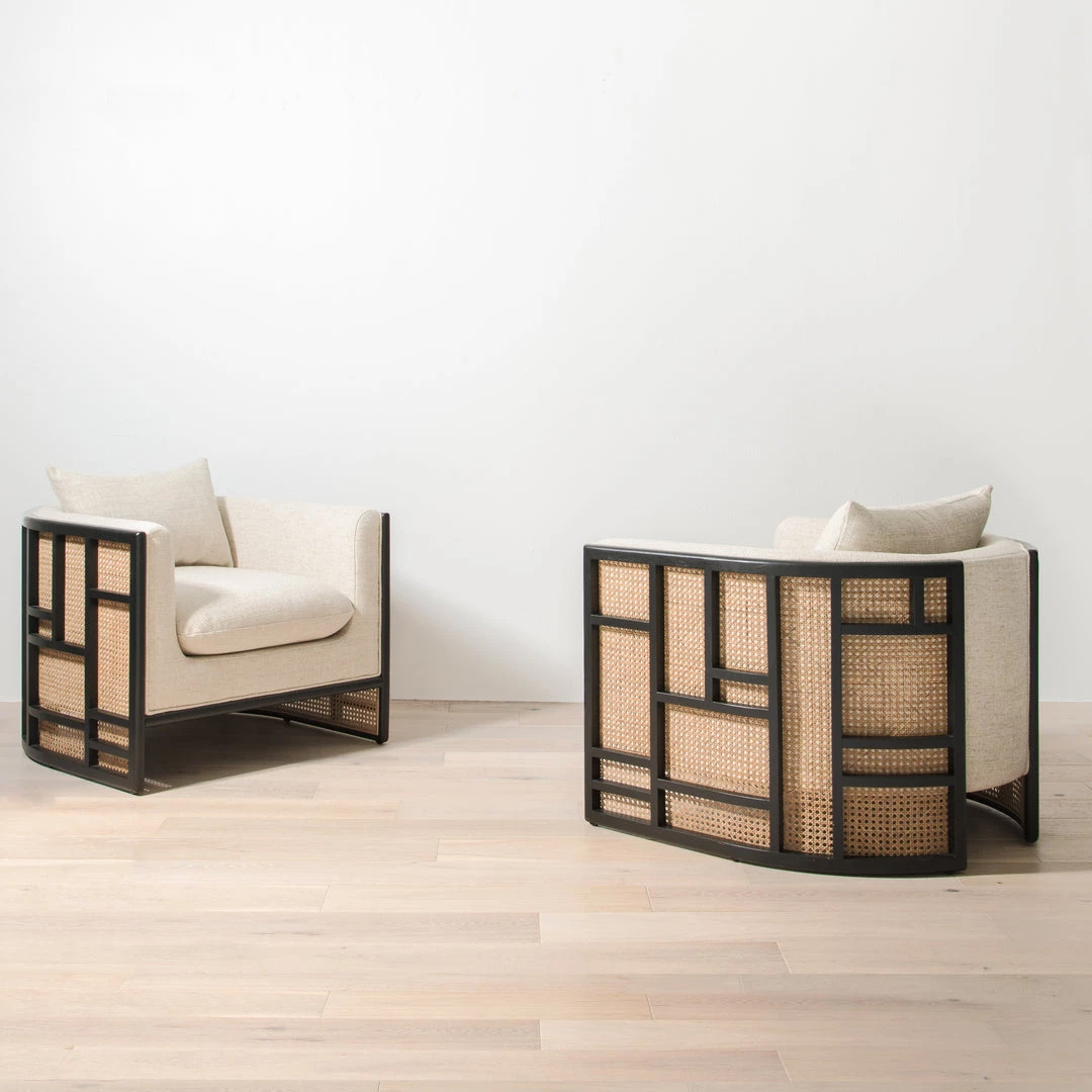 Textural and curve driven. Inspired by Japanese Tatamis, a cleverly constructed outer frame consists of rattan and natural cane paneling. For a clean, monochromatic look sits cream linen-blend performance seating exclusive to Four Hands, with one knife-edge pillow for extra comfort.