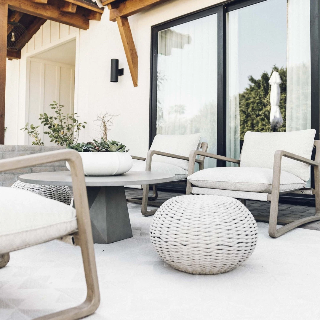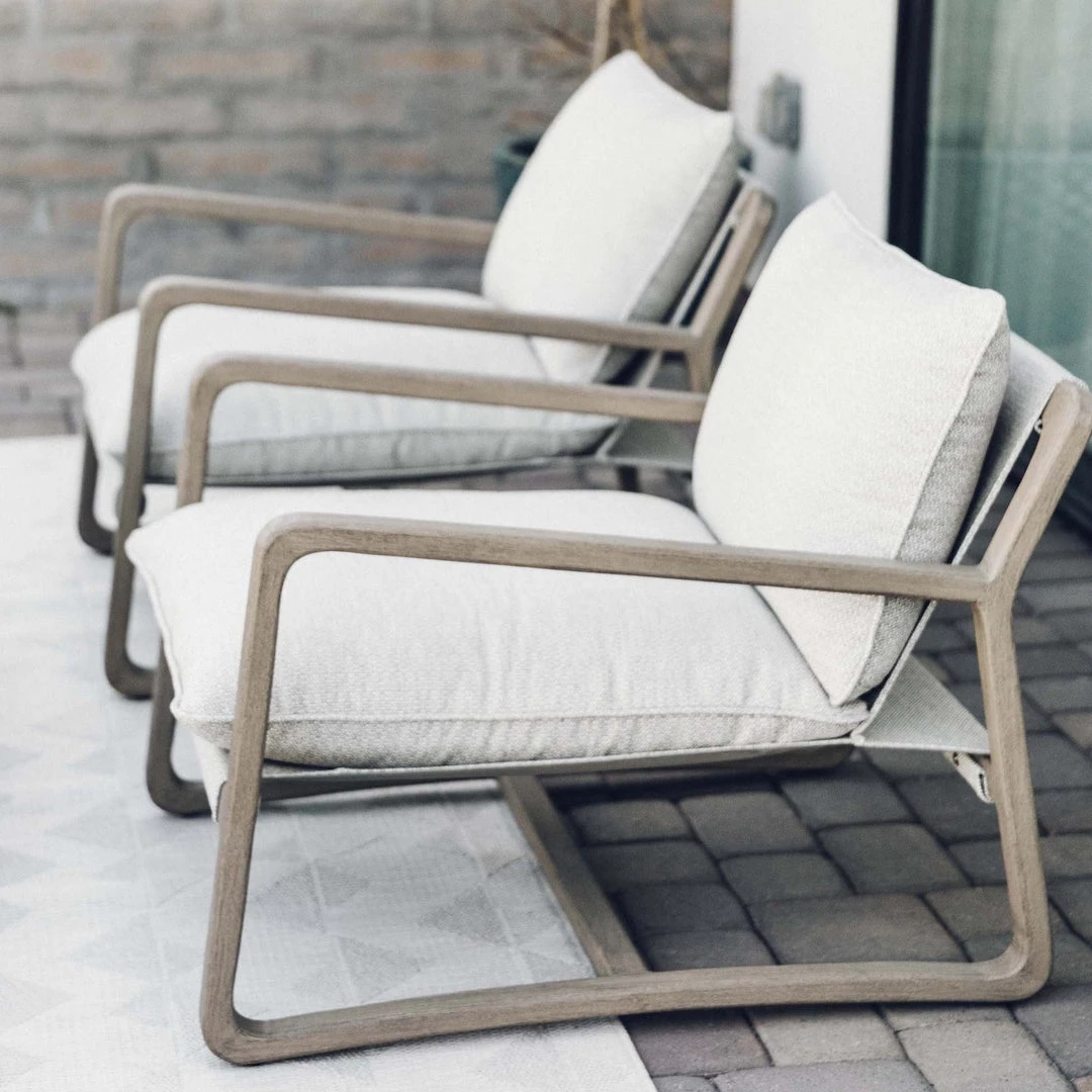 The perfect place to take in the sunrise or sunset. Brown-finished teak frames deep, low seating covered in an invitingly neutral beige. Cover or store indoors during inclement weather and when not in use.