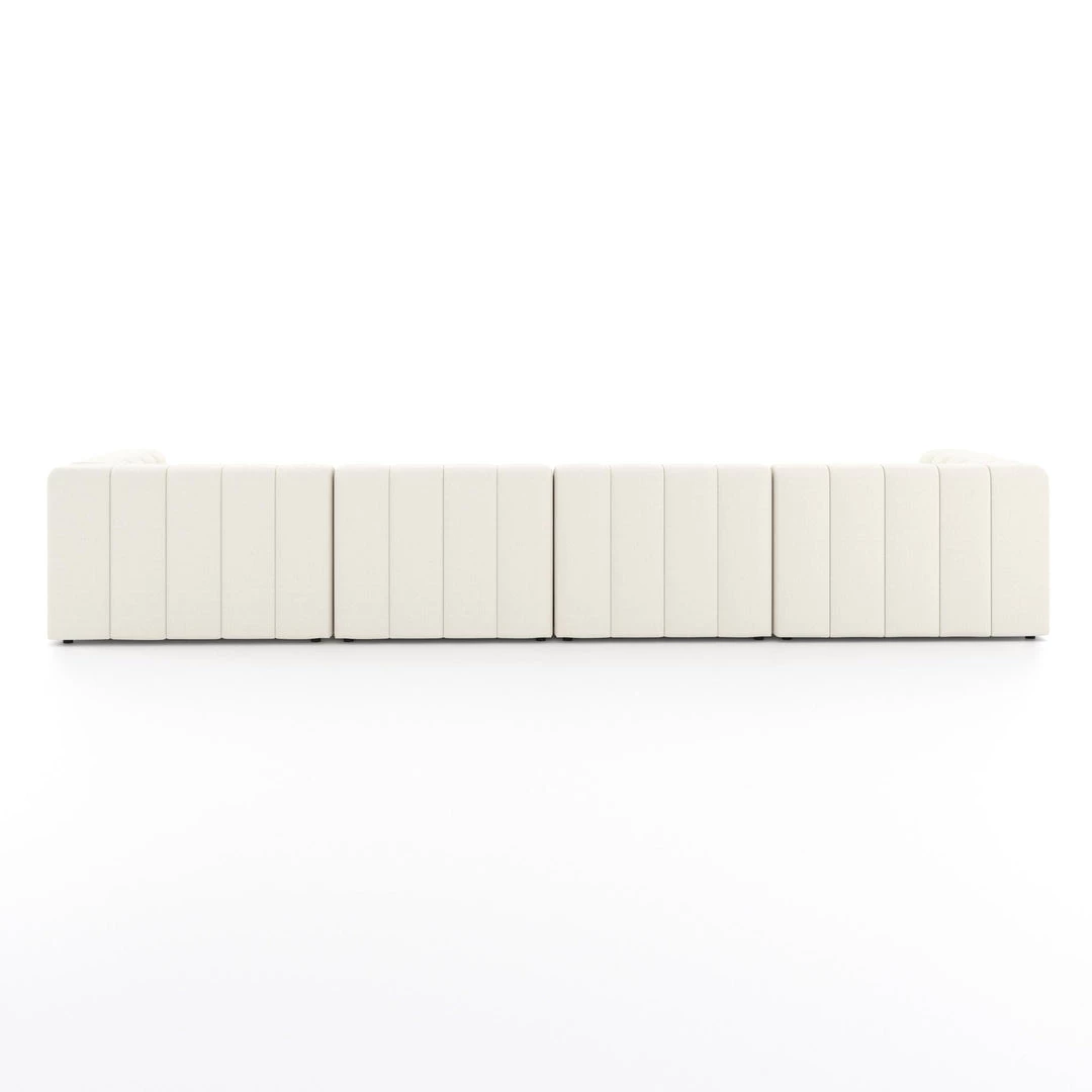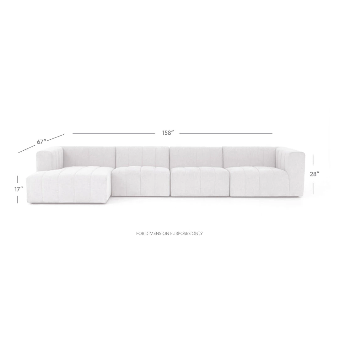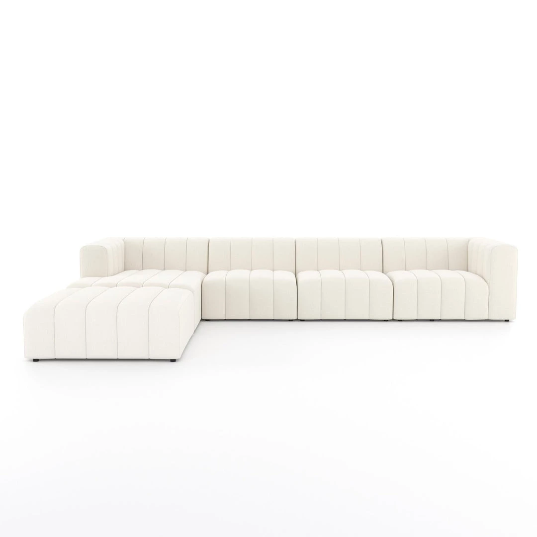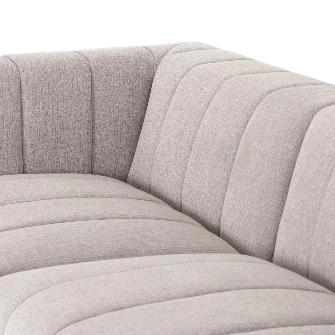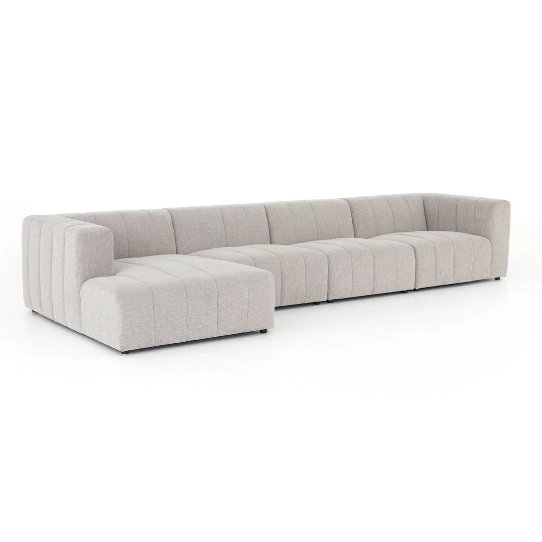 The sensible sectional meets modern Italian styling. Wide channeling and oversize arms offer a luxurious take on modular seating. Neutral sandstone-colored covering awes in any space. Left arm facing chaise to sectional.