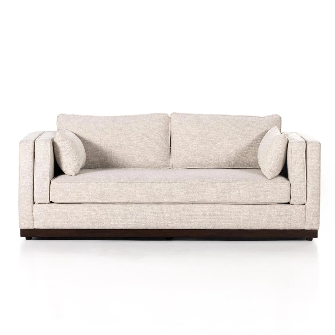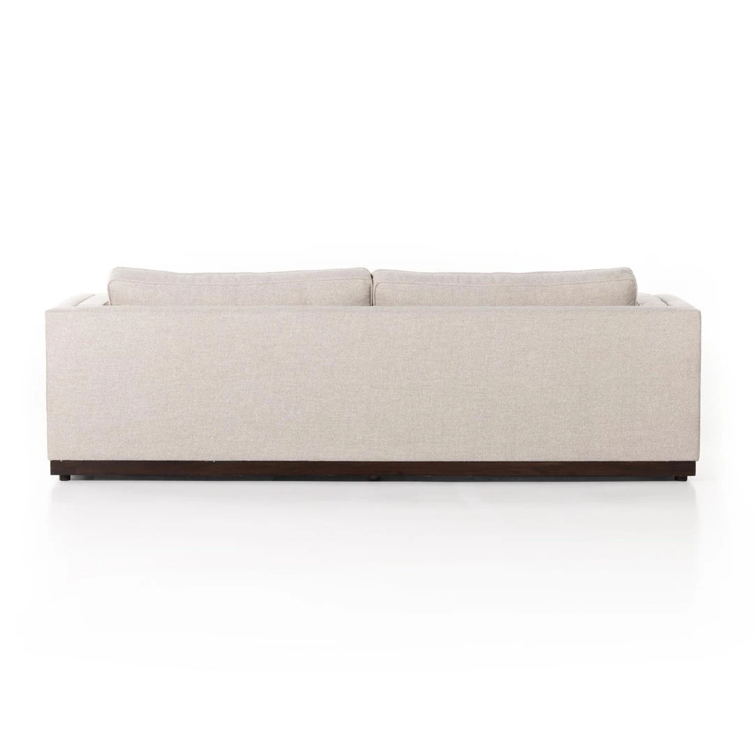 Traditional goes modern. Doubled-stacked arms and cushioning makes for a layered look with maximum comfort, while high-performance upholstery is great for everyday lounging. Finished in an auburn walnut, a 360 plinth-style base offers a touch of contrast.