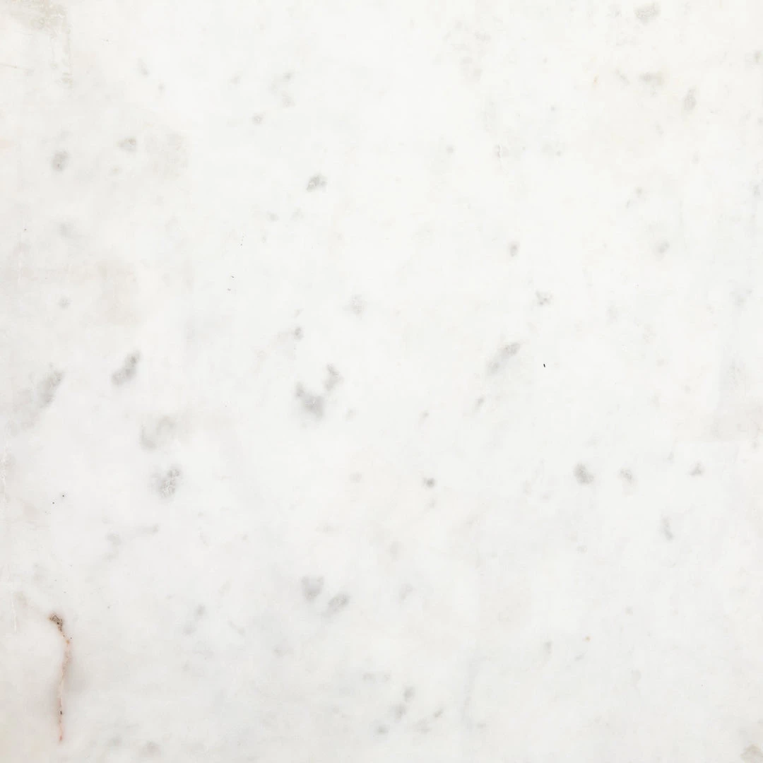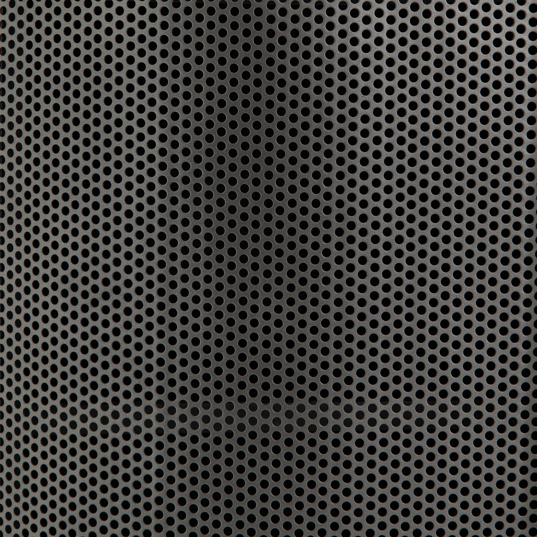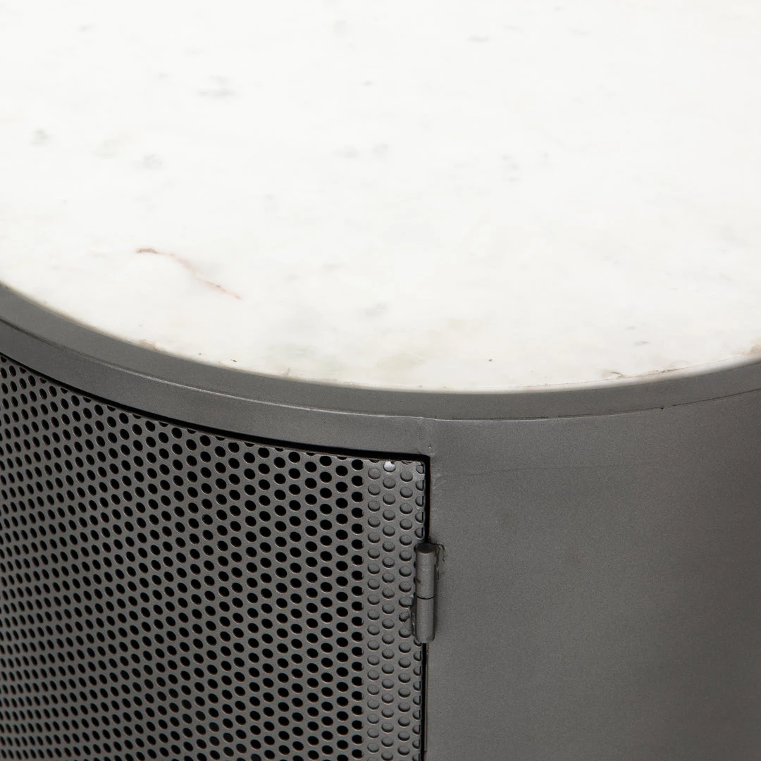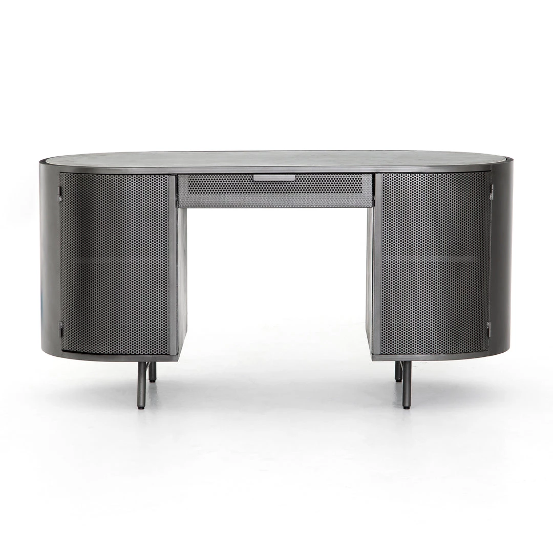 Late-Seventies style, refreshed for the modern office. Gunmetal-finished iron is perforated and rounded for an intriguing take on popular pill shaping, while a top of polished white marble makes for a unique material mix-in.
