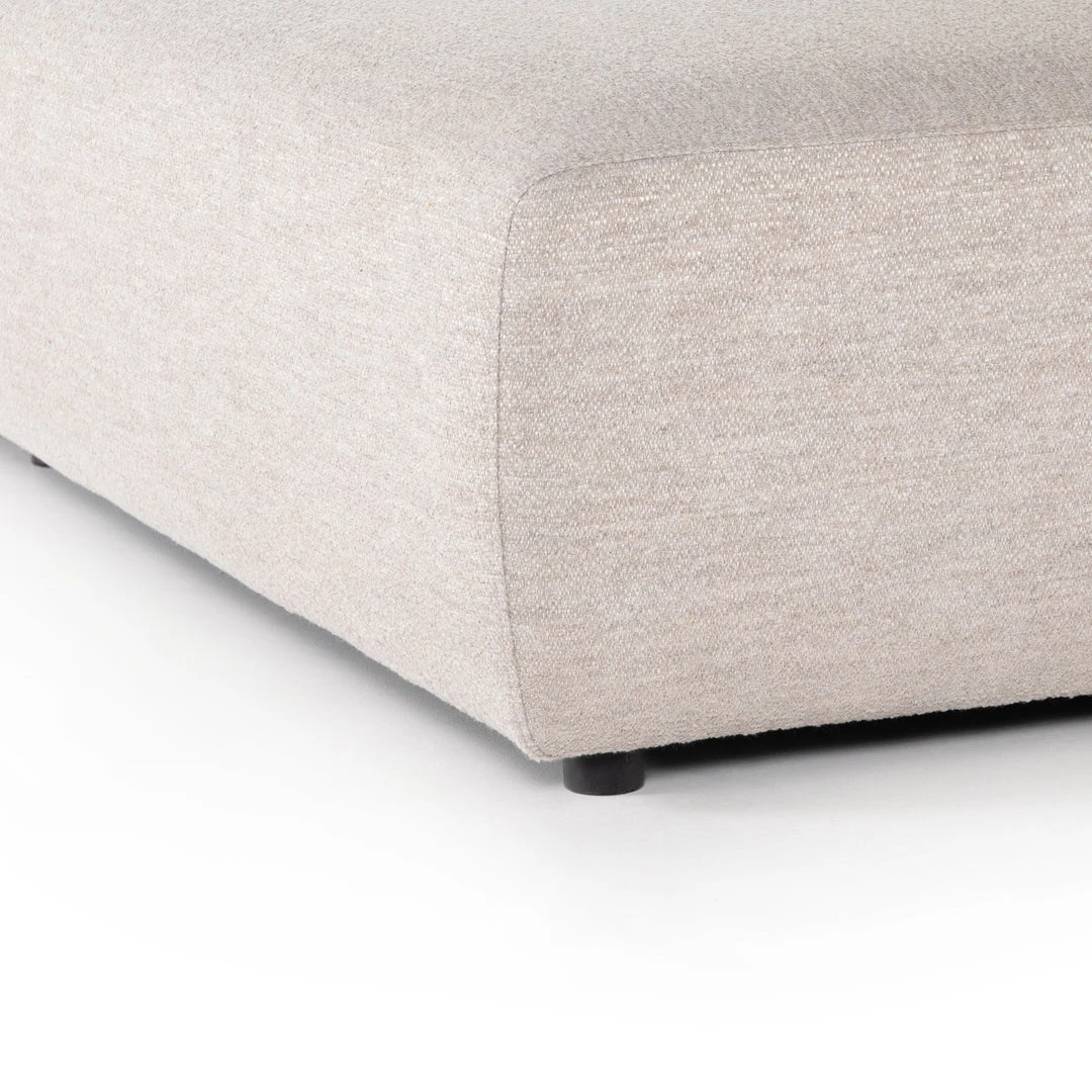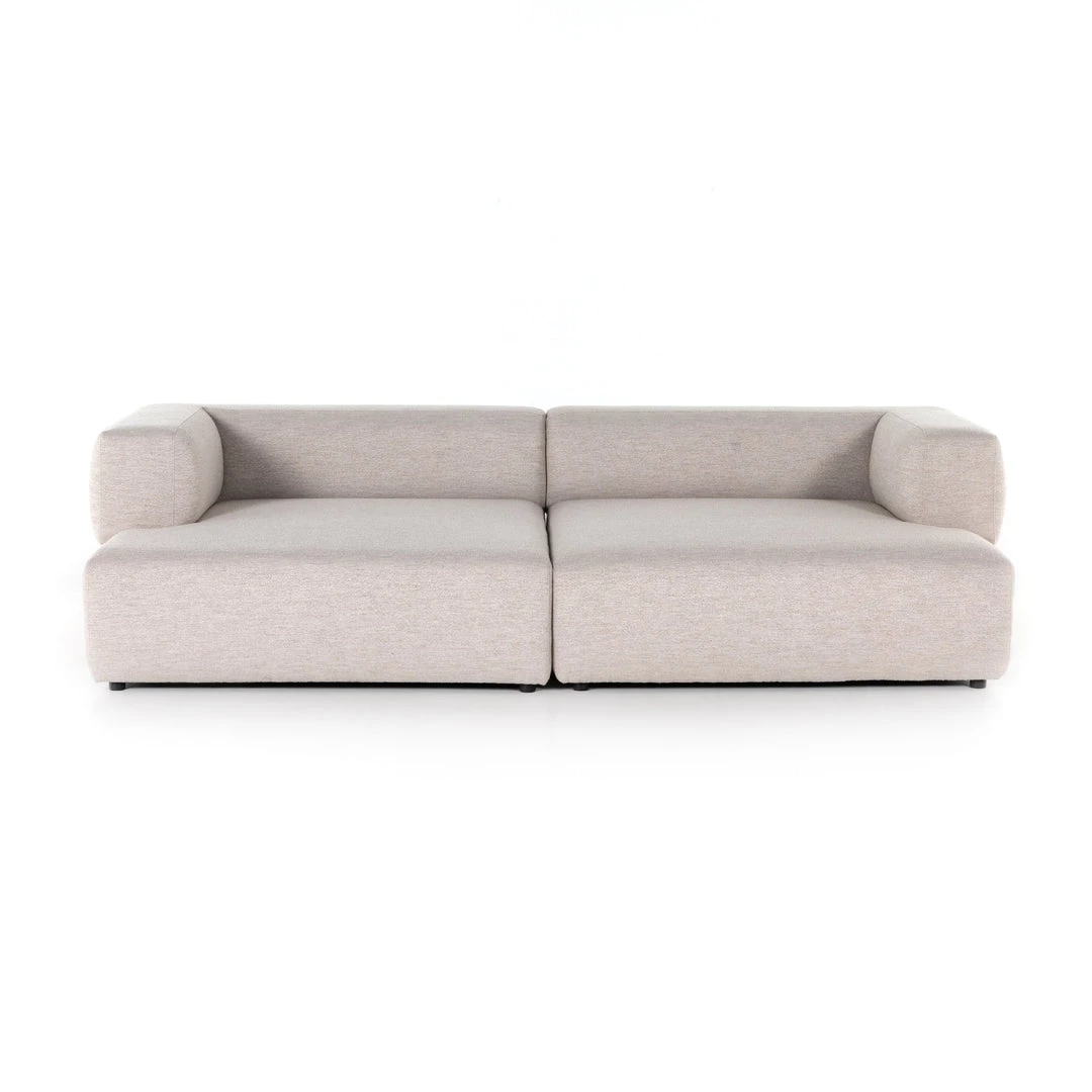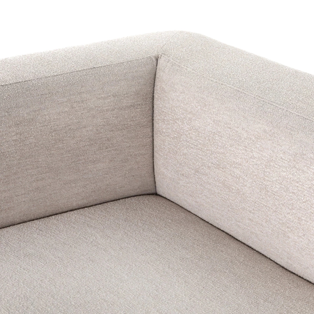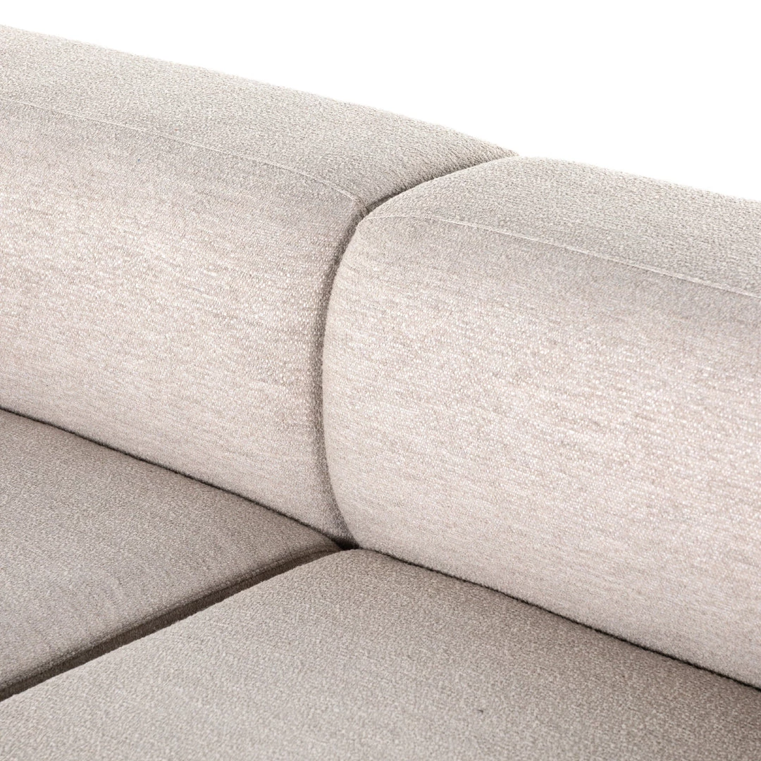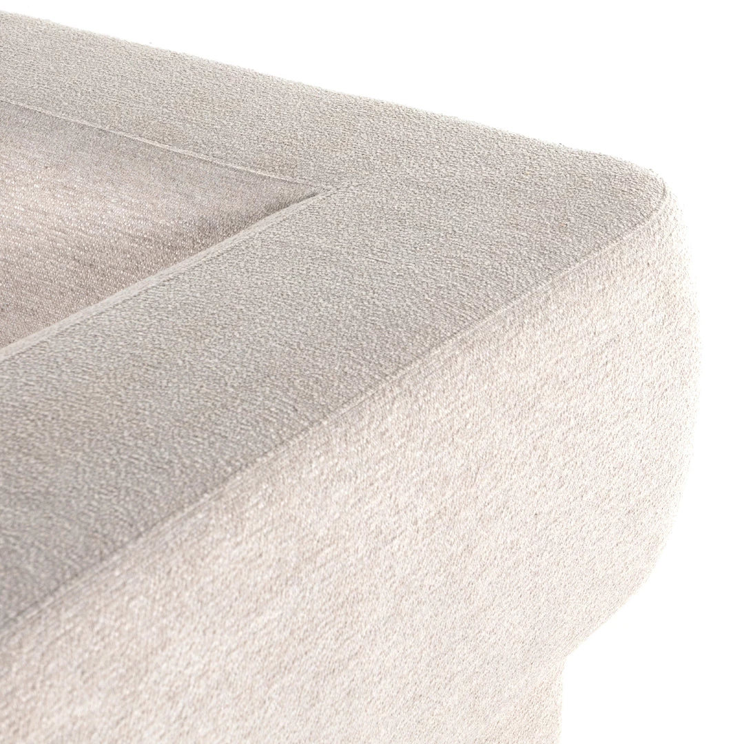 Soft volume says “relax.” Upholstered in a pristinely tailored high-performance fabric that feels like a blend of linen and boucle, rolled curves and grand proportions bring a look of beautiful drama to everyday lounging. Two-piece sectional with matching chaise.