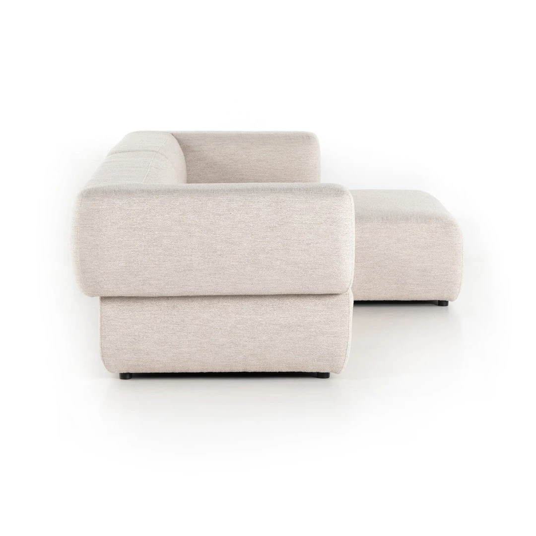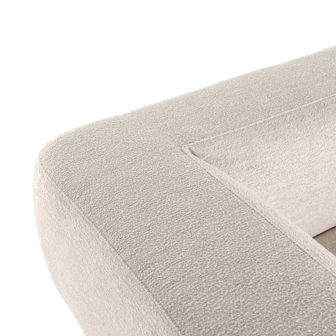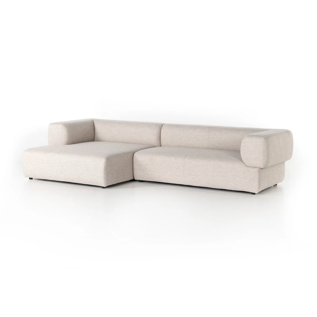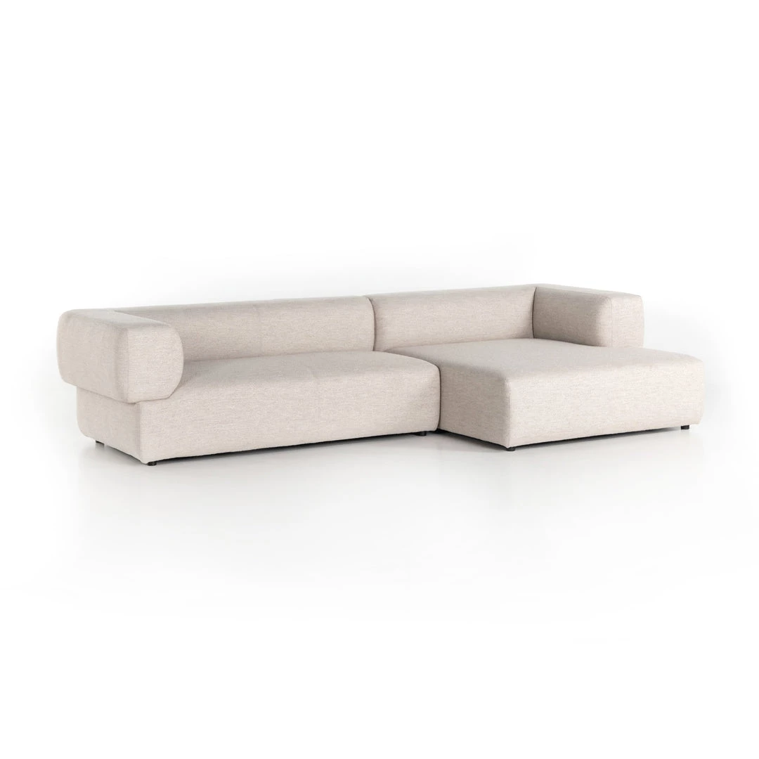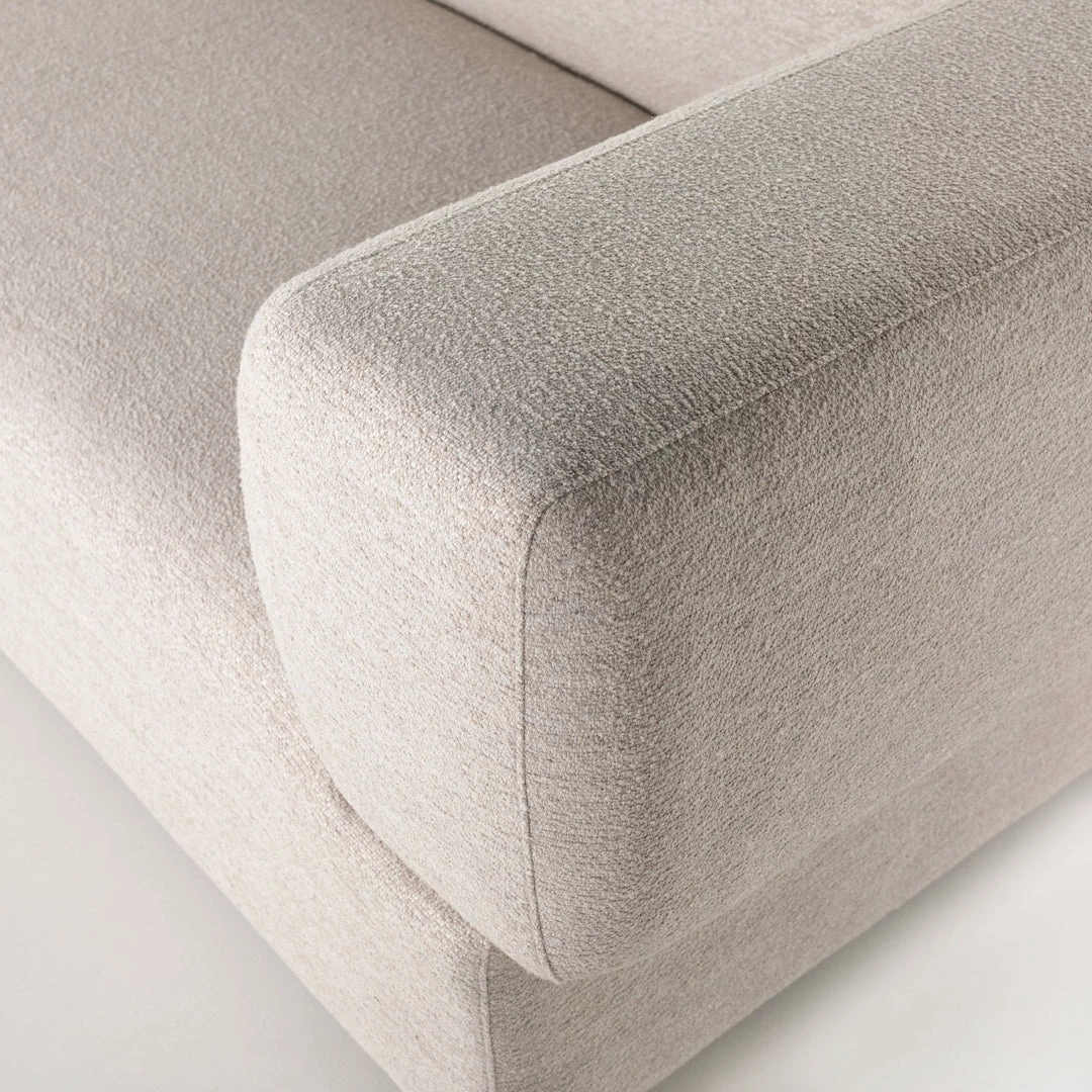 Soft volume says “relax.” Upholstered in a pristinely tailored high-performance fabric that feels like a blend of linen and boucle, rolled curves and grand proportions bring a look of beautiful drama to everyday lounging. Two-piece left arm-facing sectional with matching chaise.