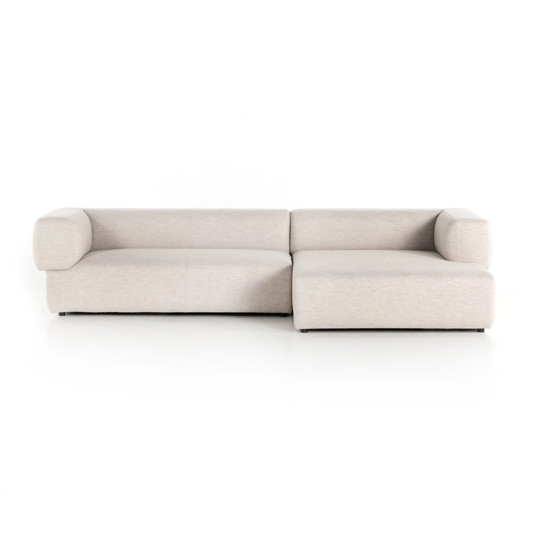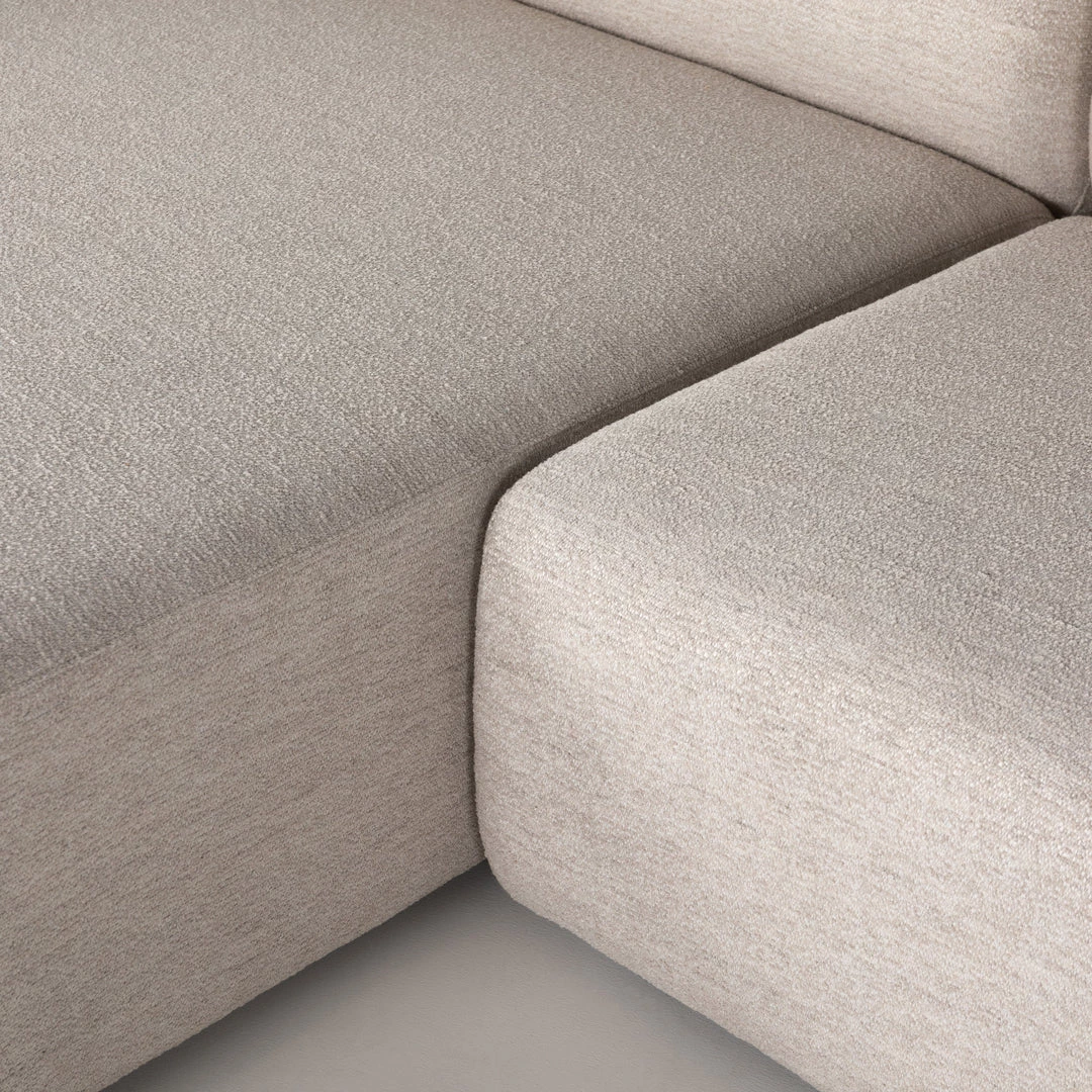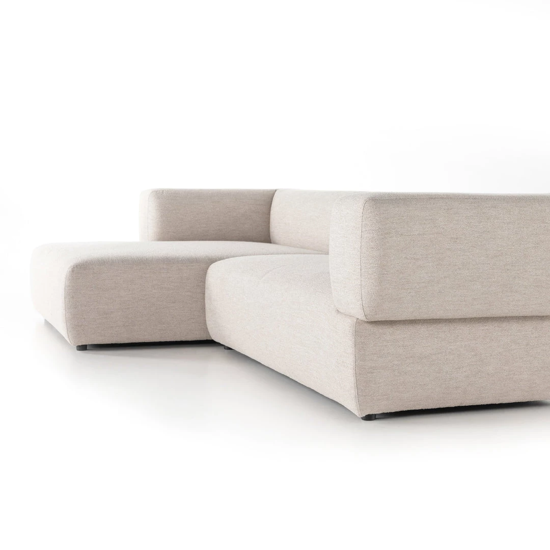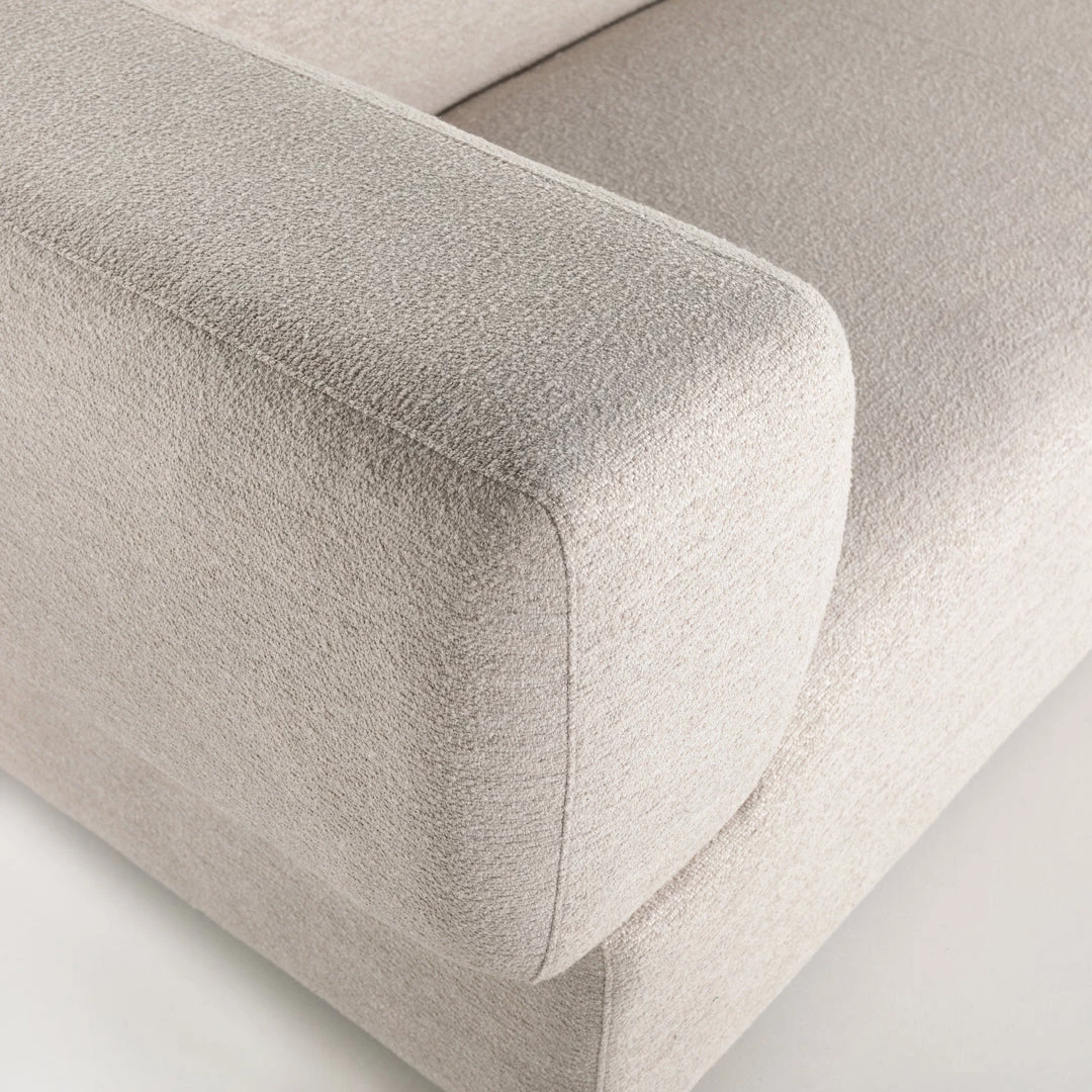 Soft volume says “relax.” Upholstered in a pristinely tailored high-performance fabric that feels like a blend of linen and boucle, rolled curves and grand proportions bring a look of beautiful drama to everyday lounging. Two-piece left arm-facing sectional with matching chaise.