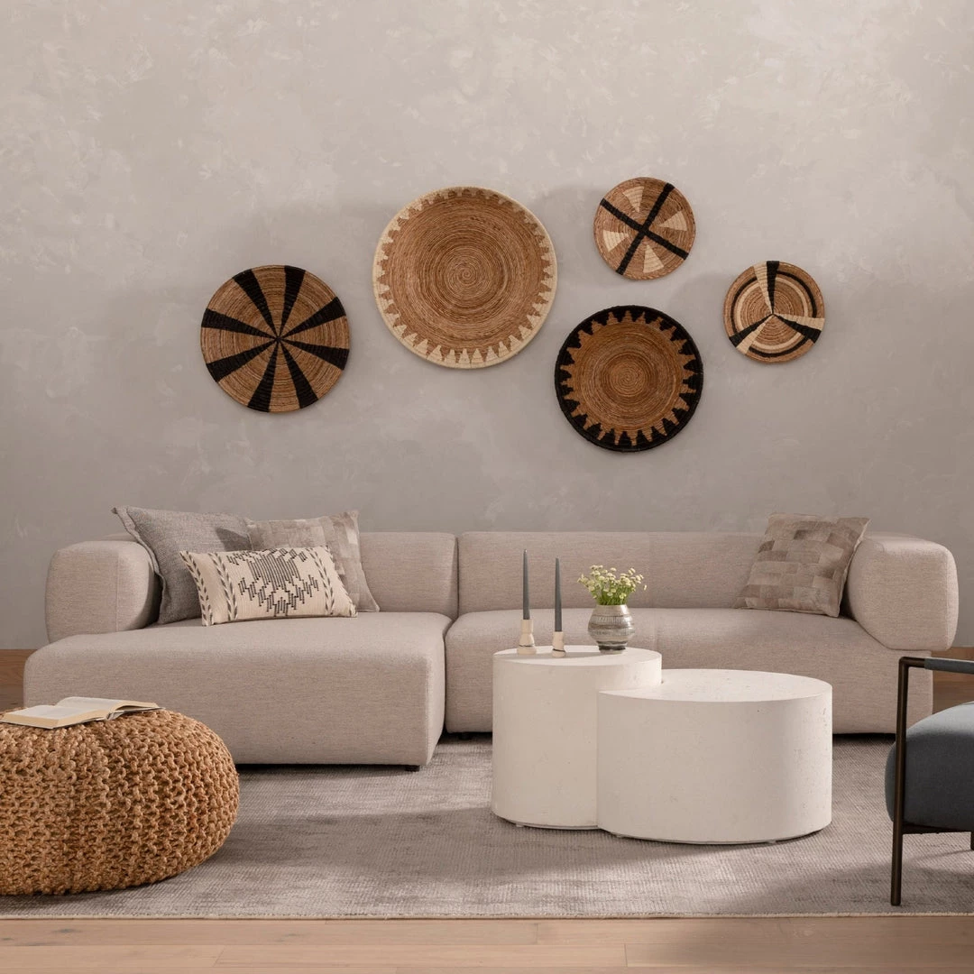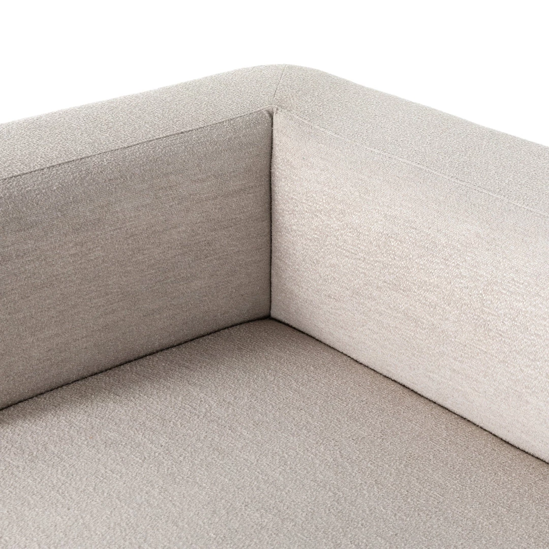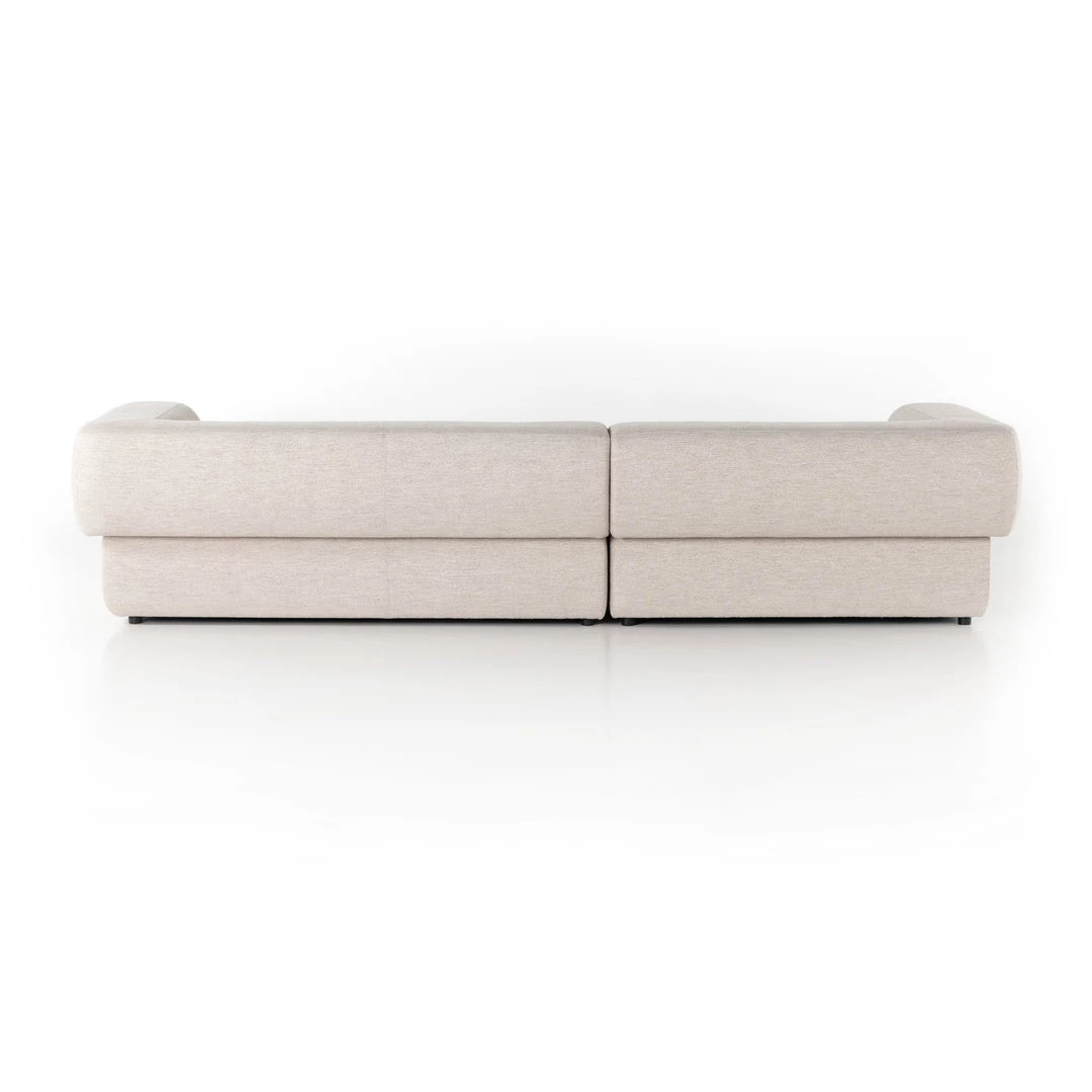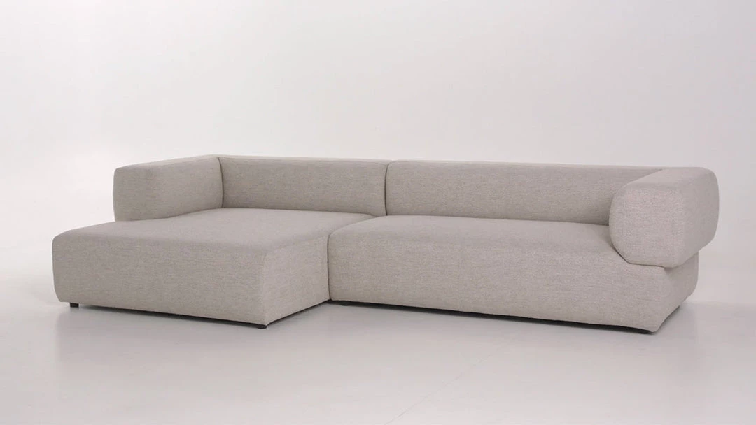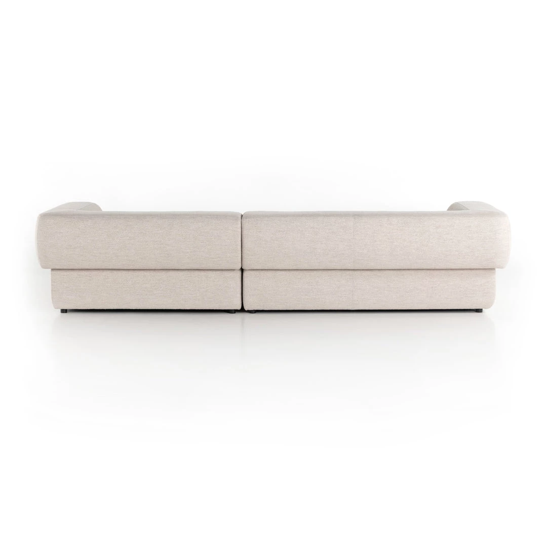 Soft volume says “relax.” Upholstered in a pristinely tailored high-performance fabric that feels like a blend of linen and boucle, rolled curves and grand proportions bring a look of beautiful drama to everyday lounging. Two-piece left arm-facing sectional with matching chaise.