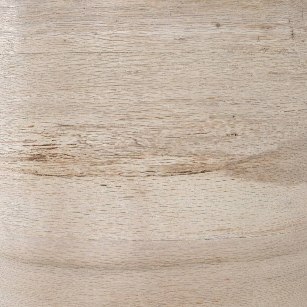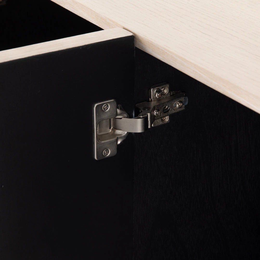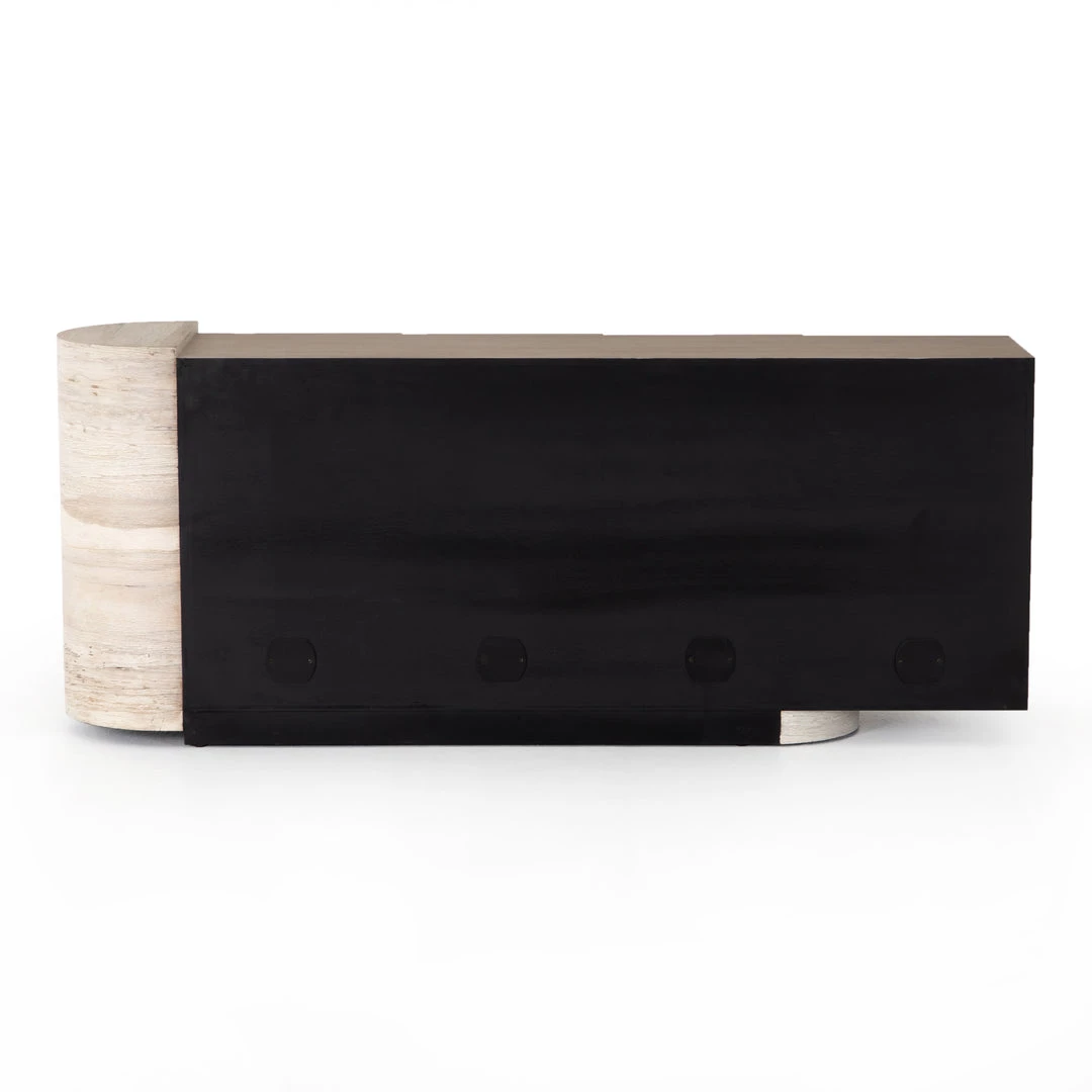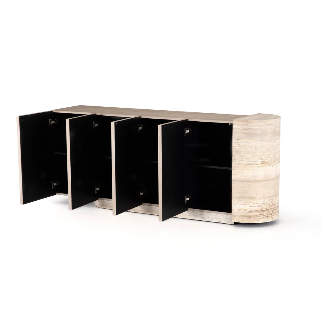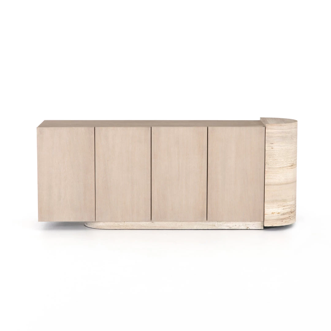 Organic in tone, sculptural in spirit. Inspired by bold Eighties-era design, a raised half-cylinder pedestal and curved plinth-style base of bleached spalted oak flanks one side of this imaginative sideboard, lending asymmetric intrigue to pale oak veneer casing. Push-latch doors open to partitioned spaces offering plenty of interior storage with removable adjustable shelves, plus rear cutouts for cord management.