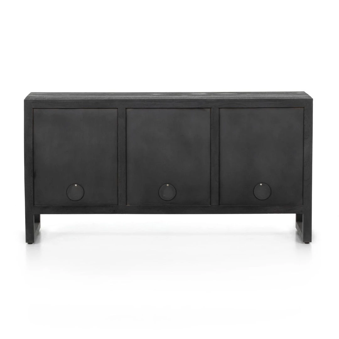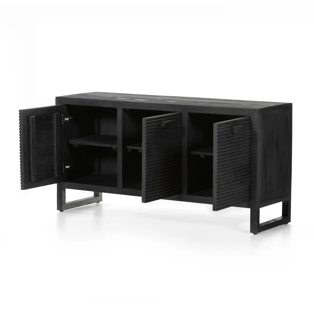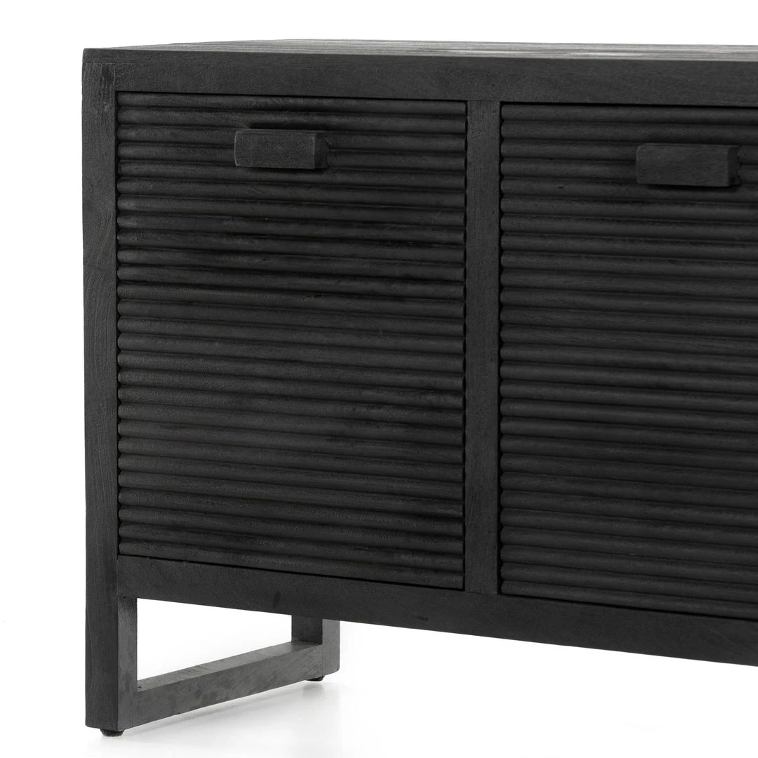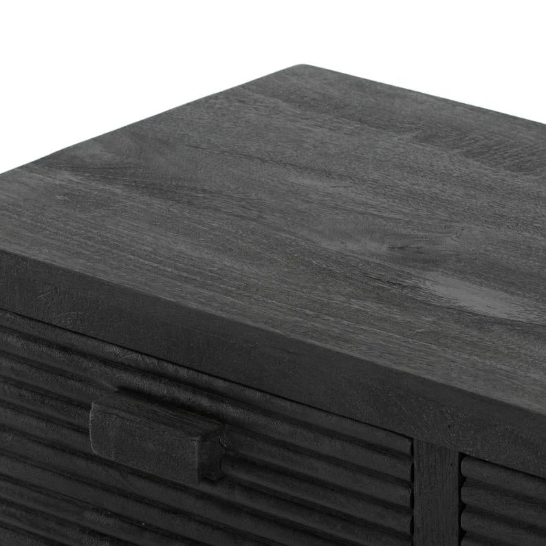 Dark-finished reclaimed woods form a beautifully substantial console, with carved reeding for a linear look. Rear cutouts for cord management.
