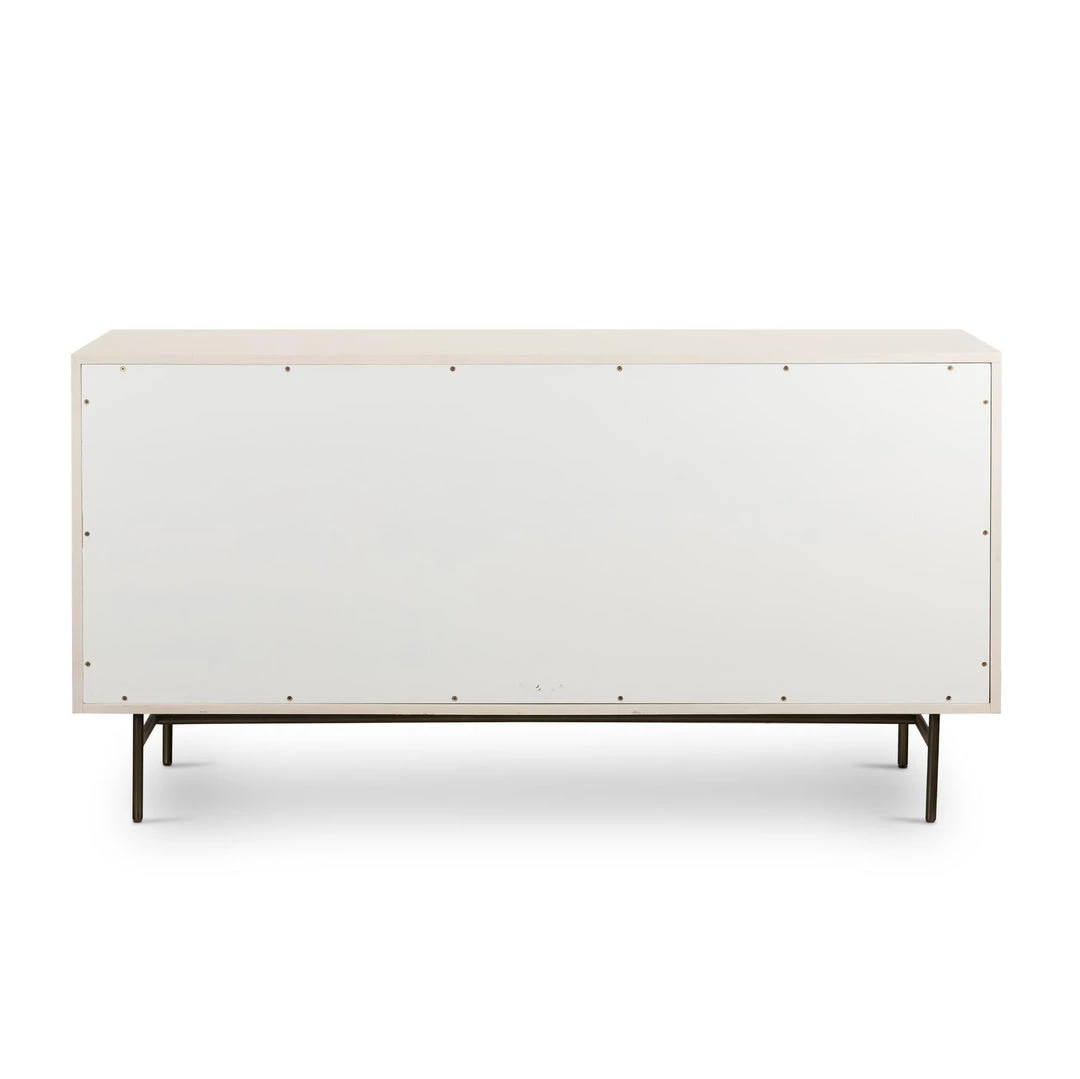 Bring a light look to bedroom styling. A lacquered six-drawer dresser features woven cane panels and half-moon hardware finished in an aged brass.