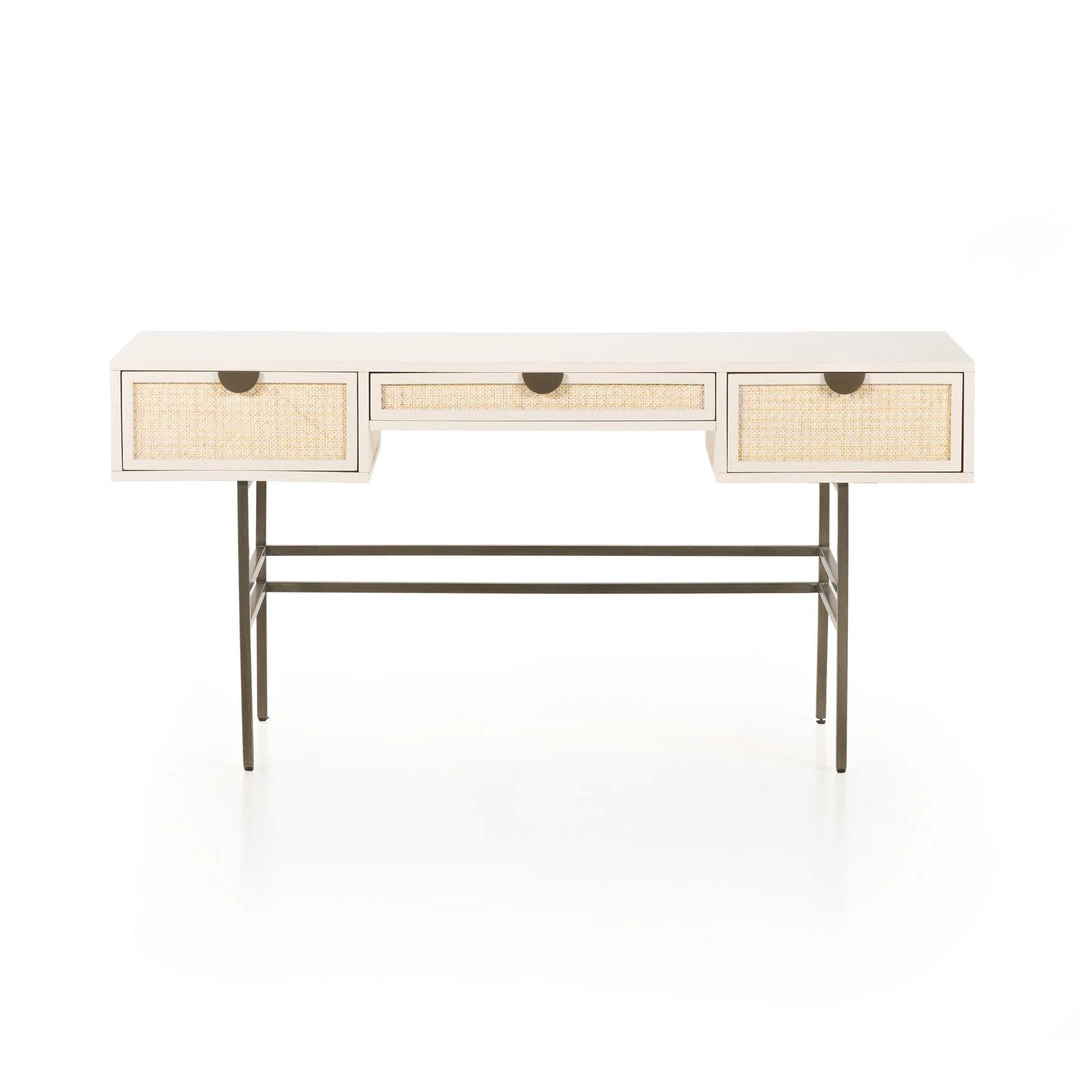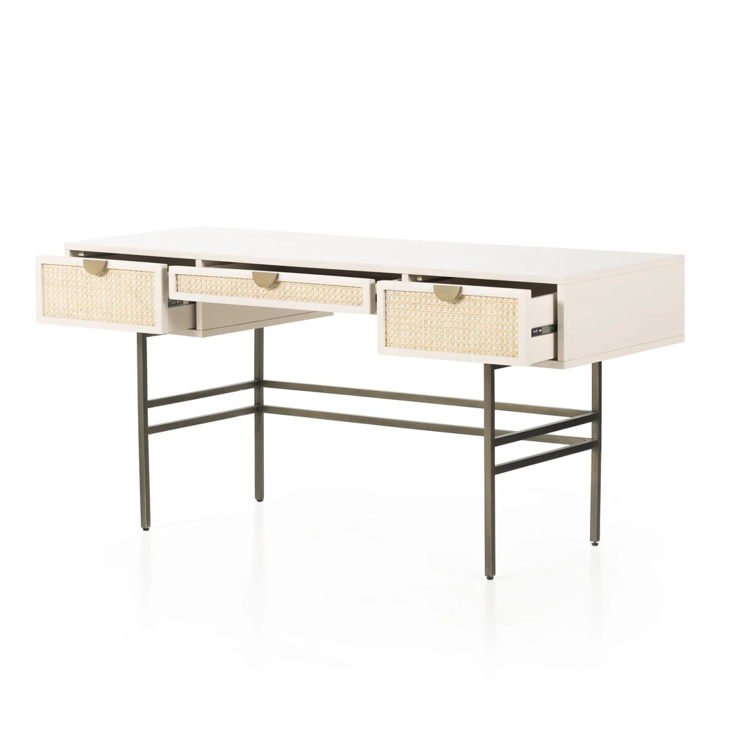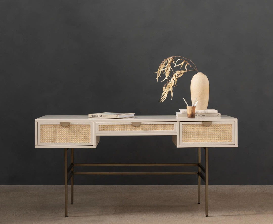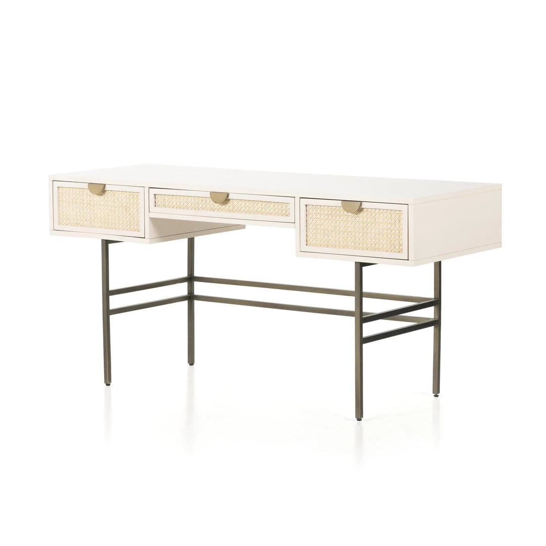 Bring a light look to the modern office. A lacquered three-drawer desk features woven cane panels and half-moon hardware finished in an aged brass.
