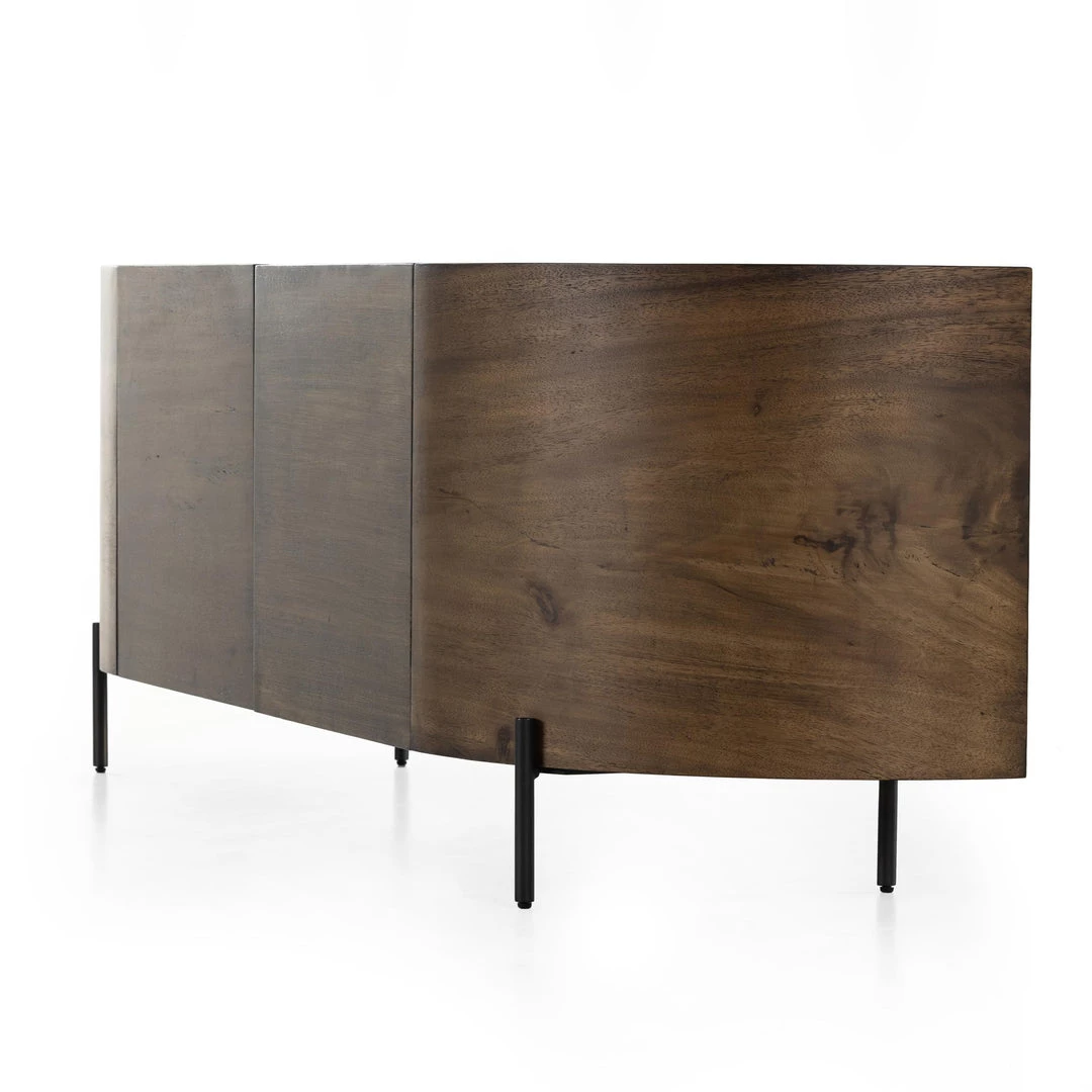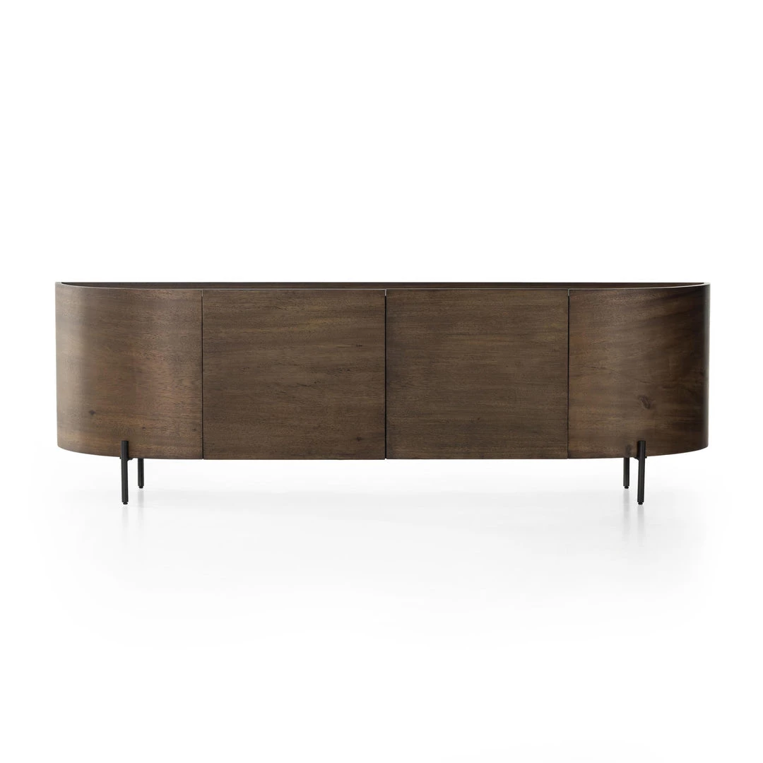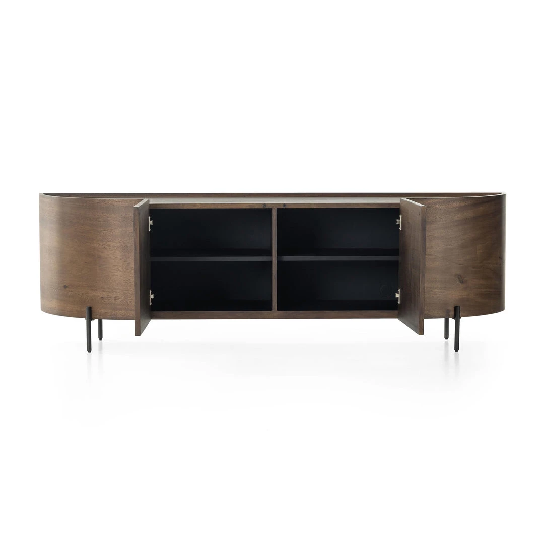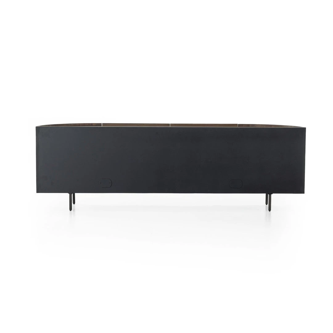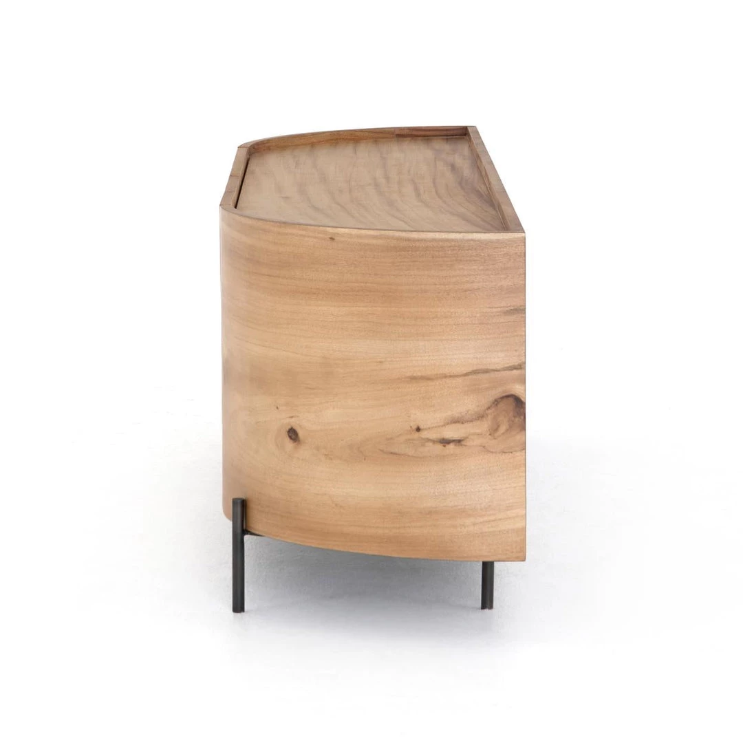 With soft shaping and inset top inspired by classic jewelry setting, gold Guanacaste forms a beautifully sculpted silhouette, with natural high and lowlights coursing the entirety of this richly styled media console.