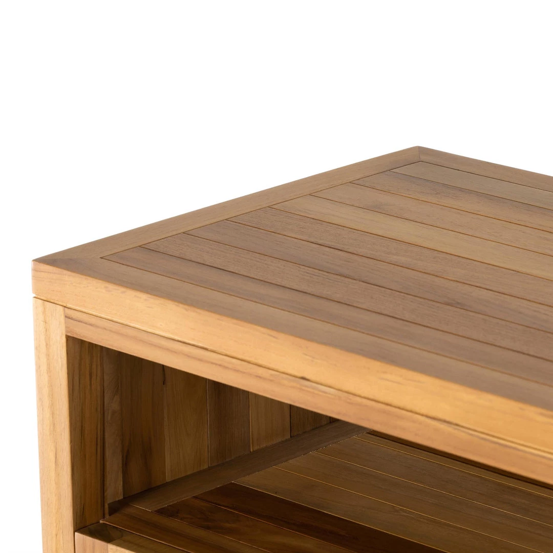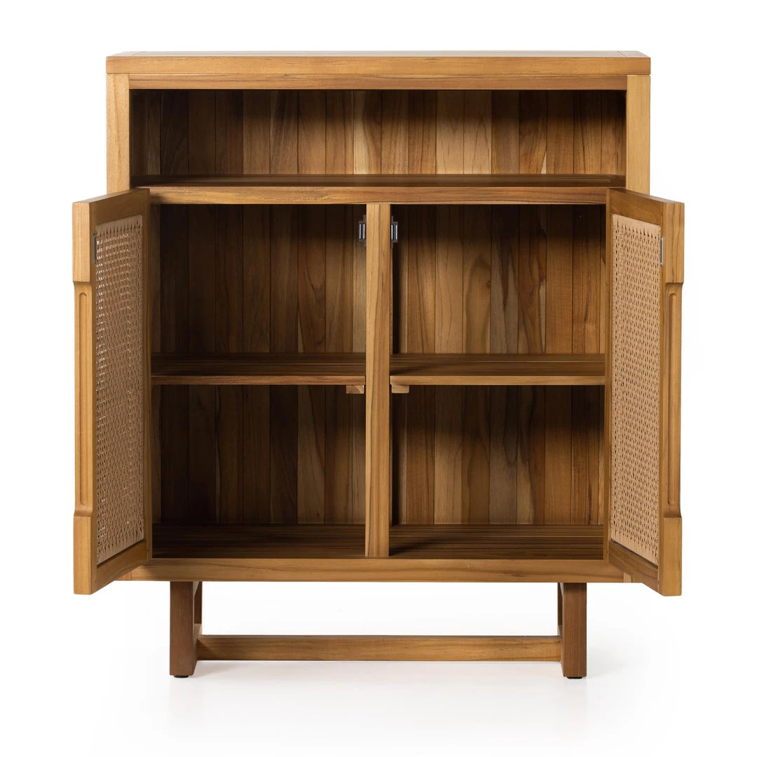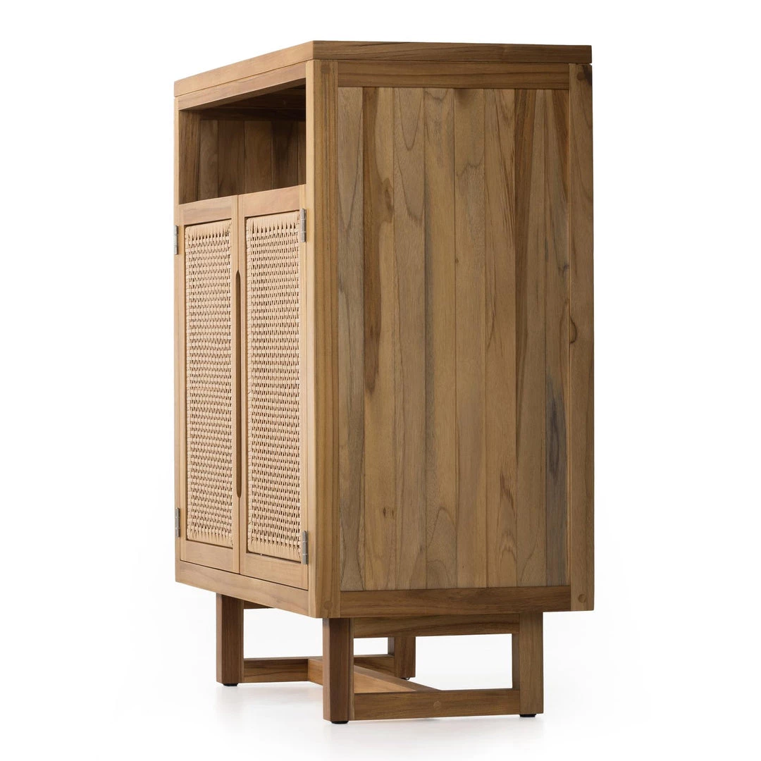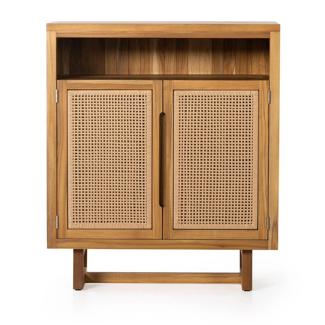 The cane trend moves outdoors. FSC-certified teak frame is detailed with rattan-inspired woven panels for a breezy, crafted minimalism take on the outdoor cabinet. Includes removable inner shelf. Cover or store indoors during inclement weather and when not in use.