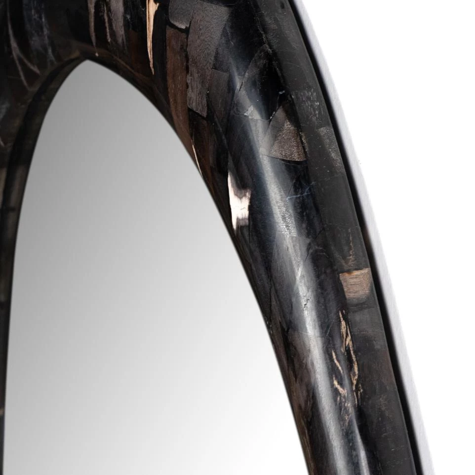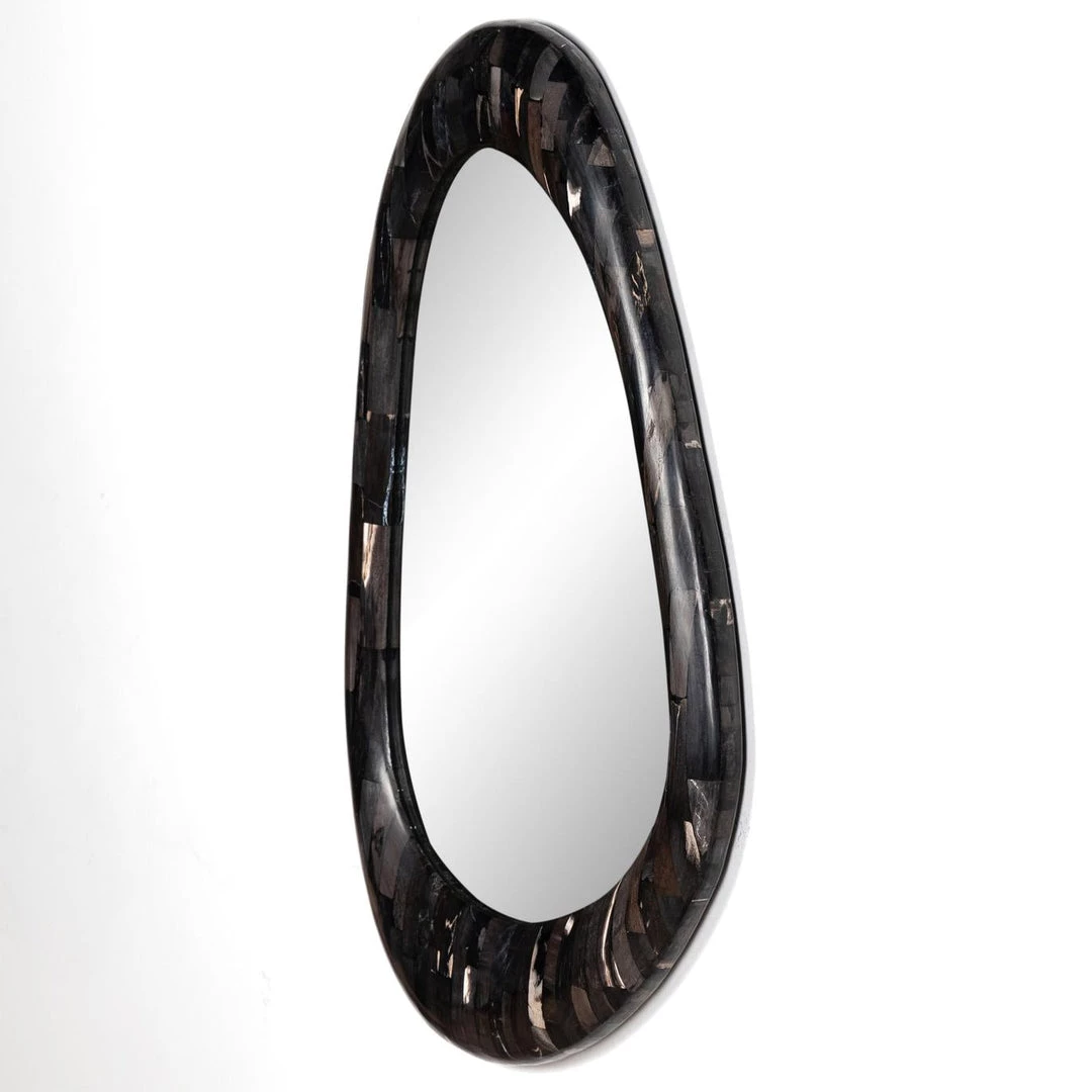 Dark petrified woods shape an organic-spirited mirror, for a fluid look and feel.