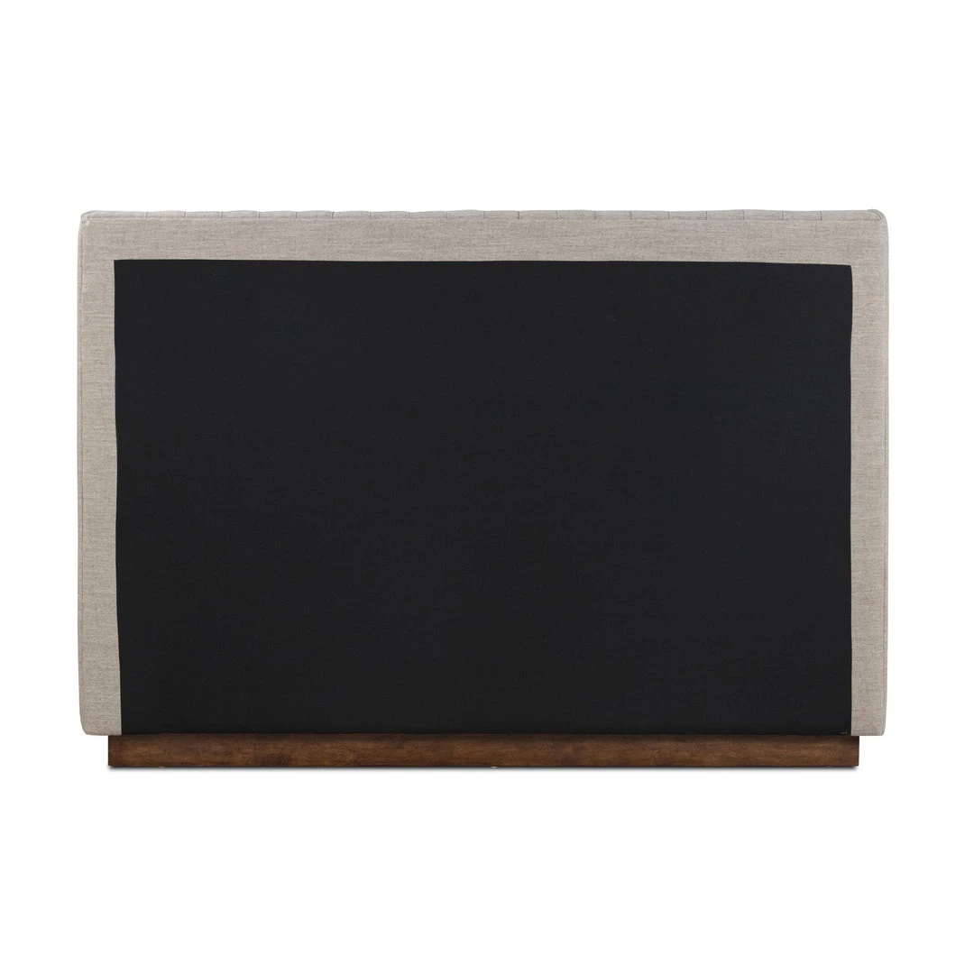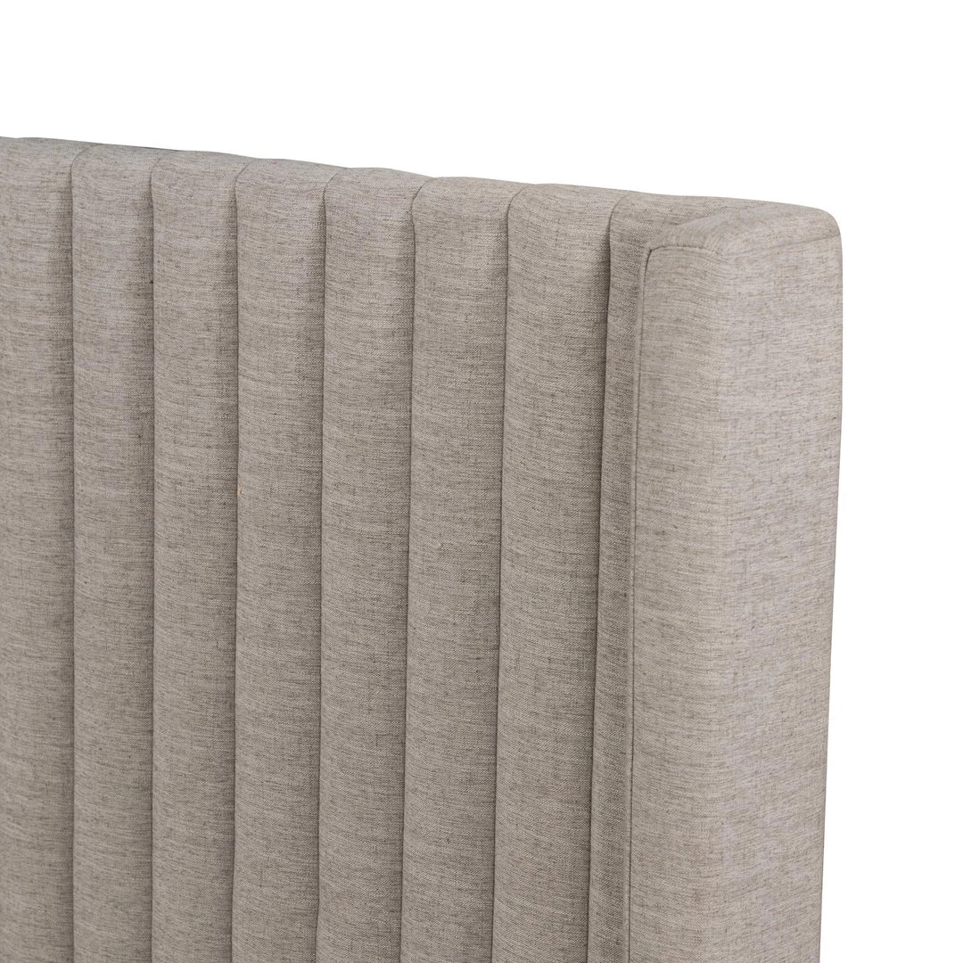 Sky-high style. A tall, vertical-channeled headboard is upholstered in grey high-performance fabric for a sensible take on modern bedroom styling. A parawood plinth base grounds the whole look.