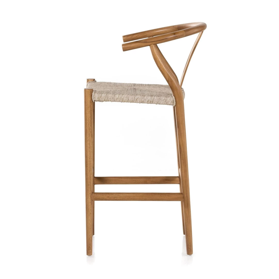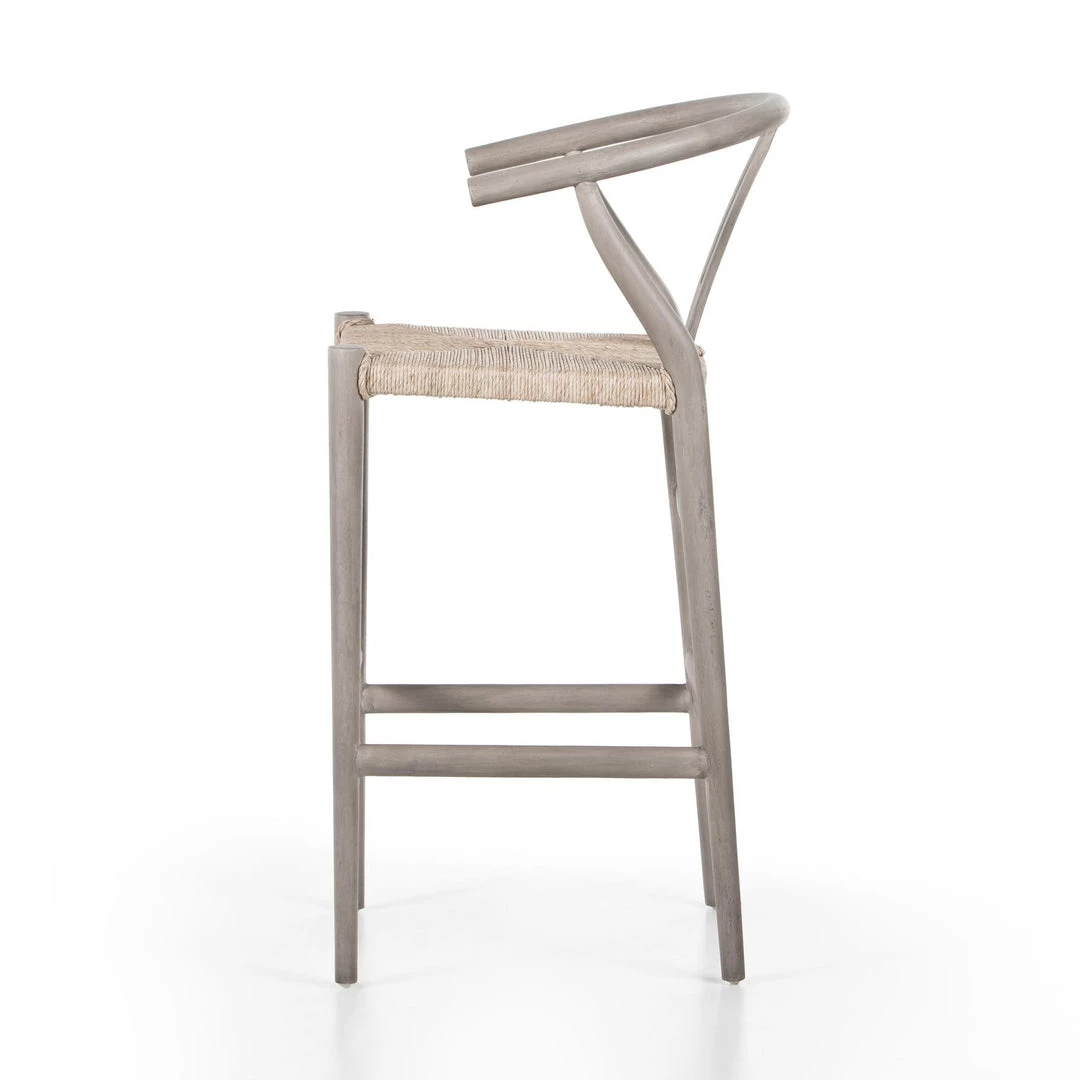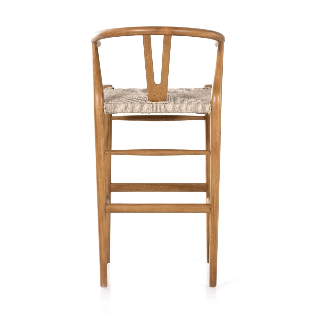Modern curves redefine the classic wishbone-style stool. Vintage white all-weather wicker is woven for a dose of fresh texture upon a neutral palette. Cover or store indoors during inclement weather and when not in use. 42″H.