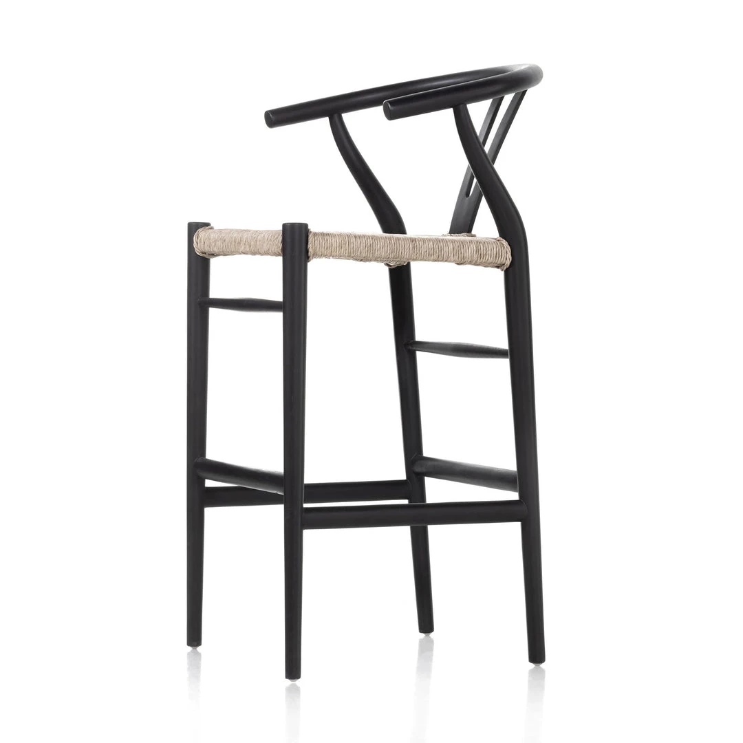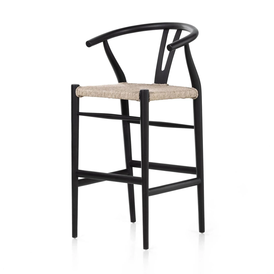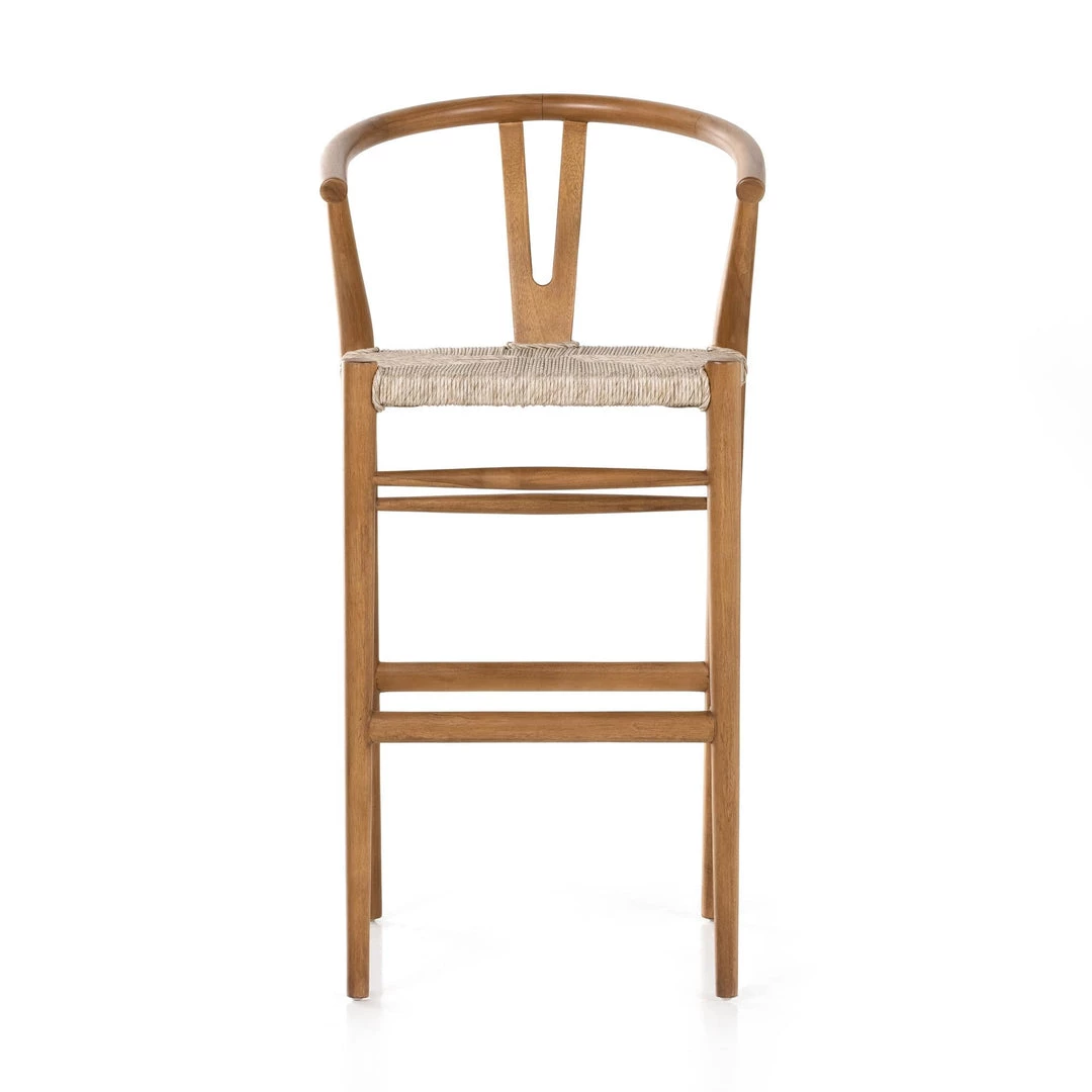 Modern curves redefine the classic wishbone-style stool. Vintage white all-weather wicker is woven for a dose of fresh texture upon a neutral palette. Cover or store indoors during inclement weather and when not in use. 42″H.