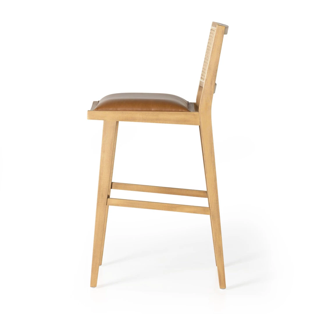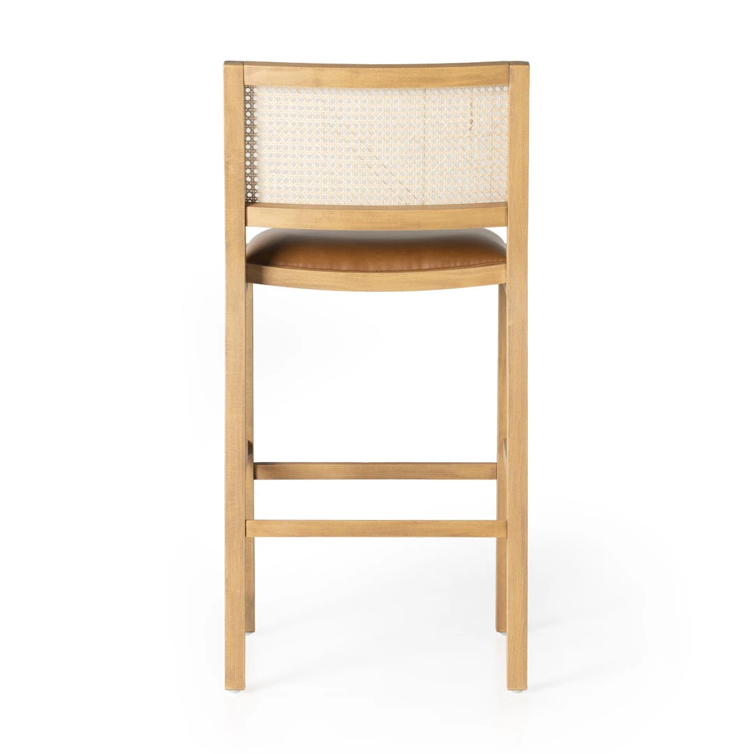 Mixed materials make the chair. Solid natural beech wood features a natural cane back for extra texture, while a butterscotch-finished faux leather seat serves total comfort.