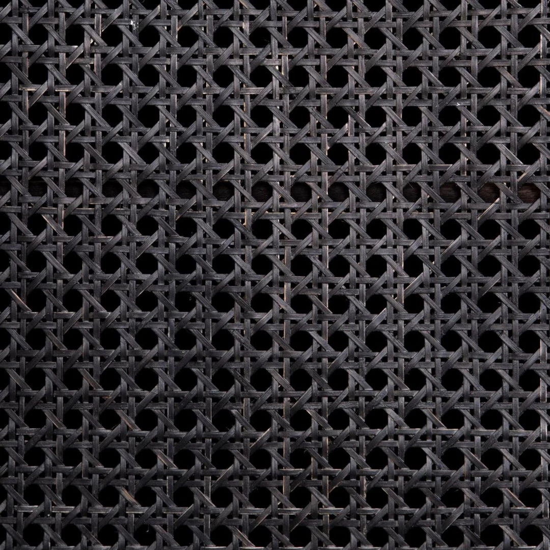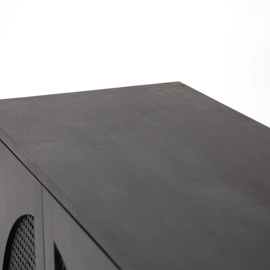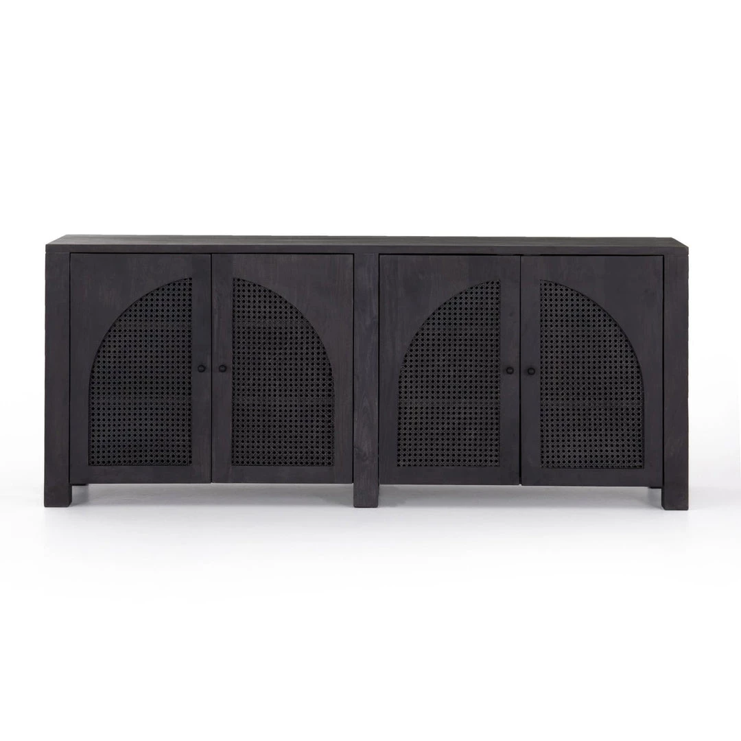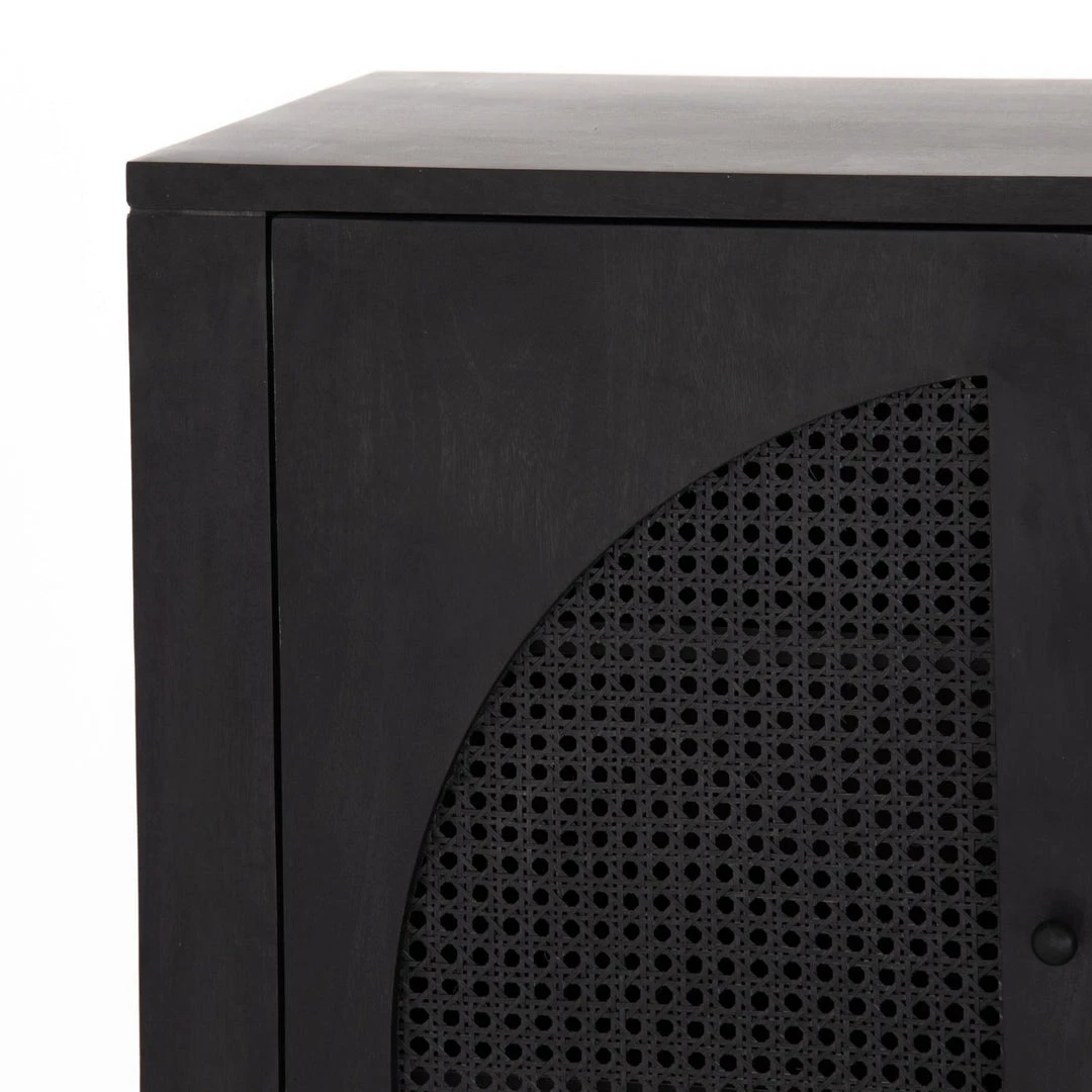 Grand in scale and presence. Black-washed mango encases arched cane door panels featuring black-finished iron hardware, meeting a forward-thinking material mix with monochromatic vibes.