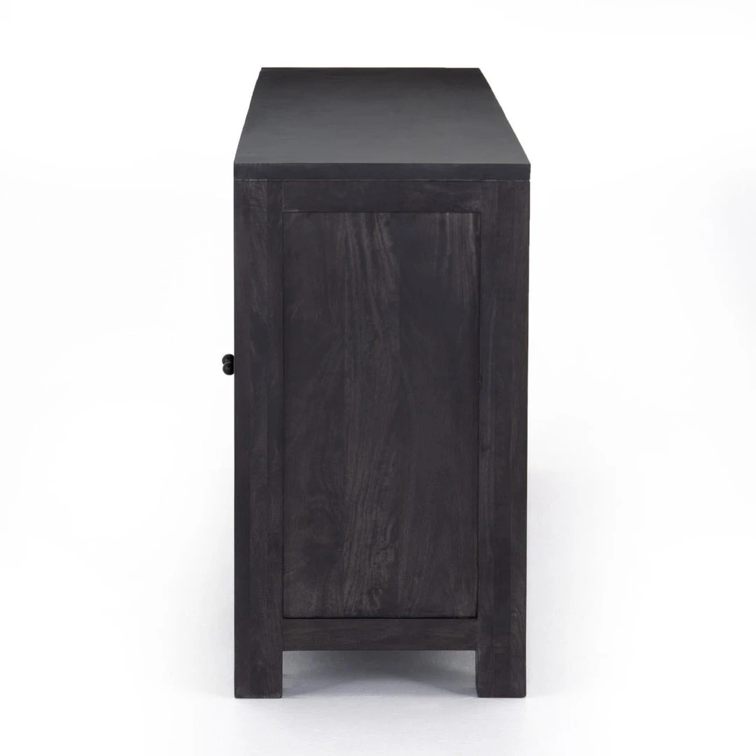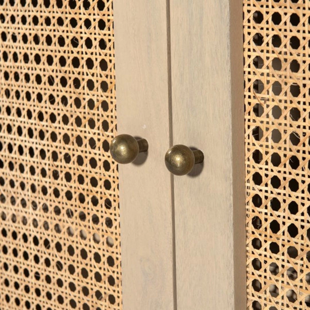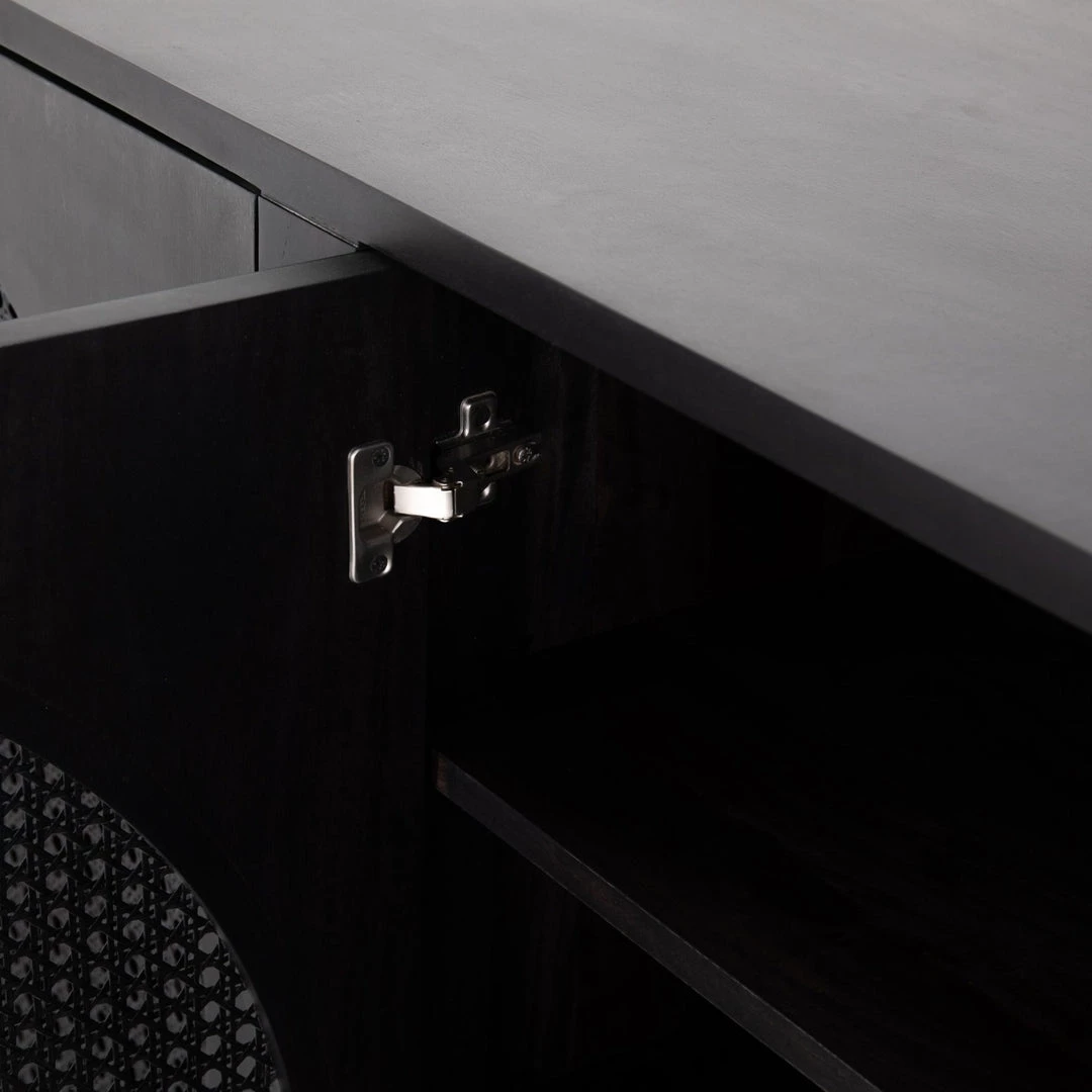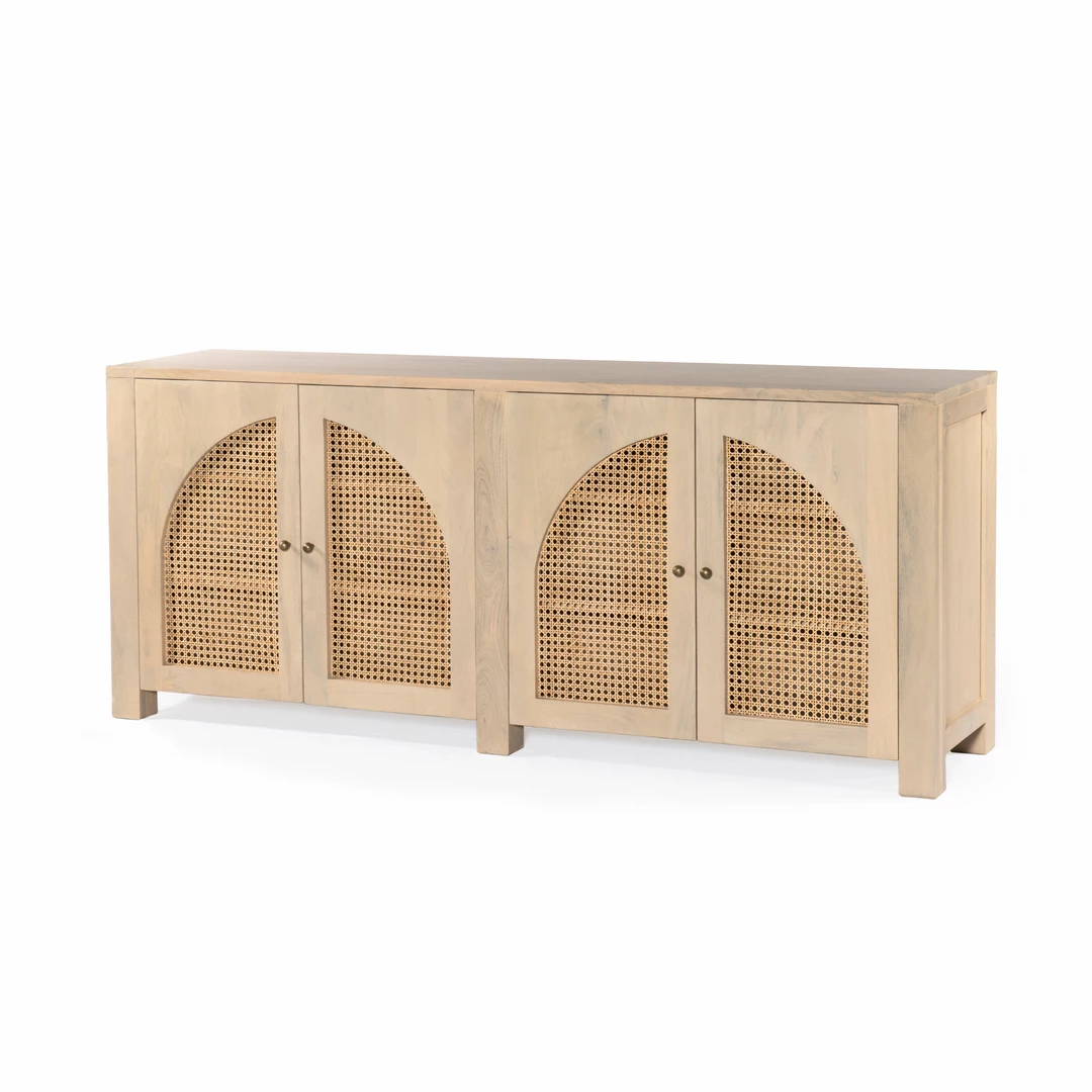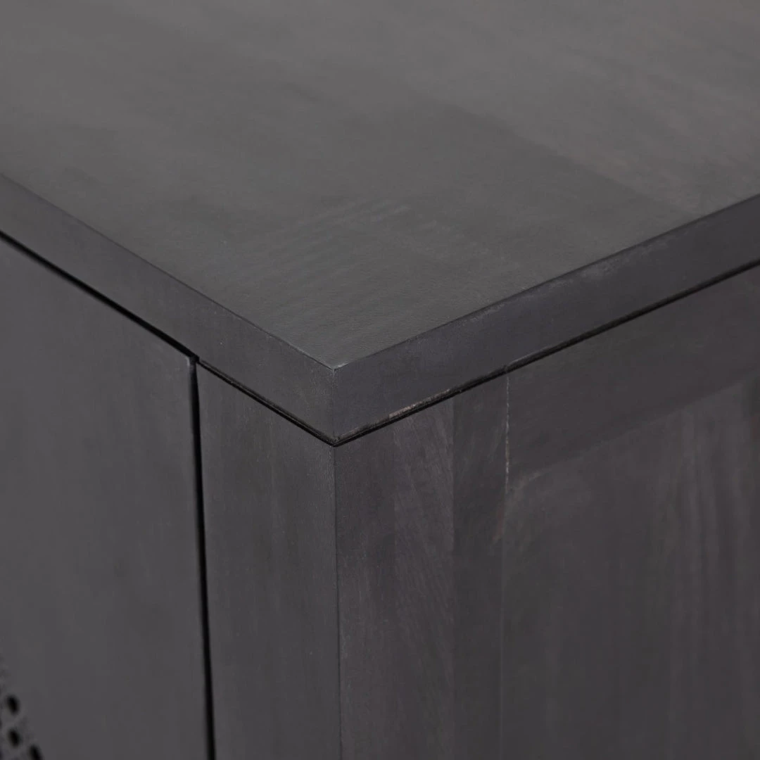 Grand in scale and presence. Black-washed mango encases arched cane door panels featuring black-finished iron hardware, meeting a forward-thinking material mix with monochromatic vibes.