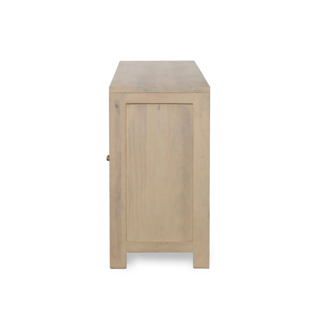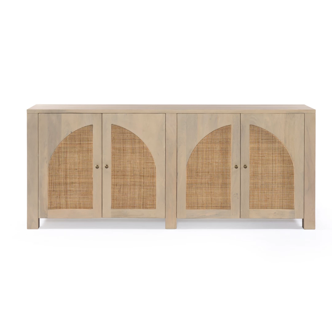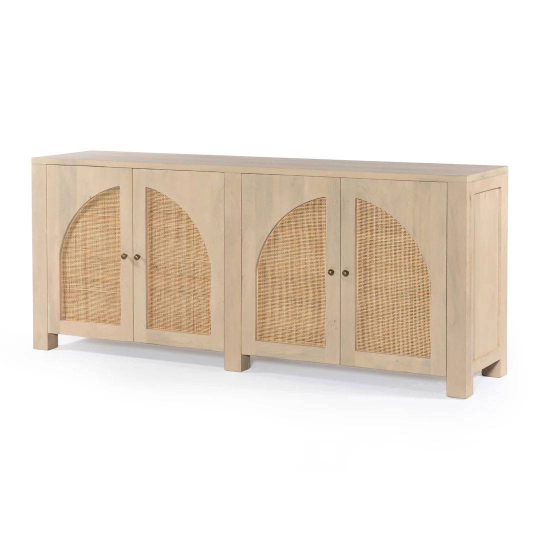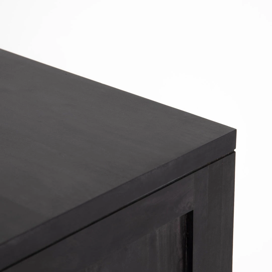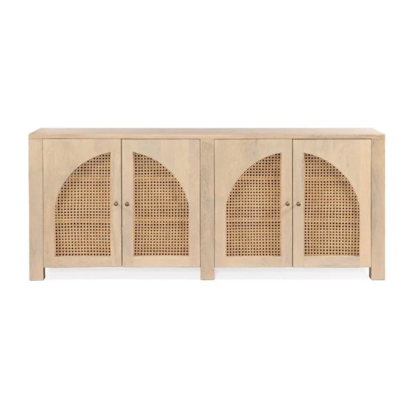 Grand in scale and presence. Black-washed mango encases arched cane door panels featuring black-finished iron hardware, meeting a forward-thinking material mix with monochromatic vibes.