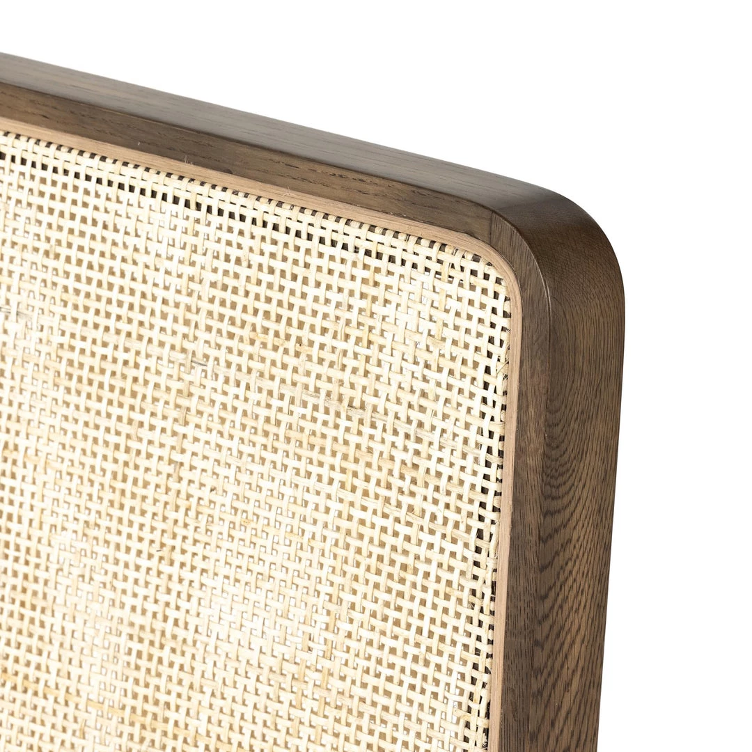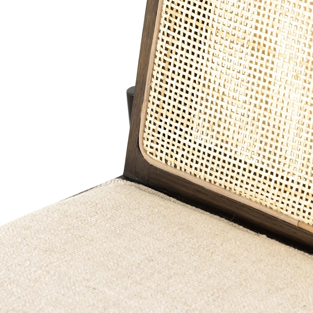 On the menu: mixed materials. Solid oak, natural cane, bronzed iron and Four Hands-exclusive high-performance fabric fuse for a simple look with major impact.