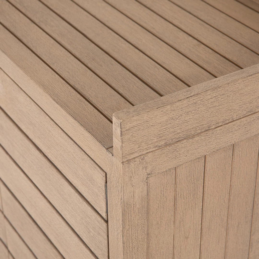 Bring style and storage outdoors. Washed brown-finished teak features slatting for an open, textural look, with cutout openings in place of hardware. Gallery top ready for outdoor entertaining. Cover or store inside during inclement weather and when not in use.