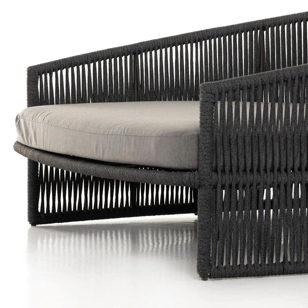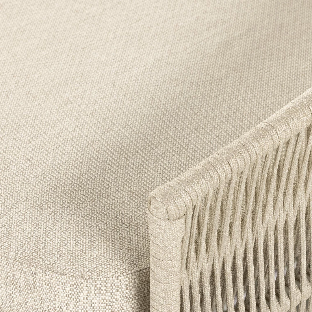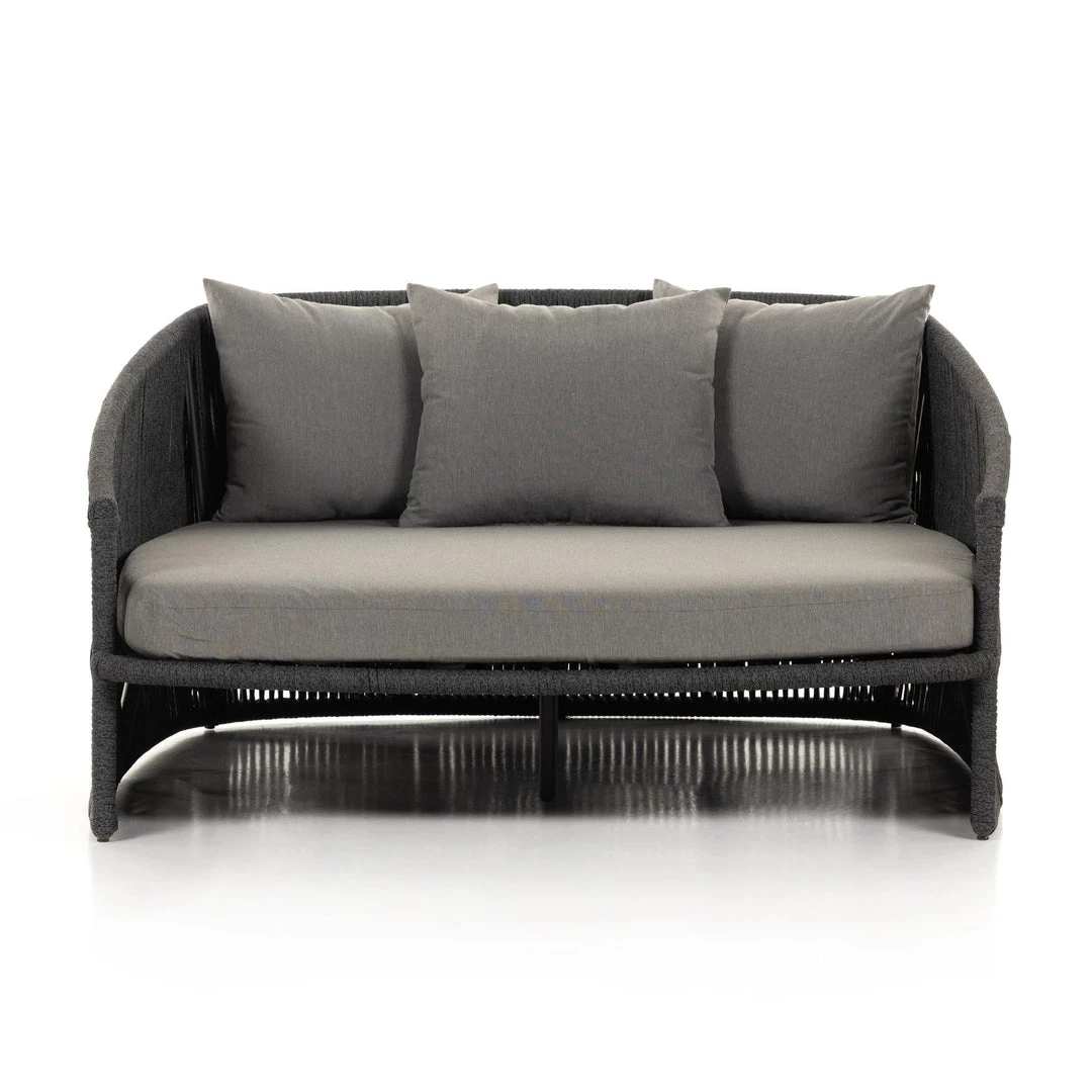 The perfect place for outdoor daydreaming. A beautiful rope-based design is woven across a durable aluminum frame in a rich bronze finish. Topped with a wide cushion and throw pillows, all upholstered in 100% Olefin, known for its UV-resistant, water-repellent and quick-drying abilities. Cover or store inside during inclement weather and when not in use.