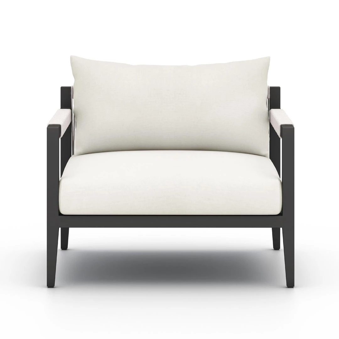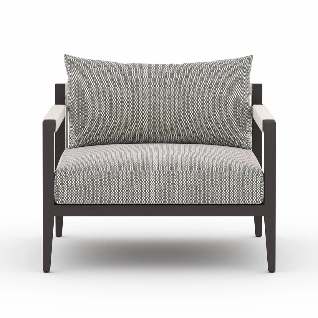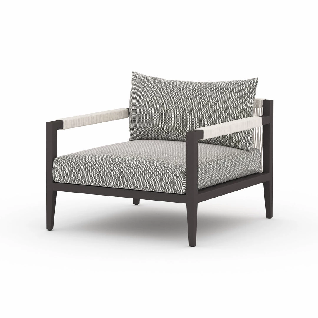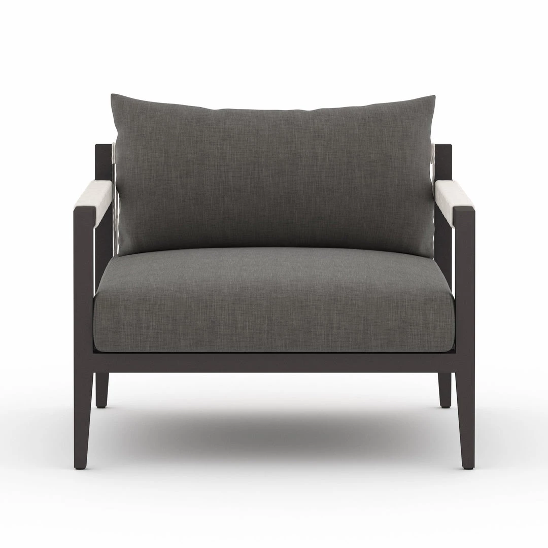 Modern materials ready a stylish silhouette for the outdoors. Sturdy aluminum forms a clean frame for UV-resistant, water-repellent Sunproof fabric on this outdoor chair. Rope-wrapped armrests and rear cotton weaving add a textured finishing touch. Cover or store indoors during inclement weather.